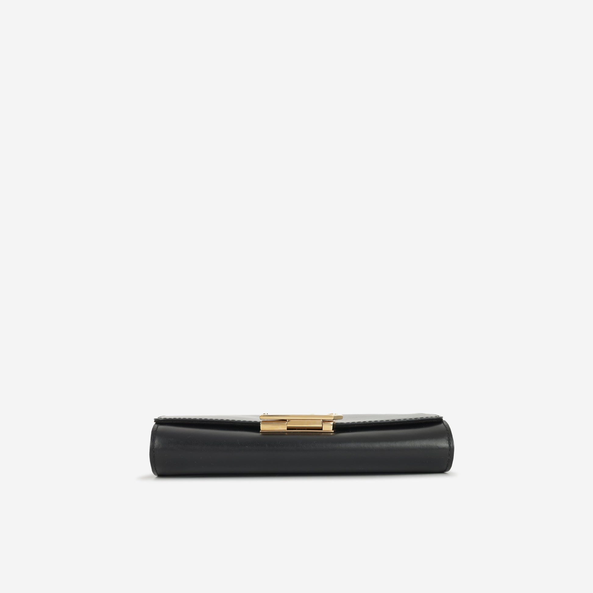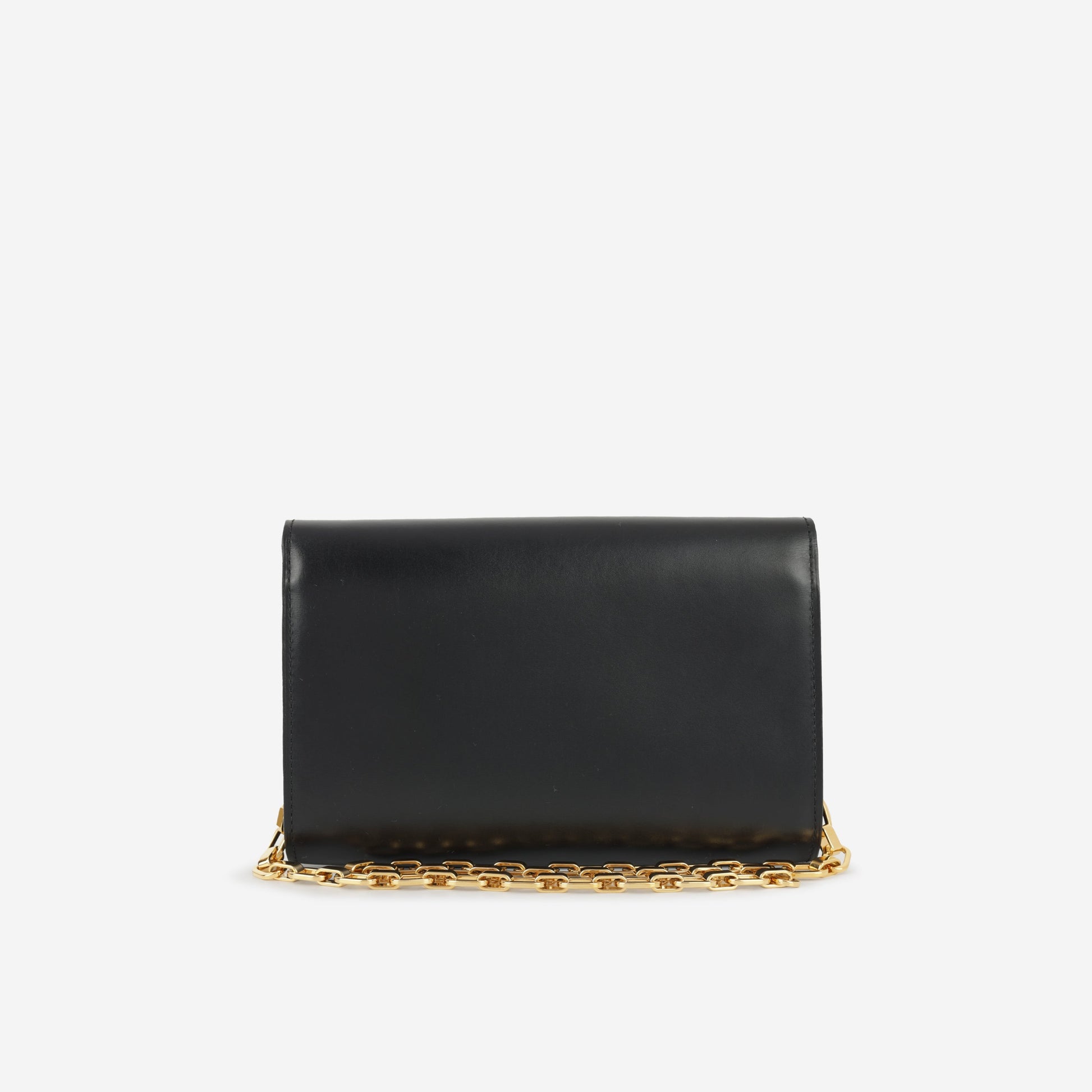 Crafted in smooth black calfskin, this sophisticated piece is the perfect companion for any evening event. Designed to hold all your essentials, it seamlessly blends functionality with timeless elegance. Wear it on its gleaming gold chain for a statement shoulder bag look, or carry it as a chic clutch for understated glamour.