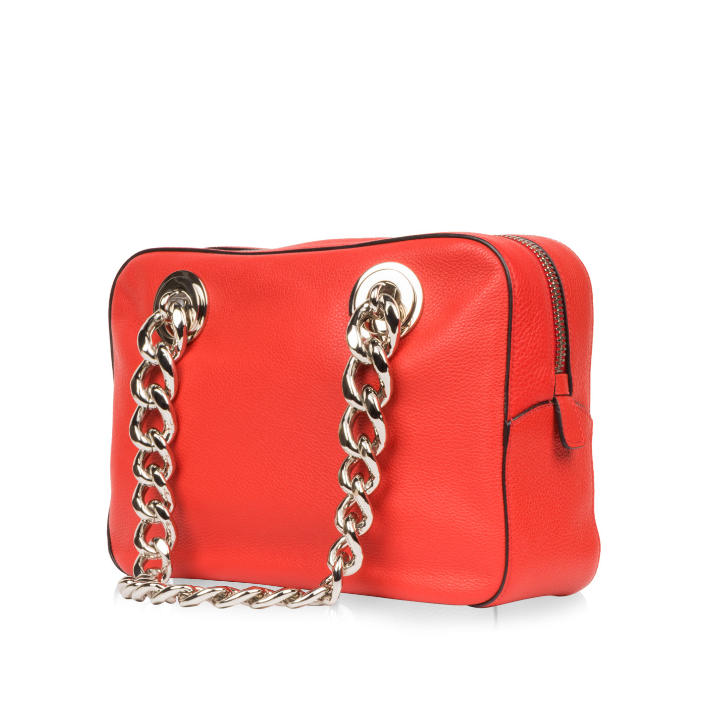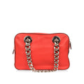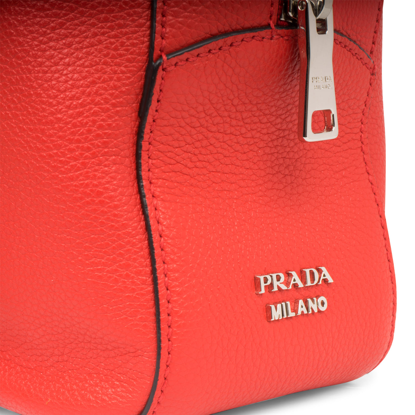 Carefully crafted from red grained leather, this stunning Prada bag featuring prominent silver chain straps is a true must-have. For the woman who isn't afraid to stand out in the crowd, this bright bag is a prime example of "understated statement." Featuring a small Prada logo plaque on the side of the bag, this bag exudes a true "if you know, you know" aesthetic. The perfect compliment to any neutral-toned or monochromatic outfit, this stunning bag is that little pop of colour everyone needs in their life. Hold all your ever day essentials comfortably inside while remaining sleek, stylish and sophisticated. A bag that will remain your every day go-to, this bold Prada is a well-worthy addition to any luxury handbag collection.