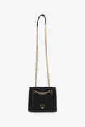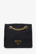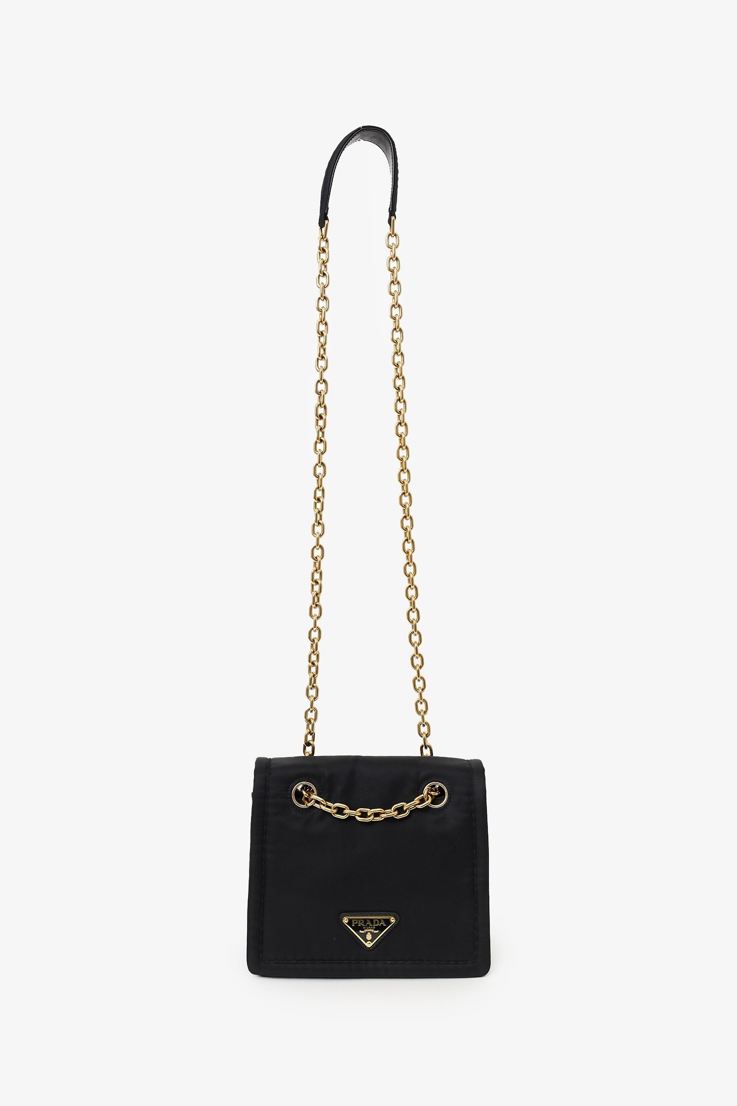 Prada Black Nylon Chain Shoulder Bag. Front fold-over flap with magnetic snap-button closure. Twin chainlink strap that can be pulled into one long strap. Lined interior. Single interior slip pocket. Gold-tone hardware. Tonal stitching.