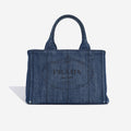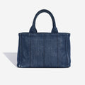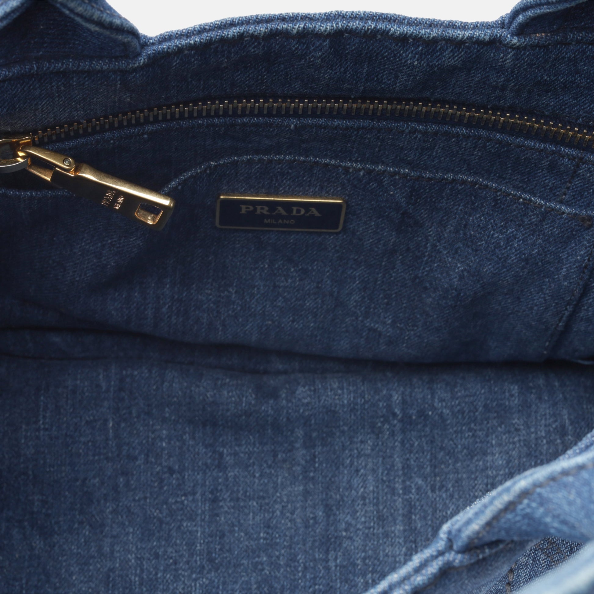 The Prada denim tote is a modern tote bag inspired by a vintage gardener's bag. The faint silk-screen logo on the front offers a discrete take on this casual Prada style.