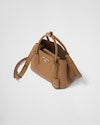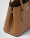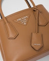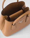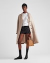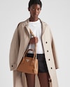 Delicate, refined details give new life to iconic styles of the brand like the Prada Double handbag: a versatile and sophisticated new mini version. The tonal leather triangle frames the iconic metal lettering logo that embellishes the front, while the detachable shoulder strap lets the bag be worn also as a cross-body or shoulder bag.