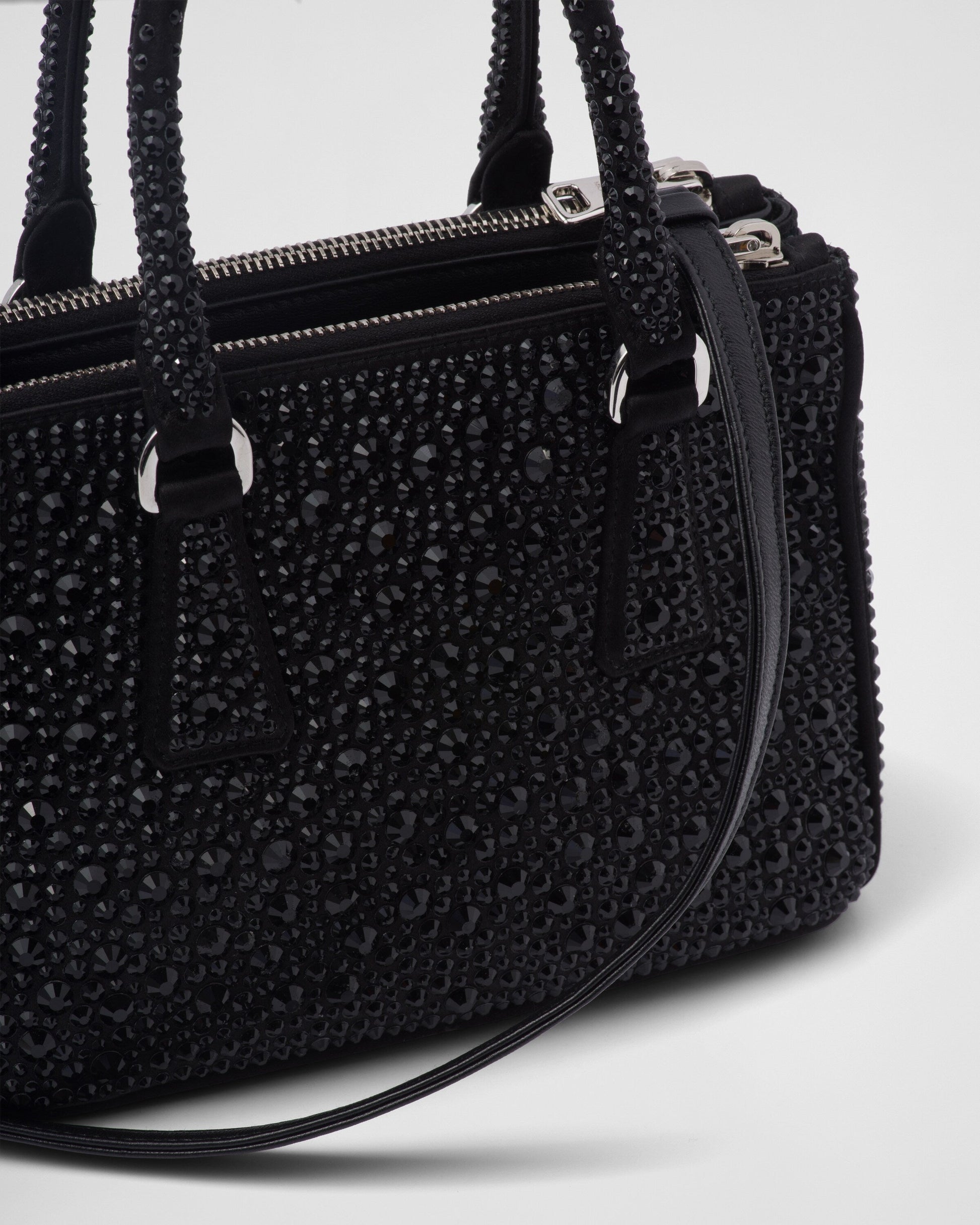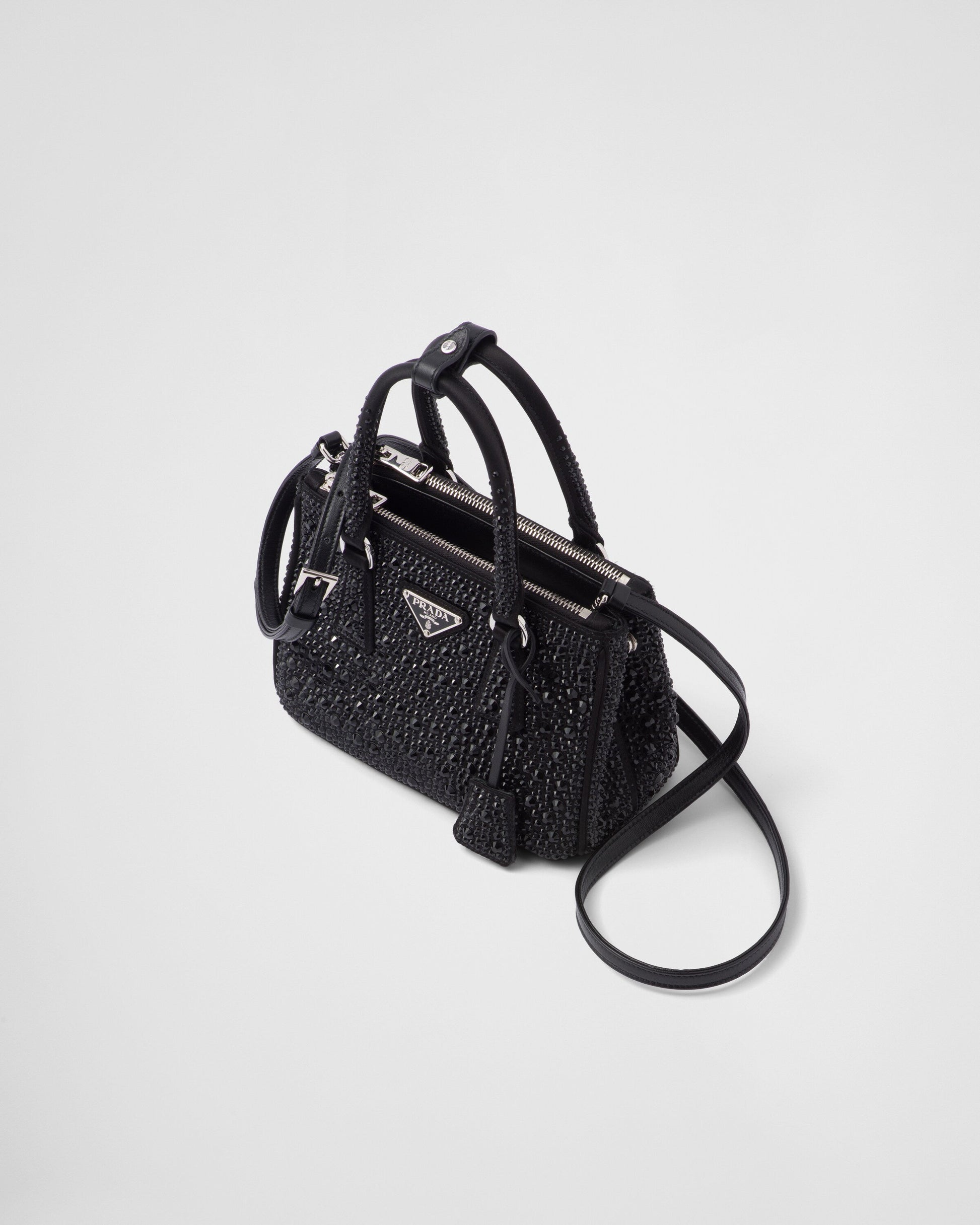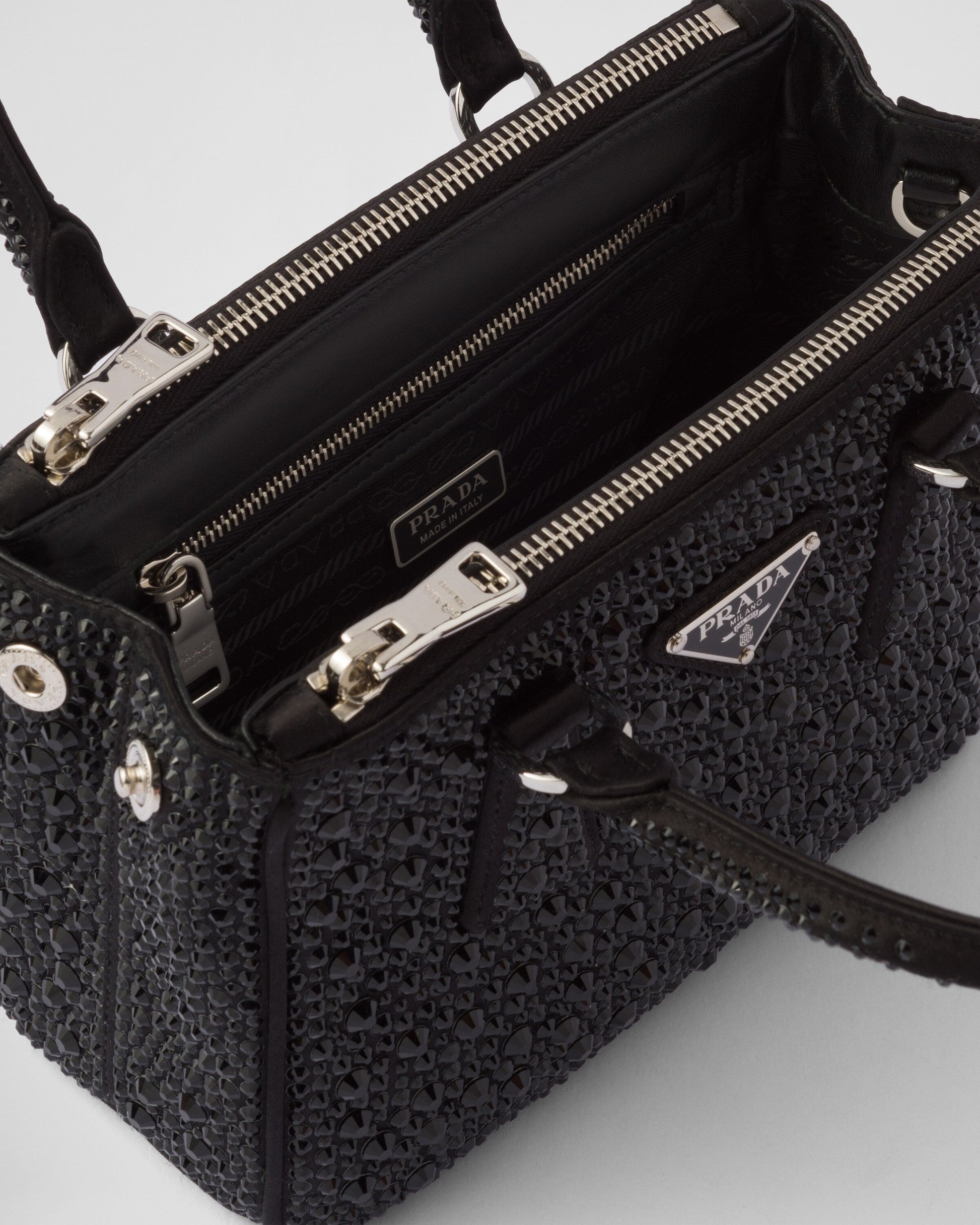 A surface of dazzling crystals in various sizes creates a precious play of sparkles and glimmers on this Prada Galleria bag, recalling the jewelry world. The accessory, which exemplifies the centennial excellence of Prada in luxury leather goods, becomes a reflection of the brand's modernity and stylistic identity that seeks to interpret kaleidoscopic contemporaneity through a pragmatic design and structured lines. Presented in a mini version, the bag is made of fine silk satin. The Prada Galleria bag, named after the historic Prada store opened by Mario Prada in 1913 in Galleria Vittorio Emanuele II in Milan, expresses the quintessence of the brand's timeless elegance.