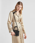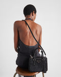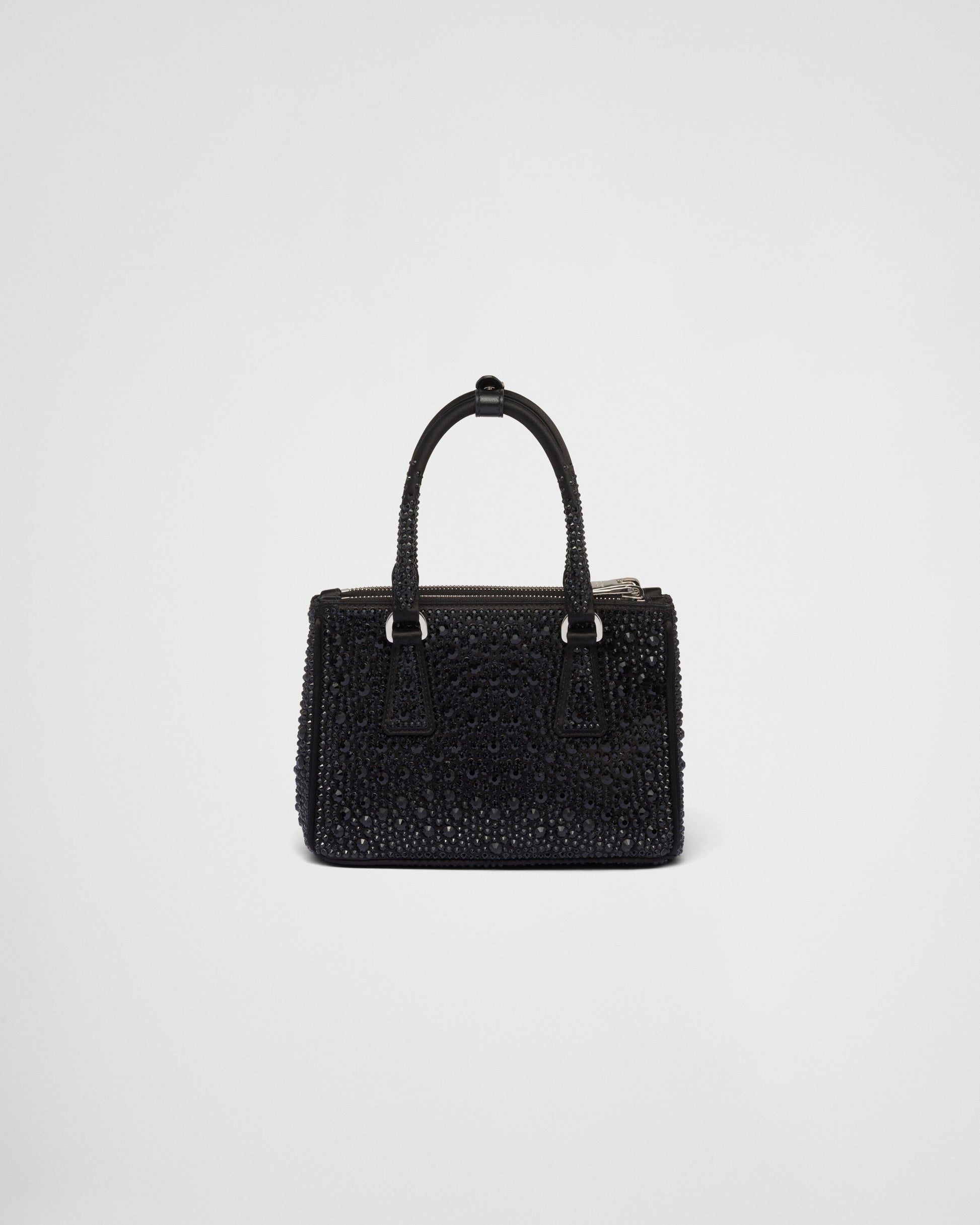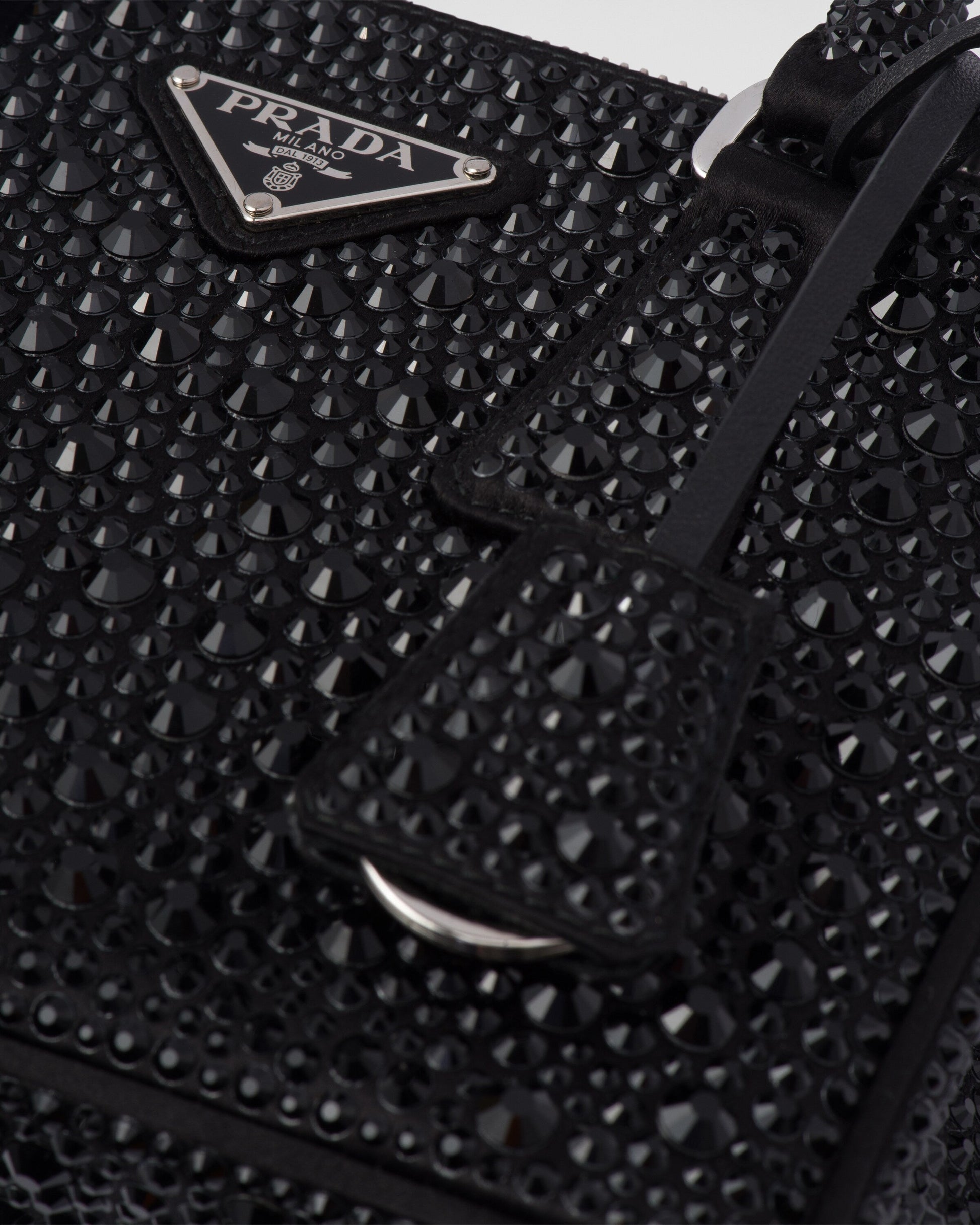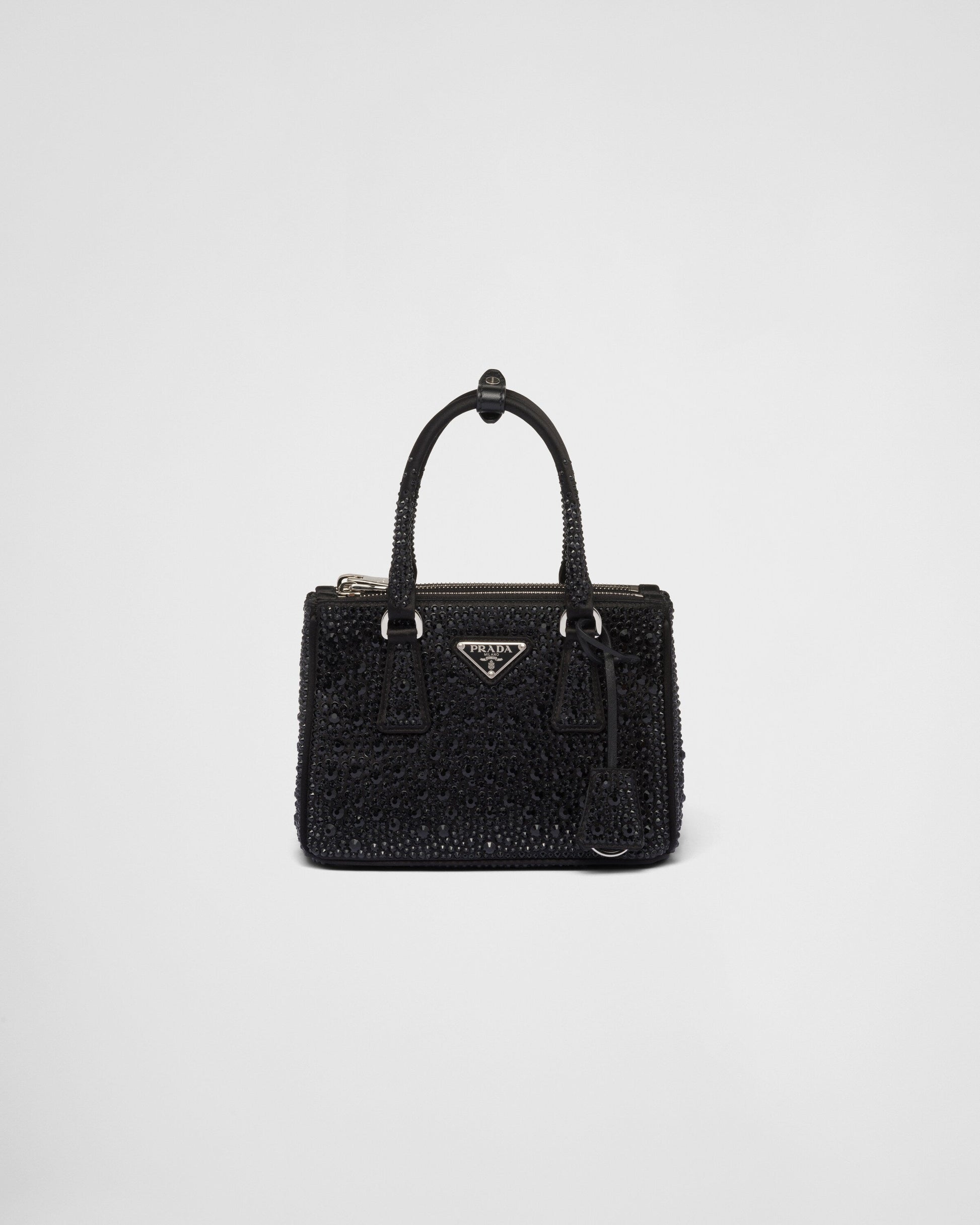 A surface of dazzling crystals in various sizes creates a precious play of sparkles and glimmers on this Prada Galleria bag, recalling the jewelry world. The accessory, which exemplifies the centennial excellence of Prada in luxury leather goods, becomes a reflection of the brand's modernity and stylistic identity that seeks to interpret kaleidoscopic contemporaneity through a pragmatic design and structured lines. Presented in a mini version, the bag is made of fine silk satin. The Prada Galleria bag, named after the historic Prada store opened by Mario Prada in 1913 in Galleria Vittorio Emanuele II in Milan, expresses the quintessence of the brand's timeless elegance.