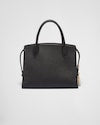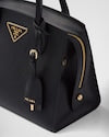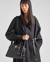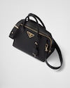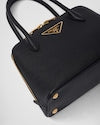 Classic elegance characterizes this mini handbag that combines Saffiano leather and smooth leather details for a refined contrast in textures. The metal lettering logo framed by the brand's emblematic leather triangle decorates the front. Saffiano leather, an iconic Prada material, is synonymous with luxury and identified with traditional Italian leather-goods production: a very high quality leather, it is defined by a crosshatch texture and waxed finish.