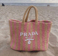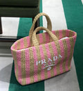 Prada Large Raffia Striped Tote Bag (Tan/Pink)