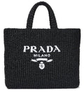 This Prada Tote Bag is a summer essential made of raffia. A maxi version of Prada's iconic lettering logo embroidered on the front enhances the accessory.