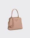 The Prada Matinée bag is defined by its soft lines. The accessory with shoulder strap and name tag evokes modern femininity and is made of Saffiano leather, an iconic material of the brand characterized by the crosshatch motif and waxed finish. The triangle logo, first introduced on the trunks designed by Mario Prada, decorates the front.