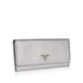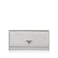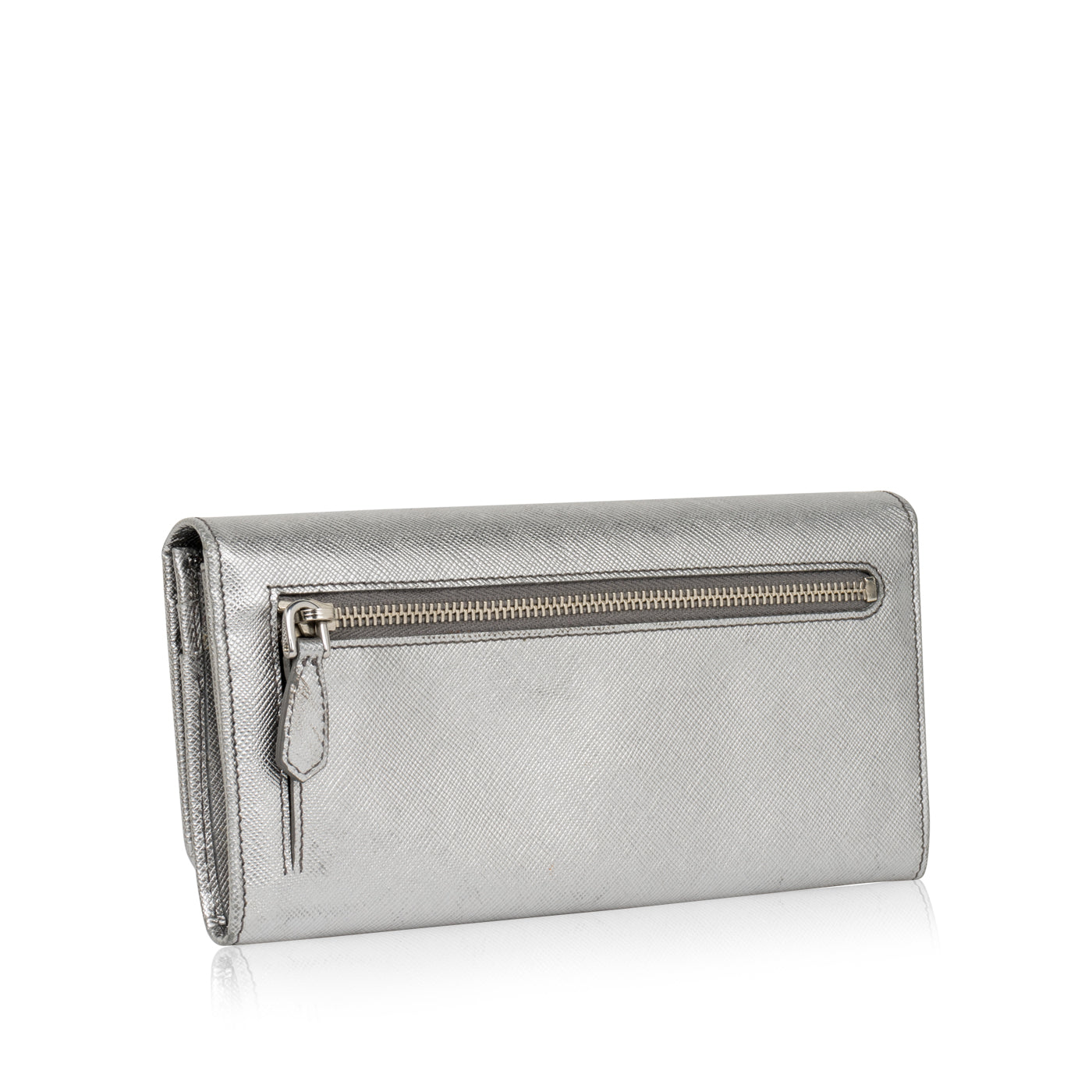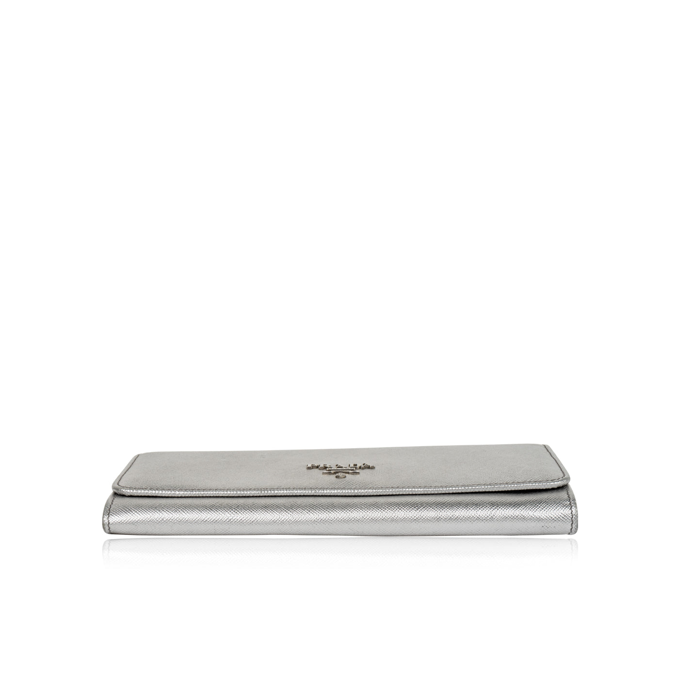 Since its very foundation in 1913, the Milanese fashion house that is Prada has developed a reputation for their dedication to quality, style and unquestionable class; and the Prada Saffiano Fold-Over Wallet is no stranger to these concepts. Crafted in Italy from Prada’s signature Saffiano leather, this folder-over wallet channels a wow factor through its silver colour. The wallet features a snap closure and a front logo plaque in exquisite silver hardware. Its interior features an array of storage compartments and is lined in a combination of leather and fabric.