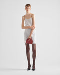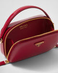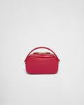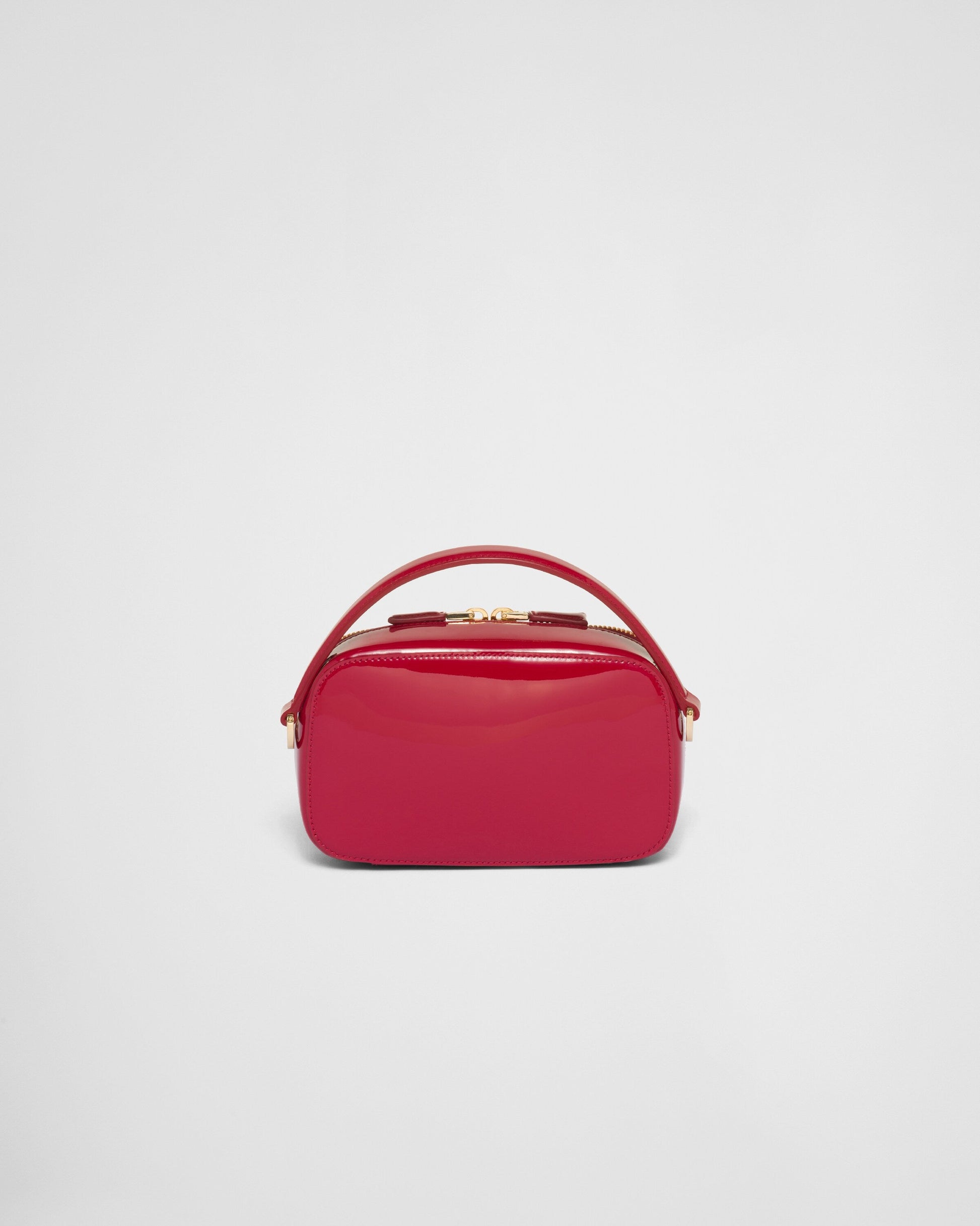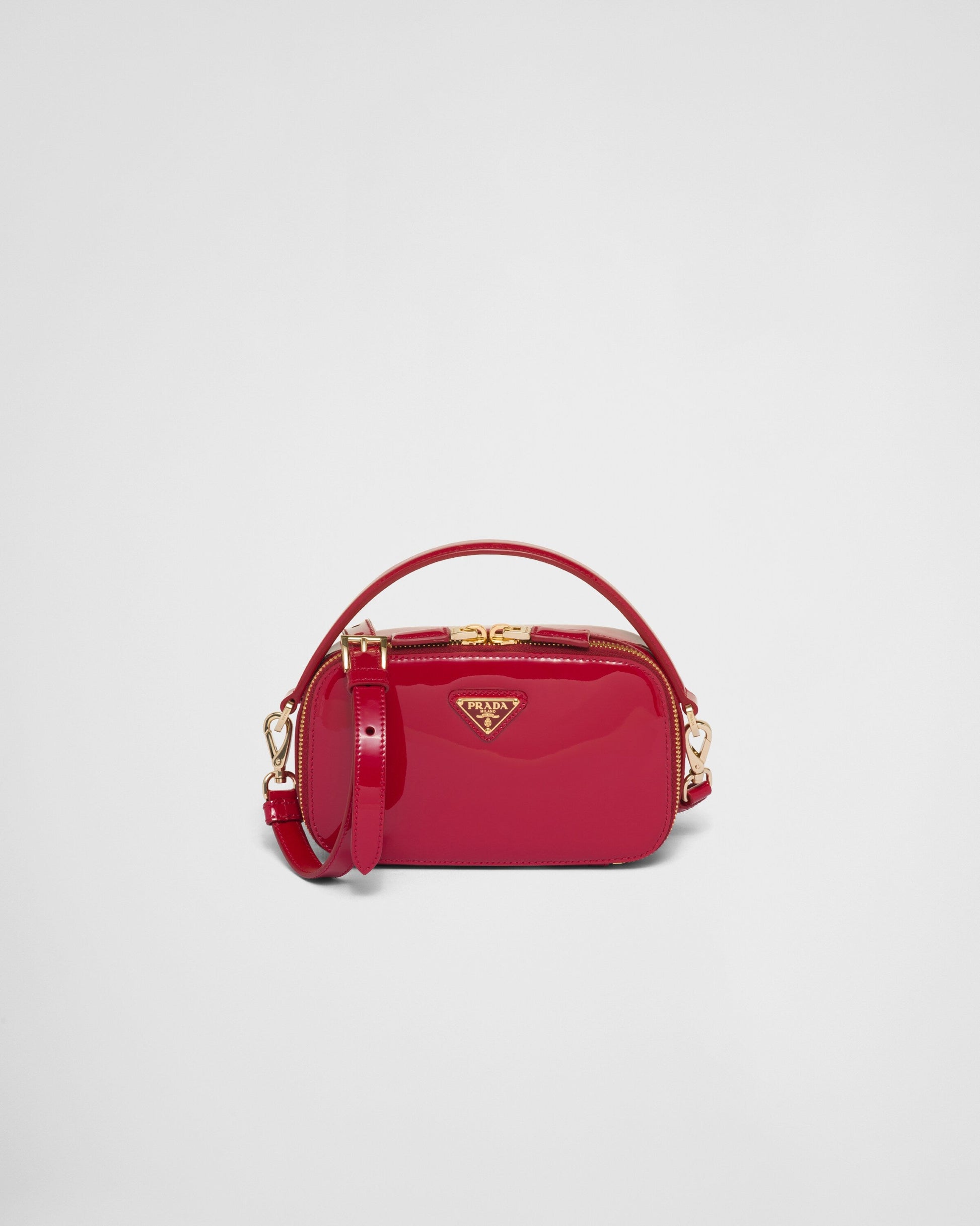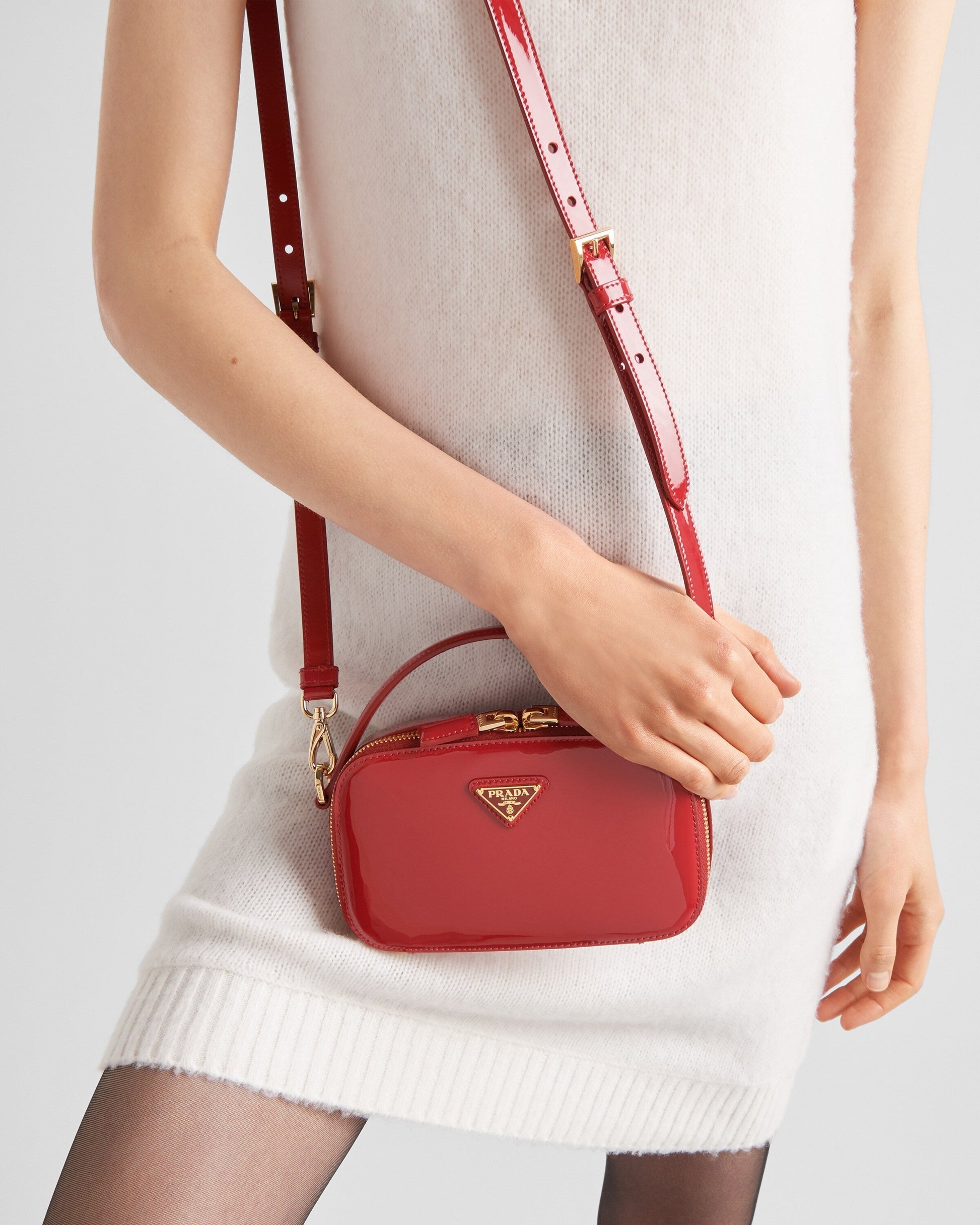 Sleek, elegant lines create this patent-leather mini-bag with a sophisticated character. The versatile, structured design, carried by hand or worn over the shoulder with the removable strap, is completed with a two-way zipper closure and embellished with the enameled metal triangle logo.