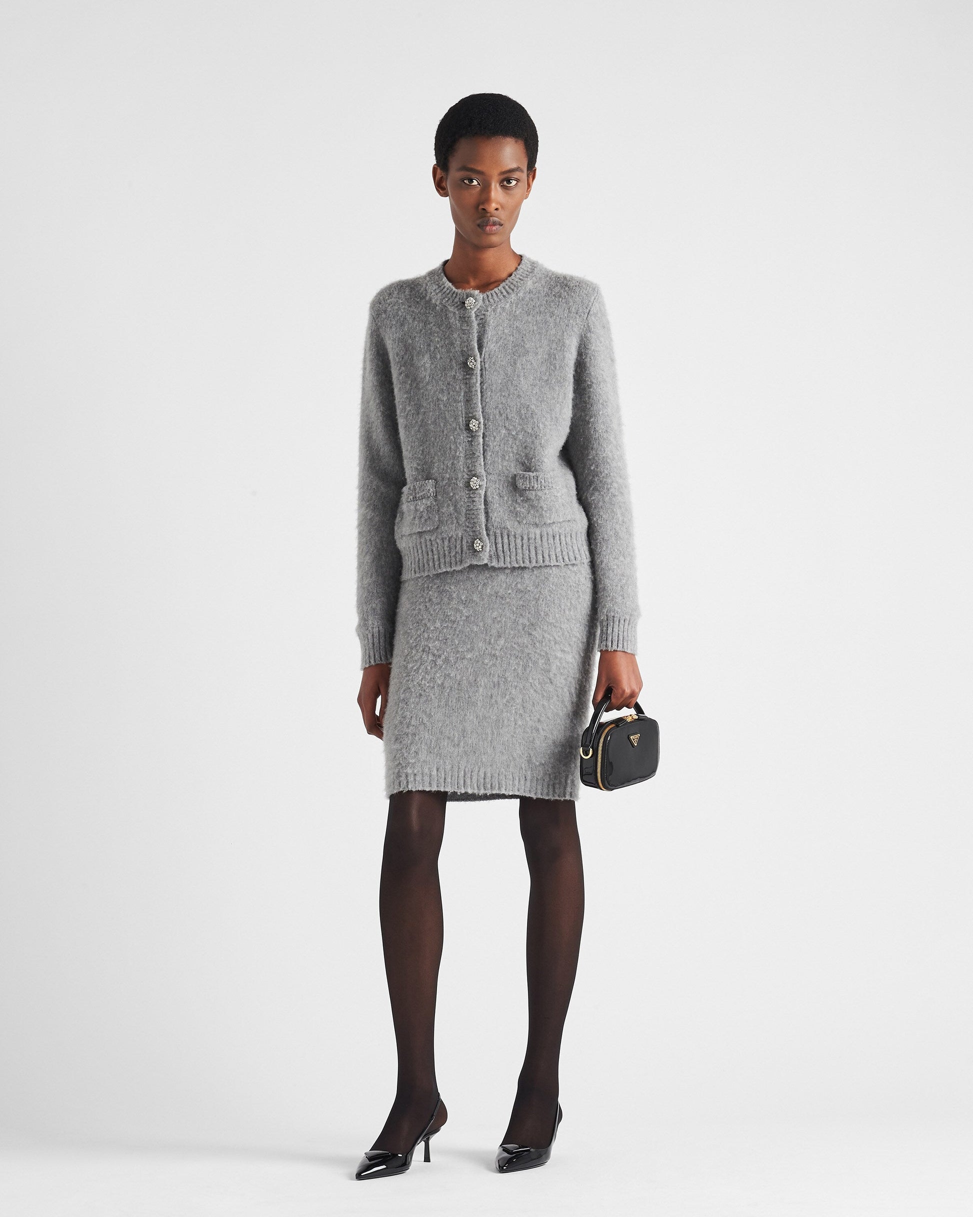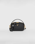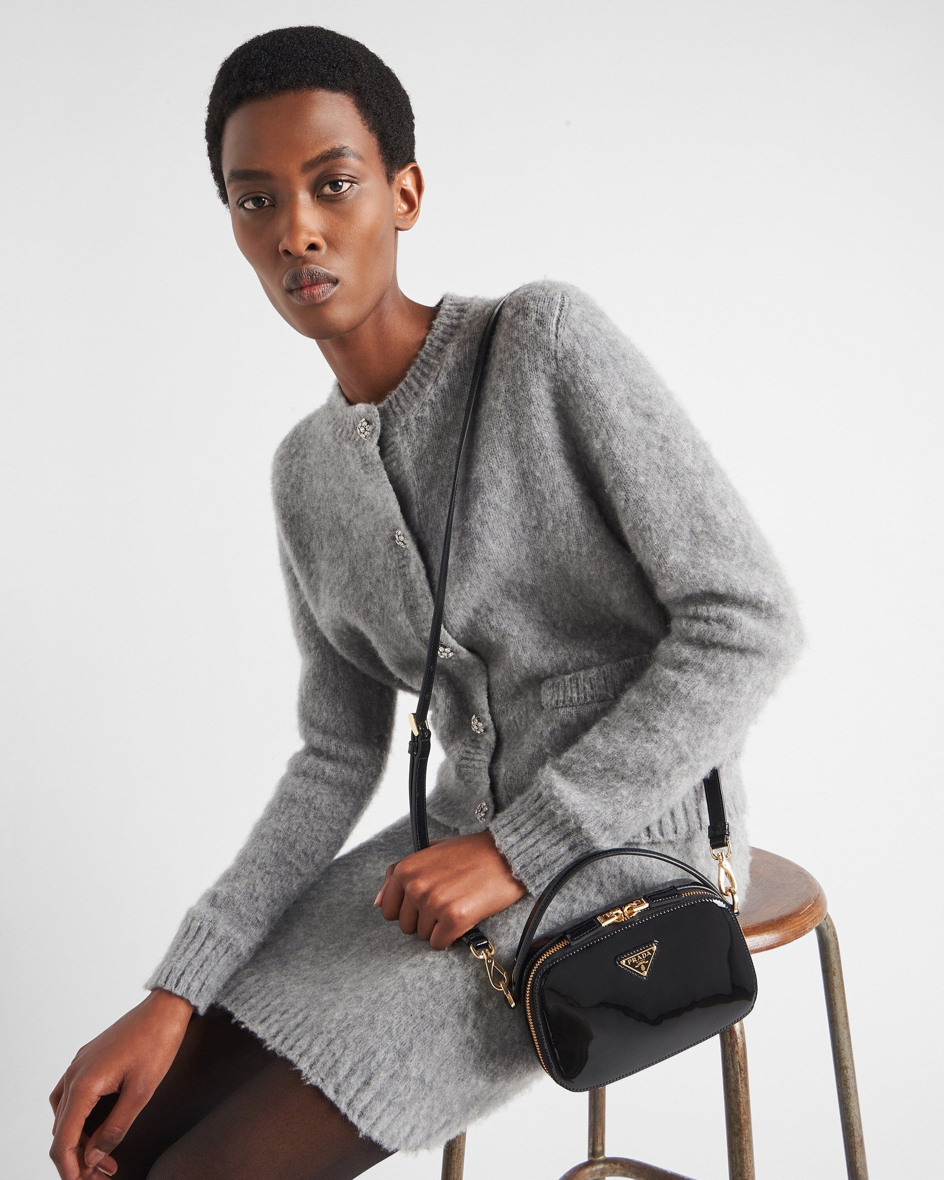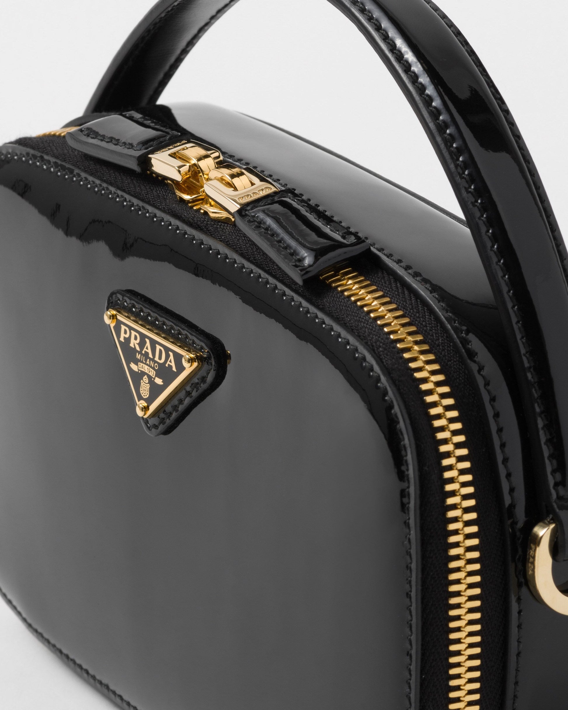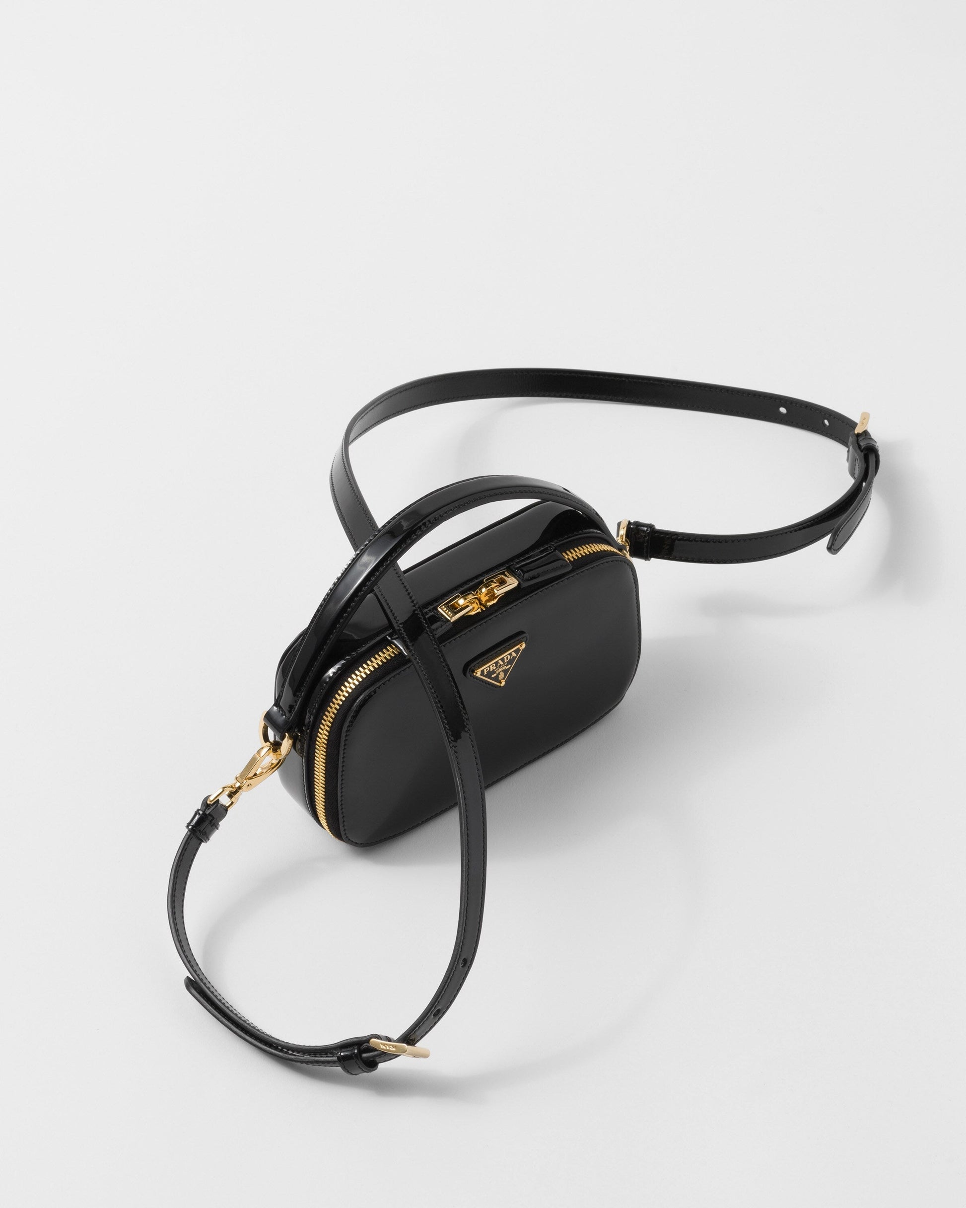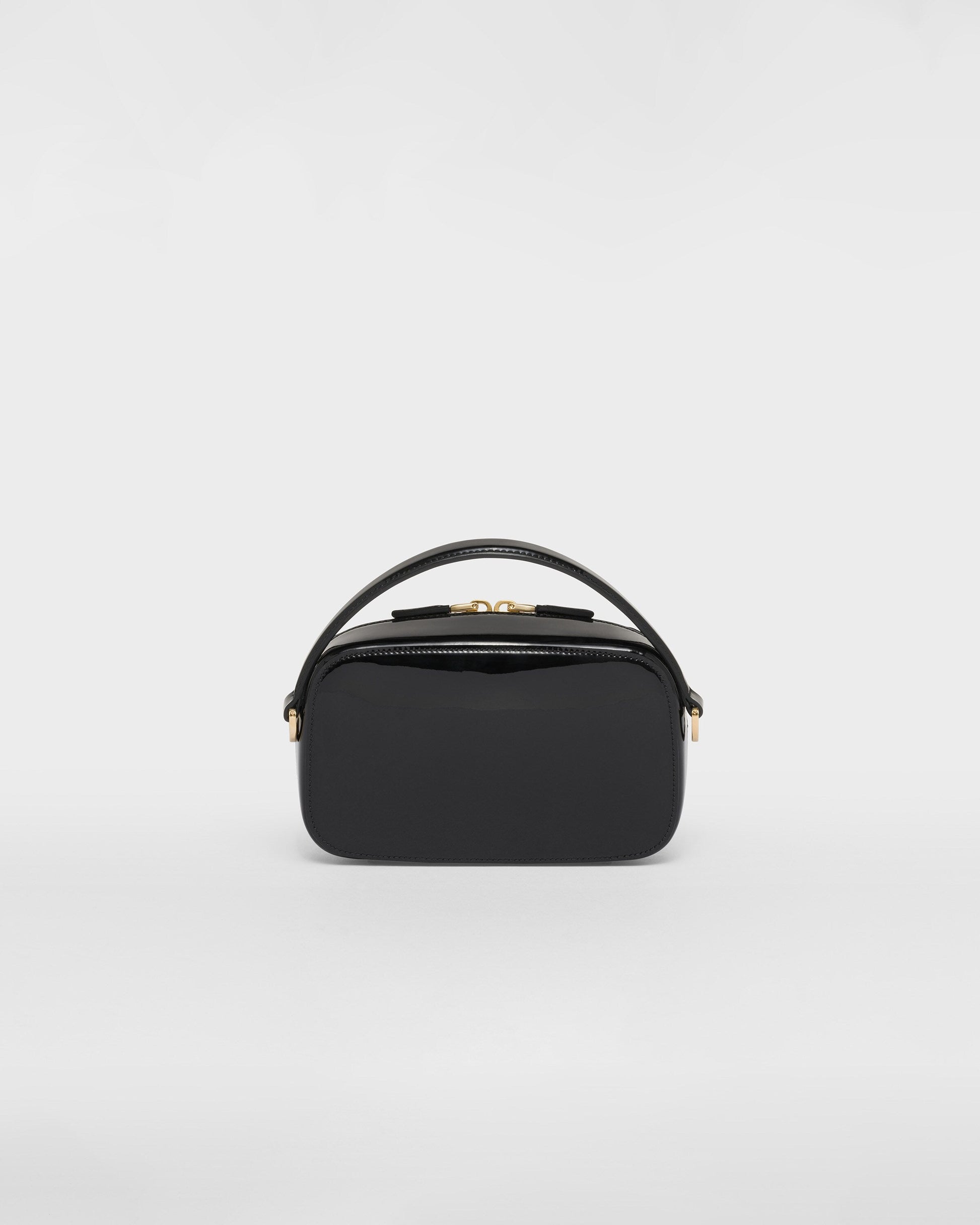 Sleek, elegant lines create this patent-leather mini-bag with a sophisticated character. The versatile, structured design, carried by hand or worn over the shoulder with the removable strap, is completed with a two-way zipper closure and embellished with the enameled metal triangle logo.