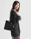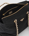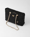 A re-edition of an iconic style of 1995, this shoulder bag summarizes Prada codes in a casual, versatile silhouette that establishes a dialog between stylistic languages of past and present. The design with soft volumes is made of Re-Nylon, the innovative regenerated nylon yarn, defined by iconic stitching that reveals a geometric pattern. The leather and metal chain handles complete the accessory with vintage charm, decorated with the enameled metal triangle logo.