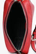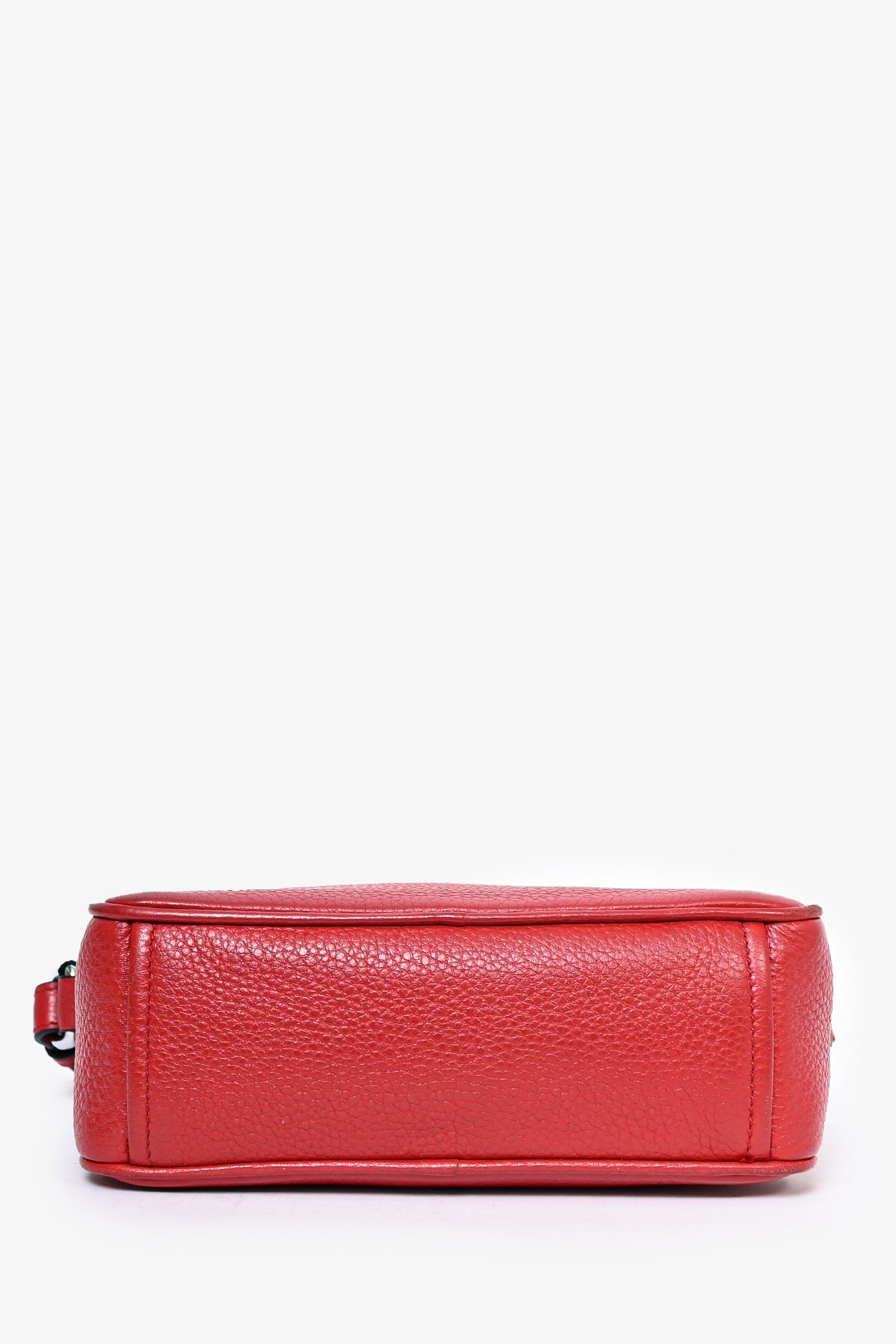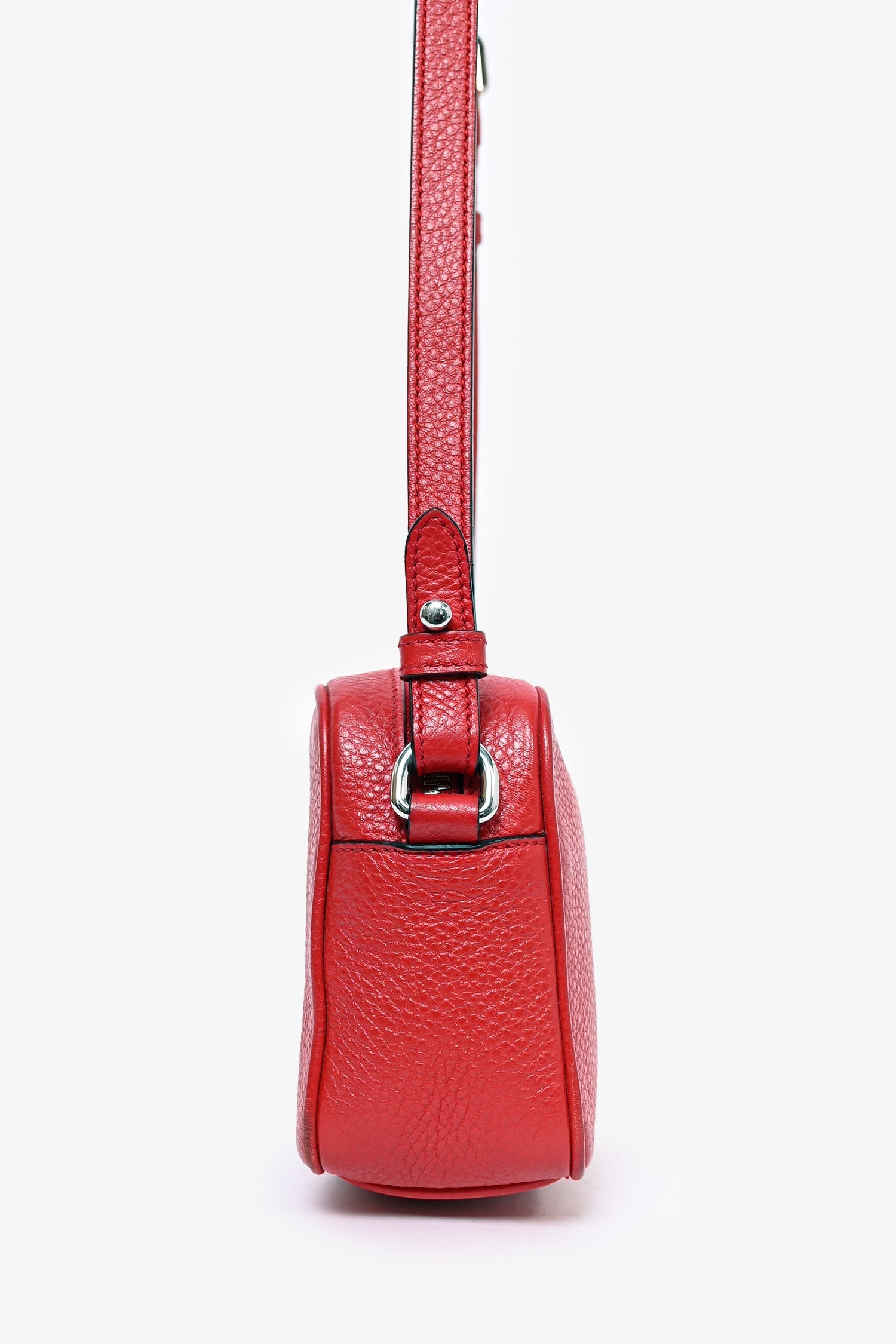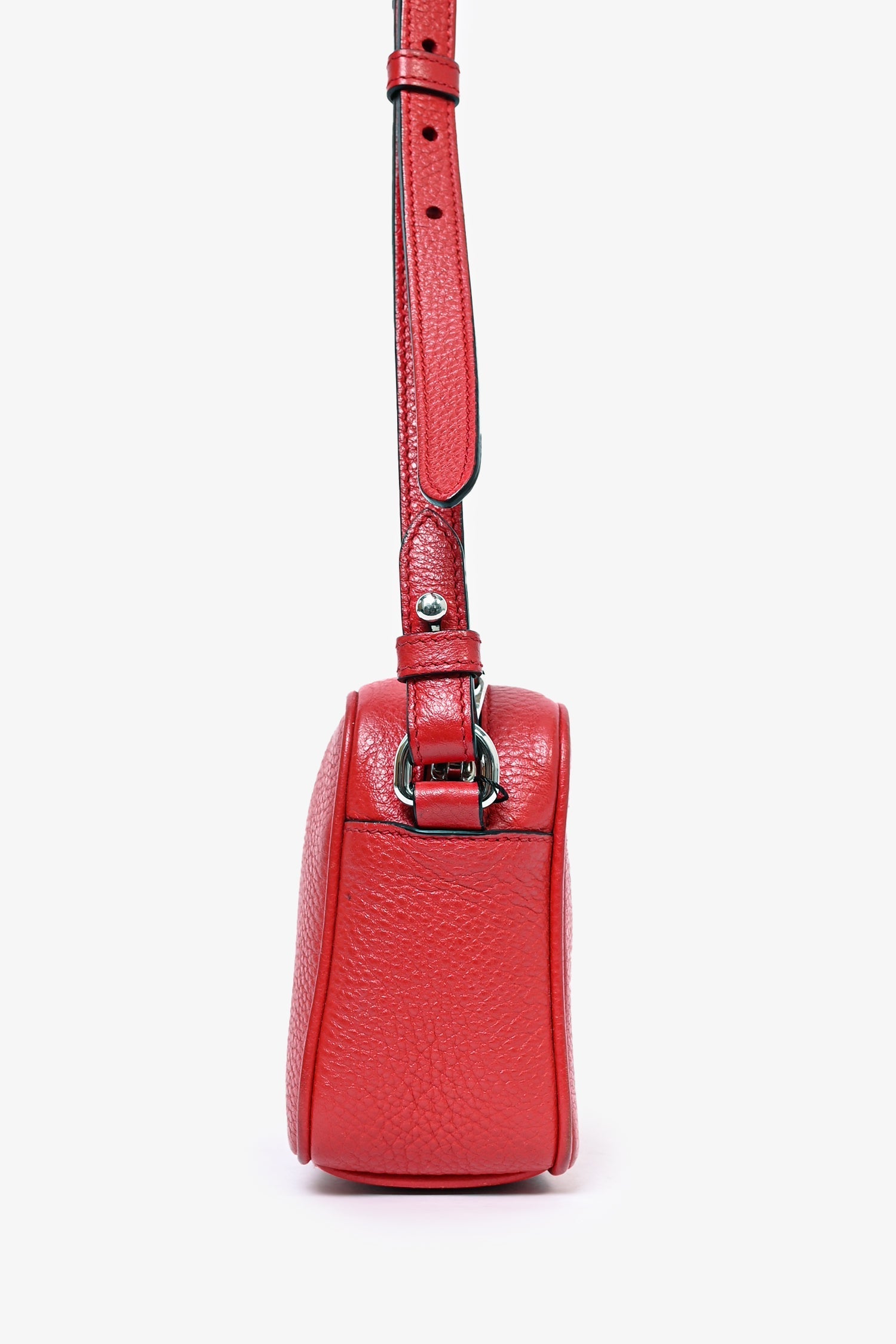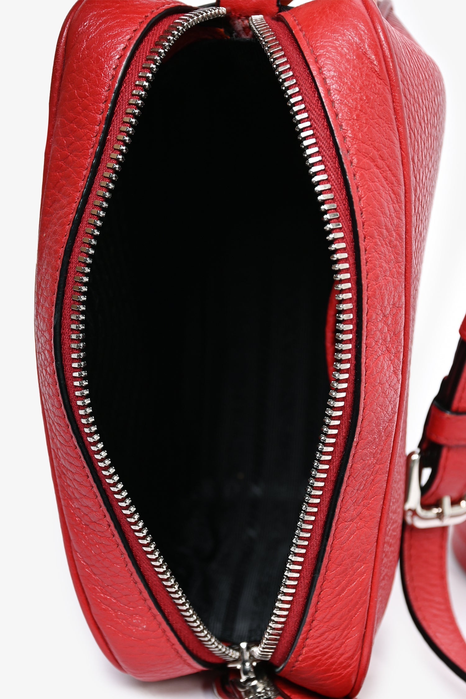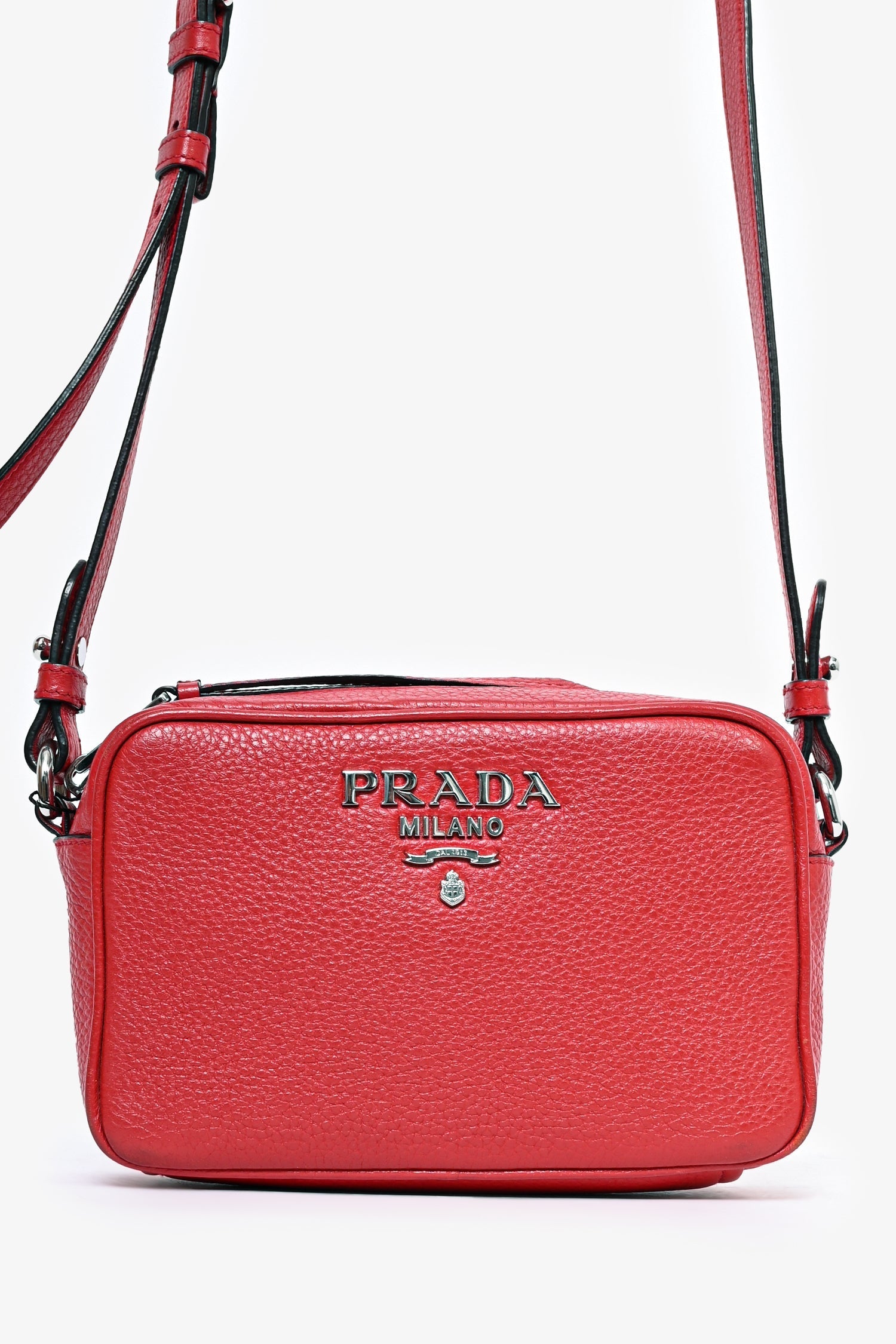 Prada Red Leather Phenix Crossbody Camera Bag. Top zip closure. Black textile interior logo'd lining. Single interior wall slip pocket. Adjustable strap. Silver-tone hardware.
