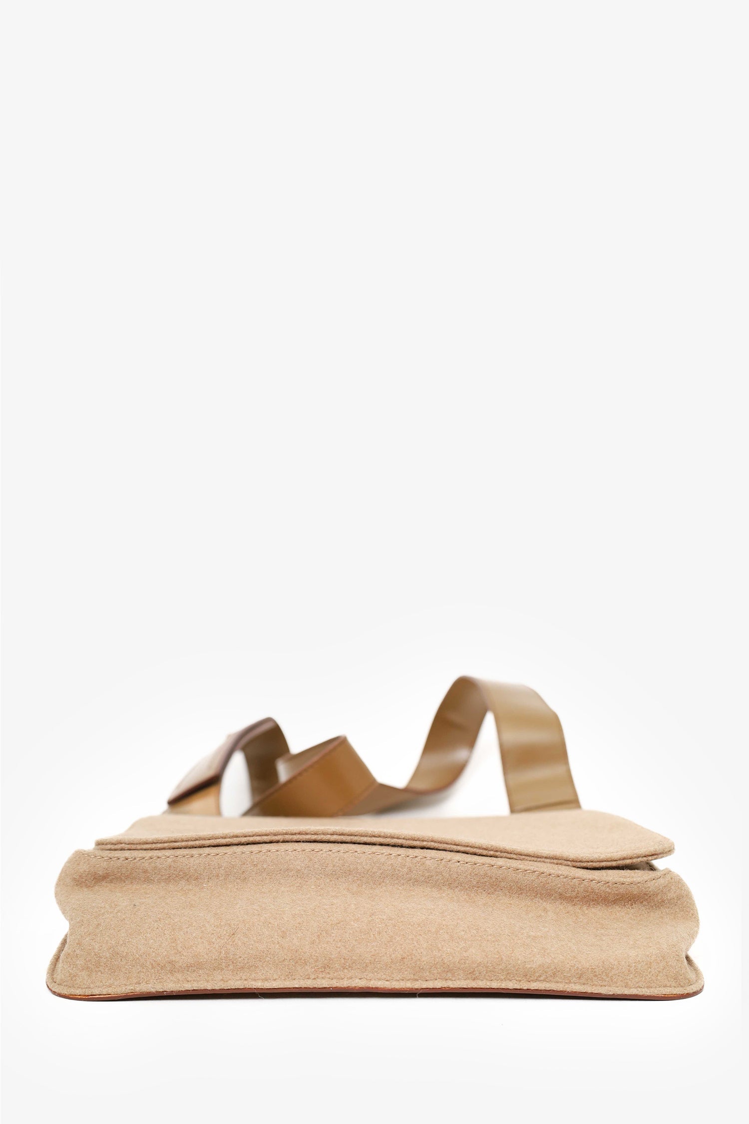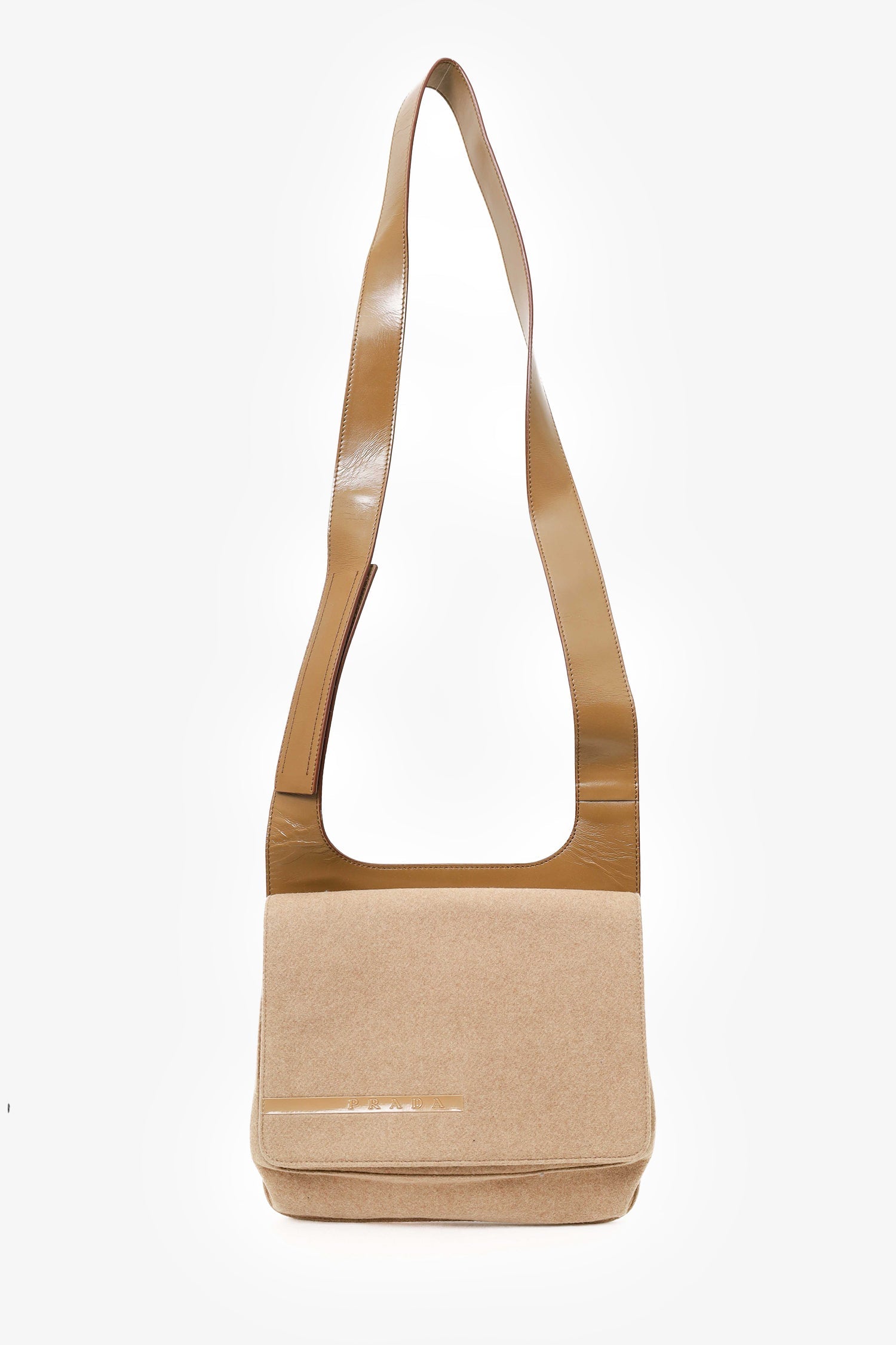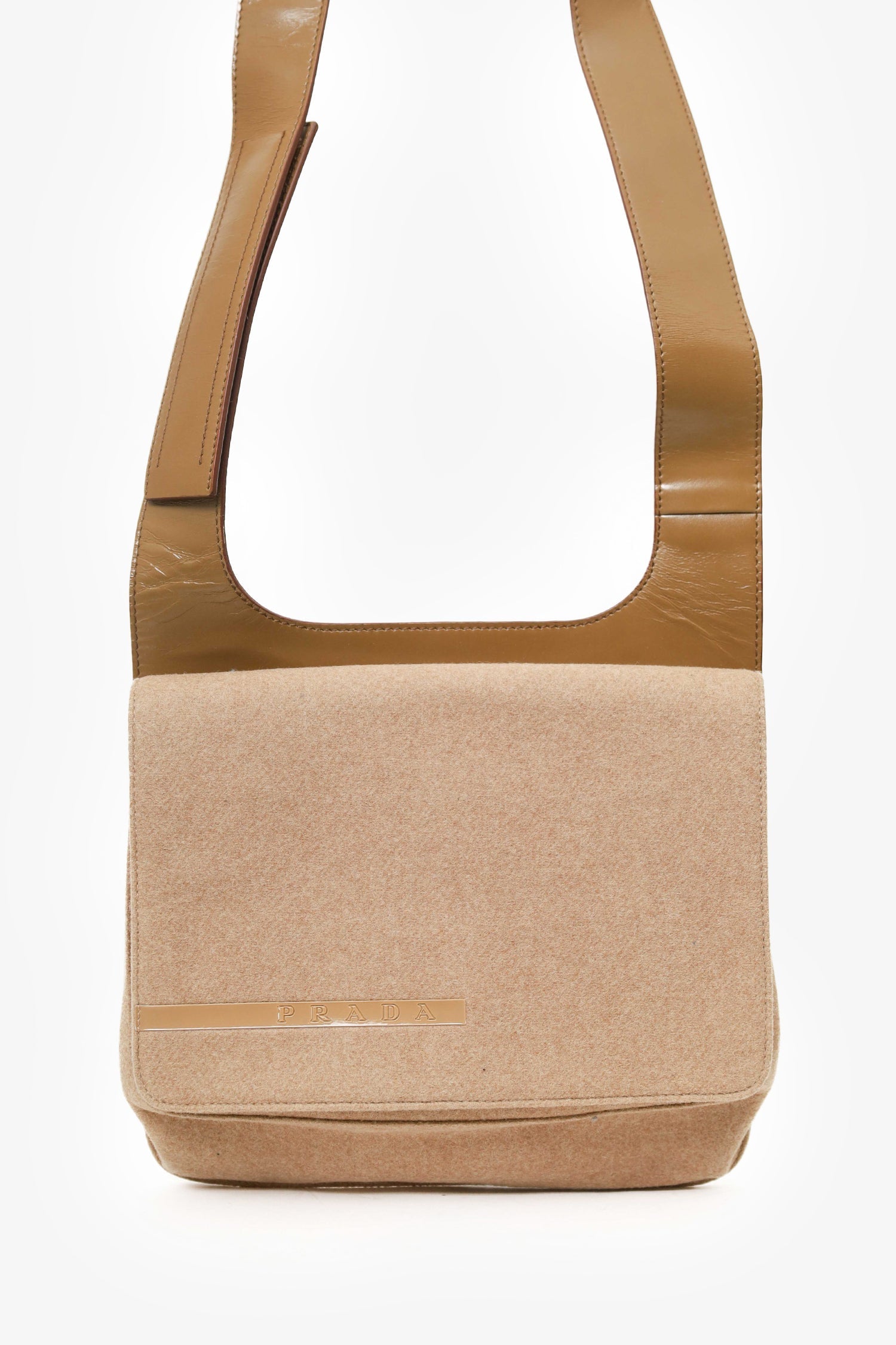 Prada Sport Beige Wool Flap Shoulder Bag. Fold-over flap velcro closure. Interior wall slip pocket. Tonal stitching.