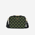 The geometric design creates a modern pattern using contrasting colours. Featuring a re-nylon lining and an adjustable shoulder strap.