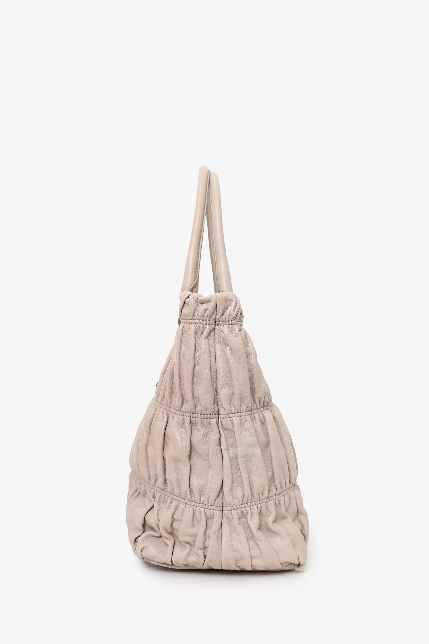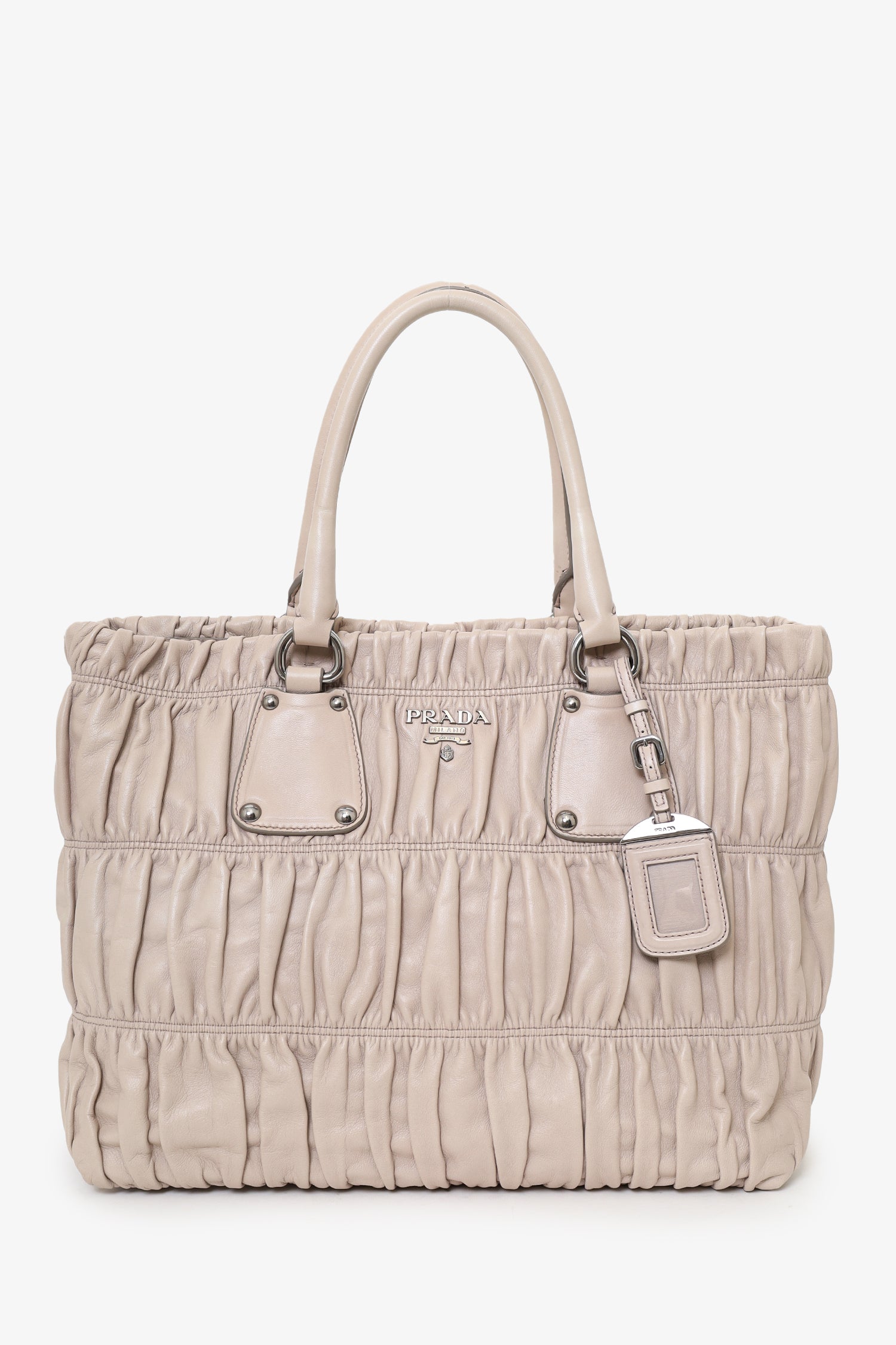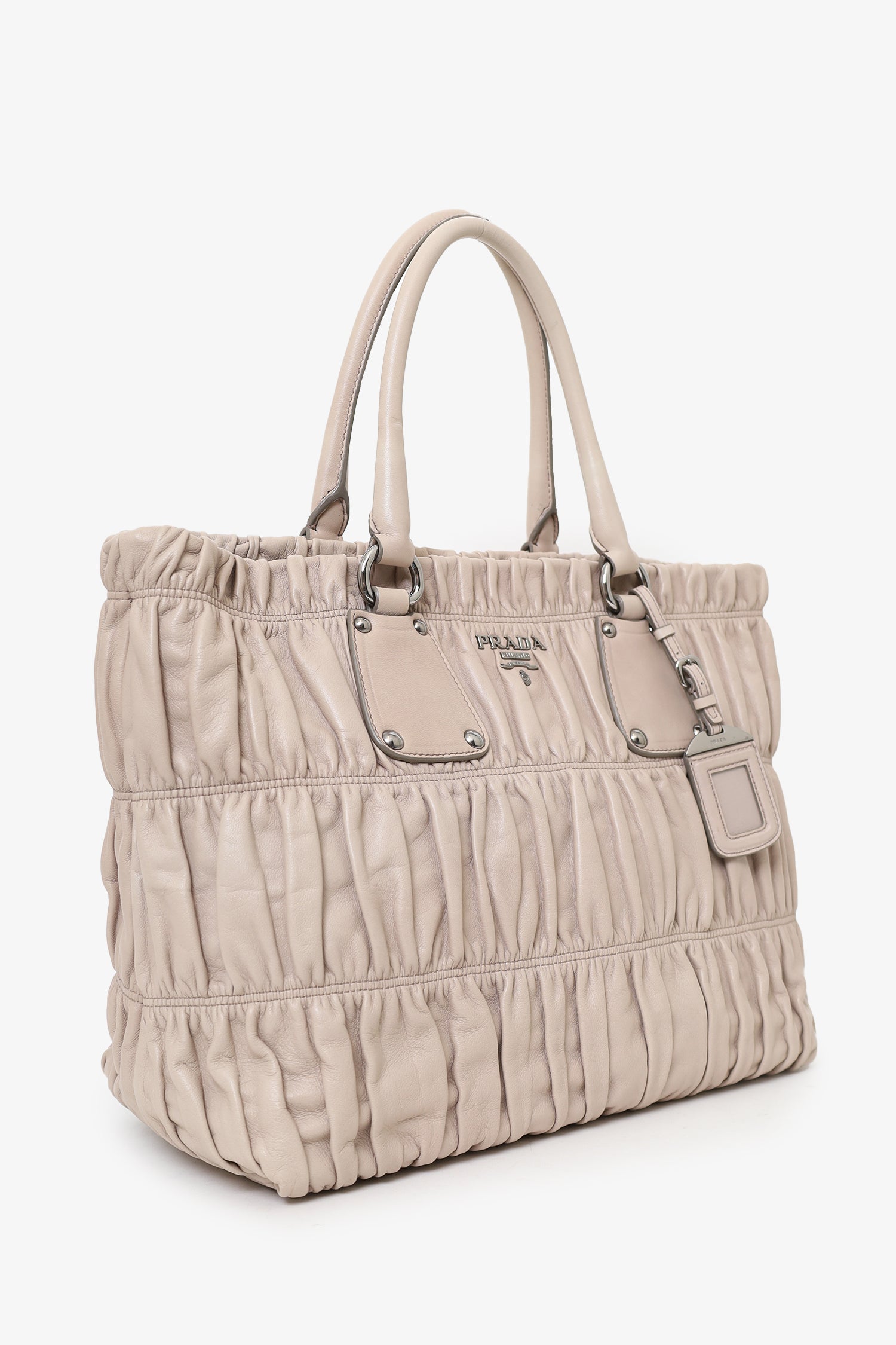 Prada Taupe Nappa Gaufre Leather Shoulder Bag. Top magnetic snap-button closure. Twin handles. Removable strap with adjustable buckle closure. Lined interior. 4 interior pockets; 3 slip and 1 zip. Protective studs on bottom. Silver-tone hardware. Tonal stitching.