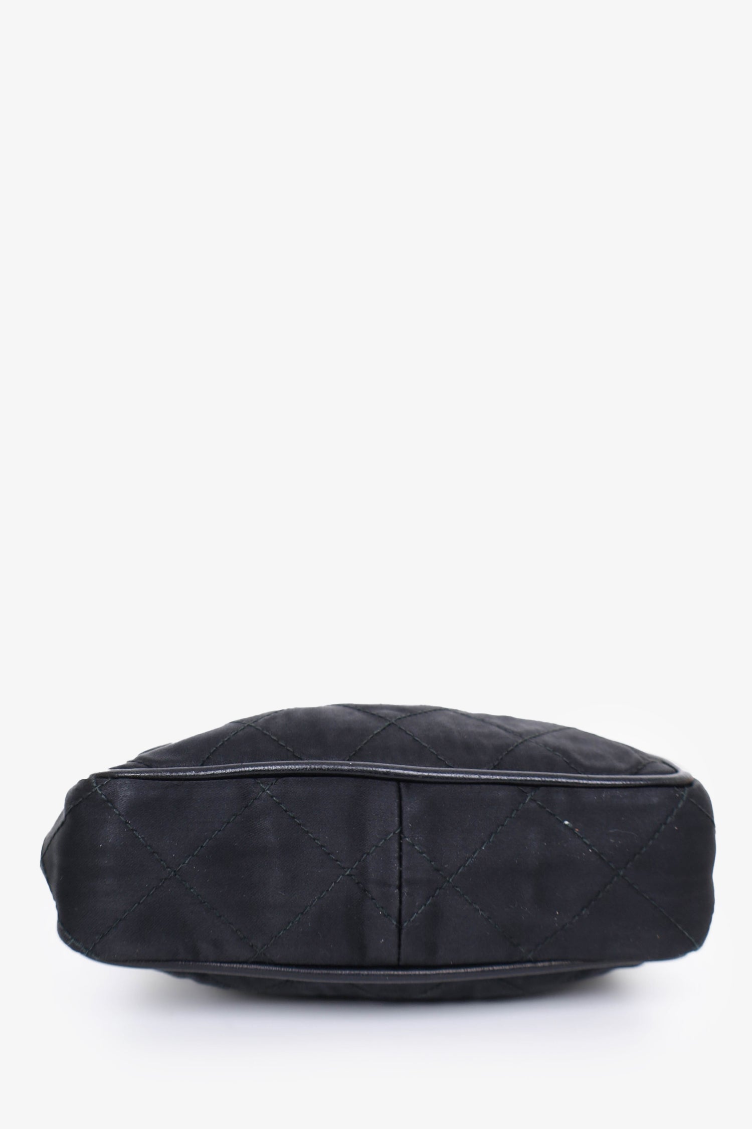 Pre-Loved Chanel™ 1989-1991 Black Satin Framed Mini Evening Bag. Top lock closure. Leather interior. Single interior zip closure pocket. Embroidered logo on front. Gold-tone hardware. Tonal stitching.