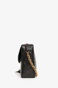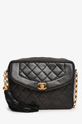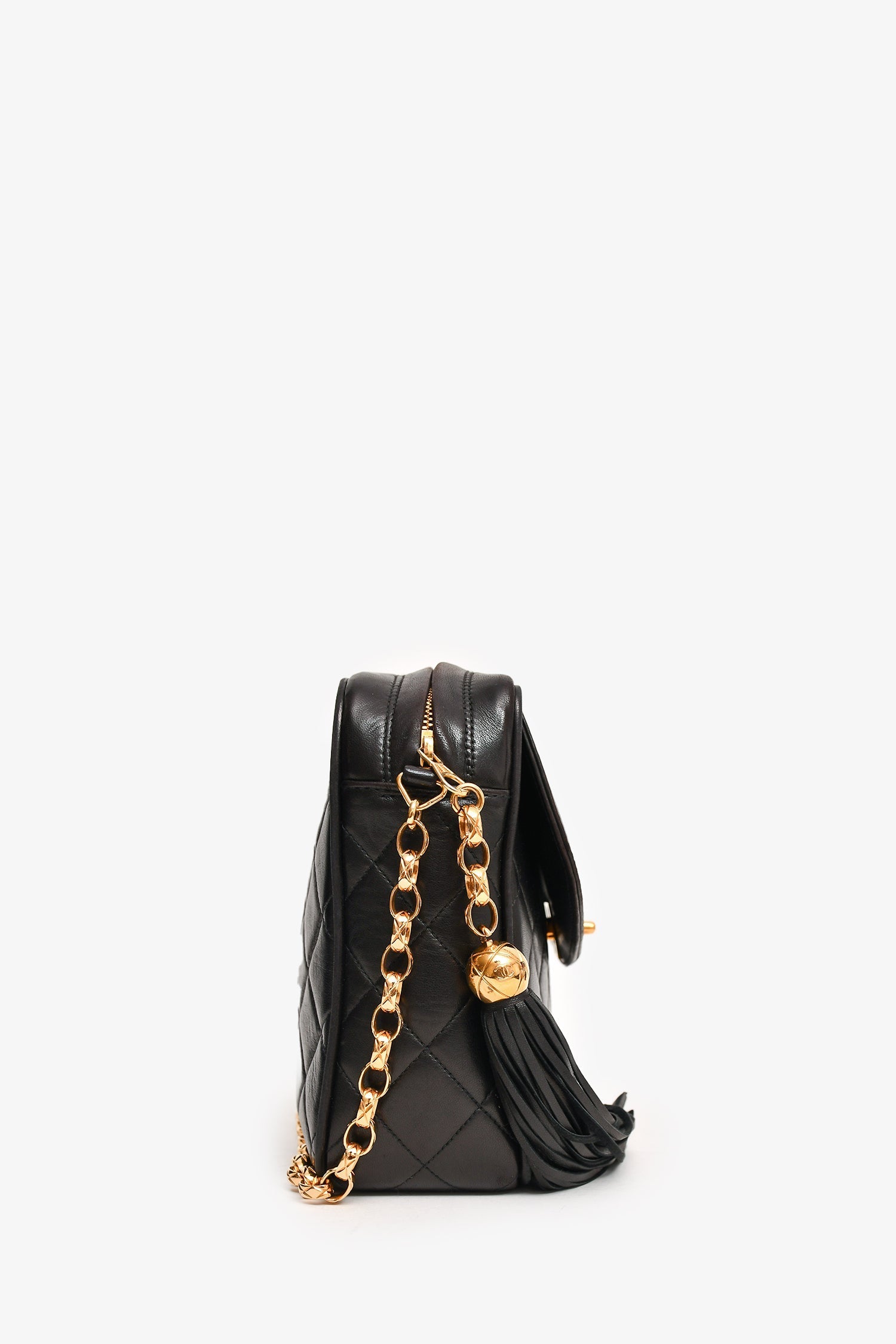 Pre-Loved Chanel™ 1991-4 Black Leather Quilted Turn Lock Camera Crossbody. Front fold-over flap with a gold-tone 'CC' turn-lock closure. Leather trimming. Upper zipper. Chain-link crossbody strap. Attached leather tassel. 1 single pocket and zipped compartment. Tonal stitching.