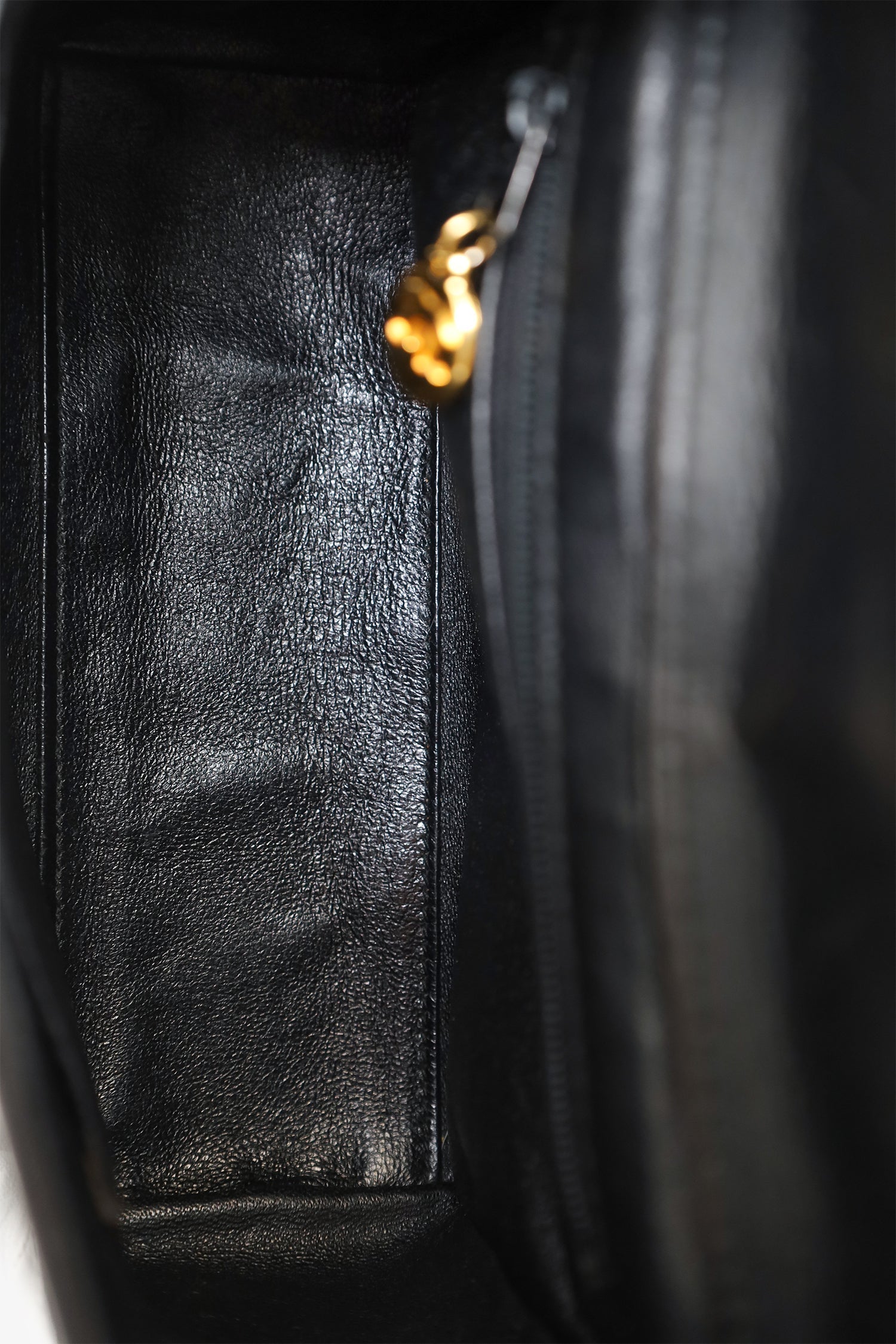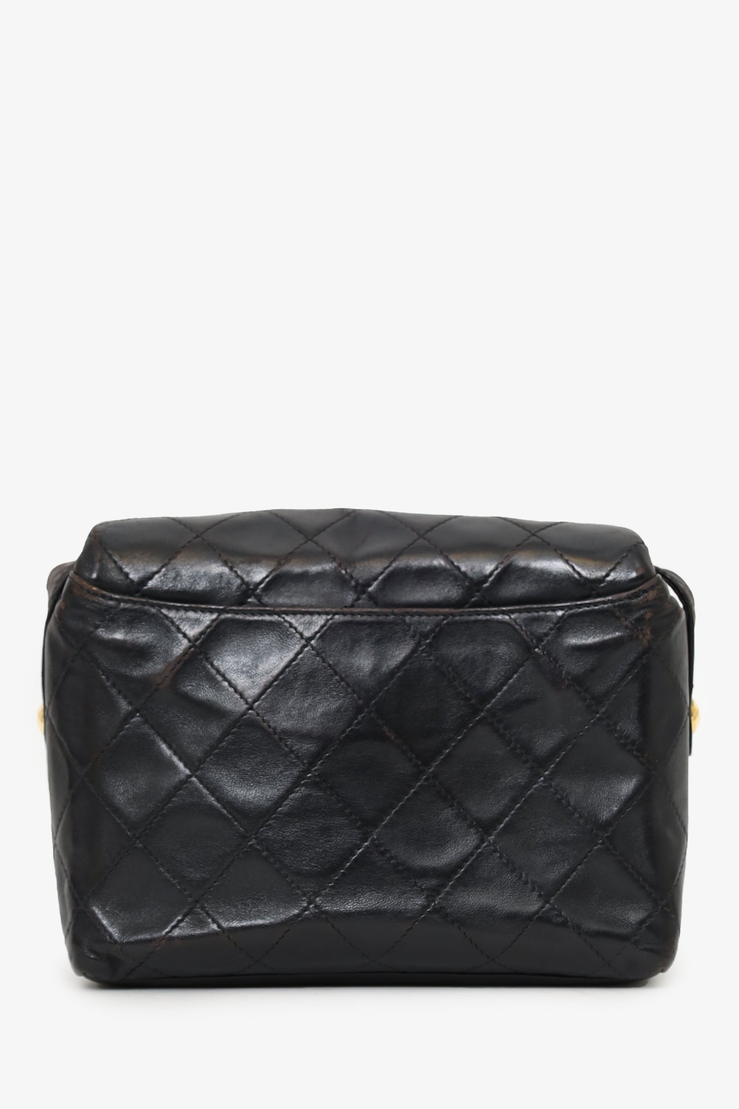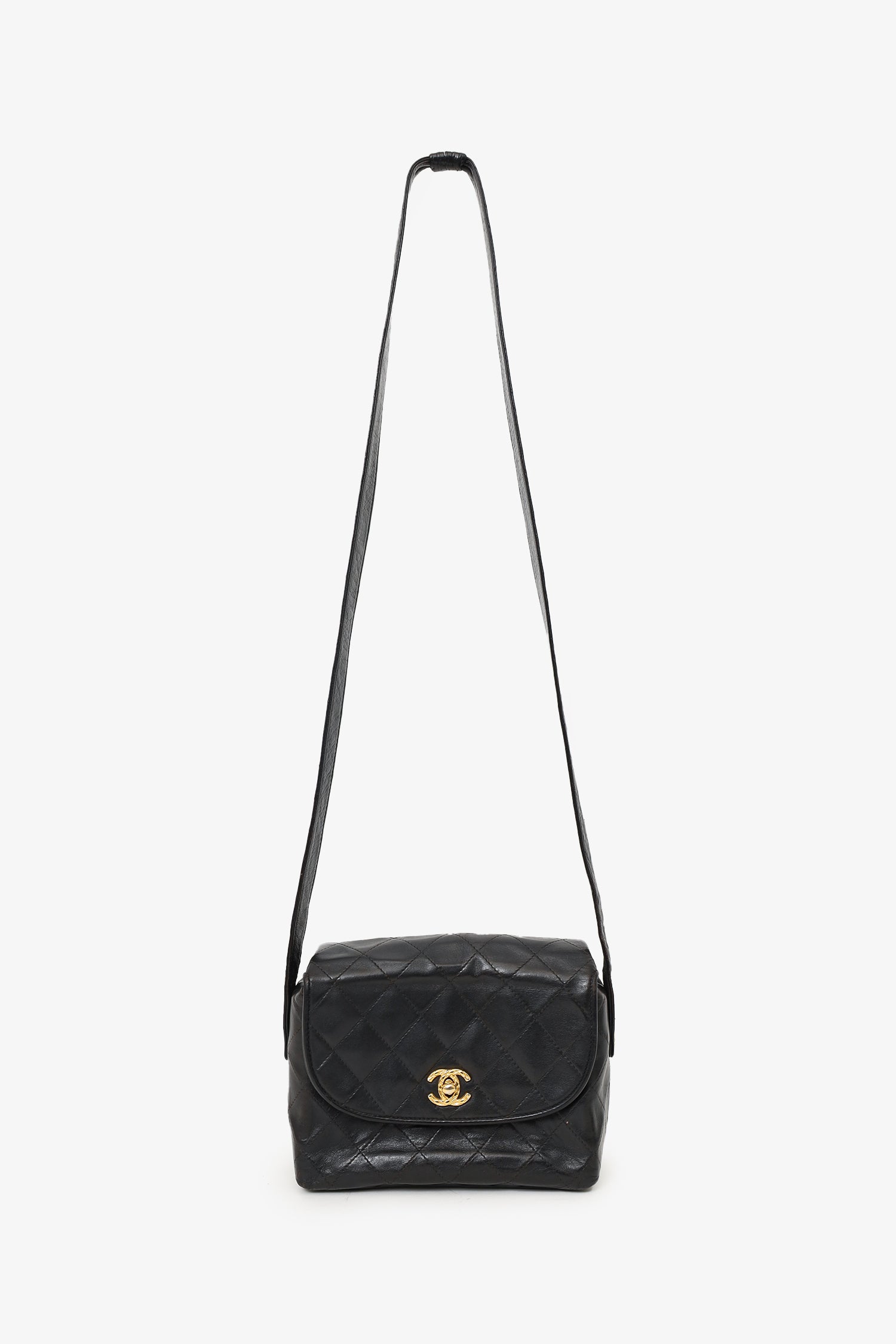 Pre-Loved Chanel™ 1991-94 Black Lambskin Round Flap Shoulder Bag. Front fold-over flap with turnlock closure. Attached leather crossbody/shoulder strap. Quilted exterior. Leather-lined interior. Rear exterior slip pocket. 2 interior pockets; 1 wall slip and 1 zip. Gold-tone hardware. Tonal stitching.