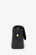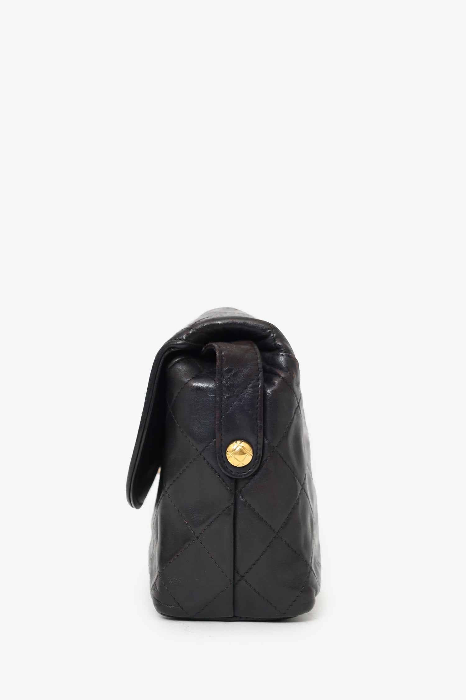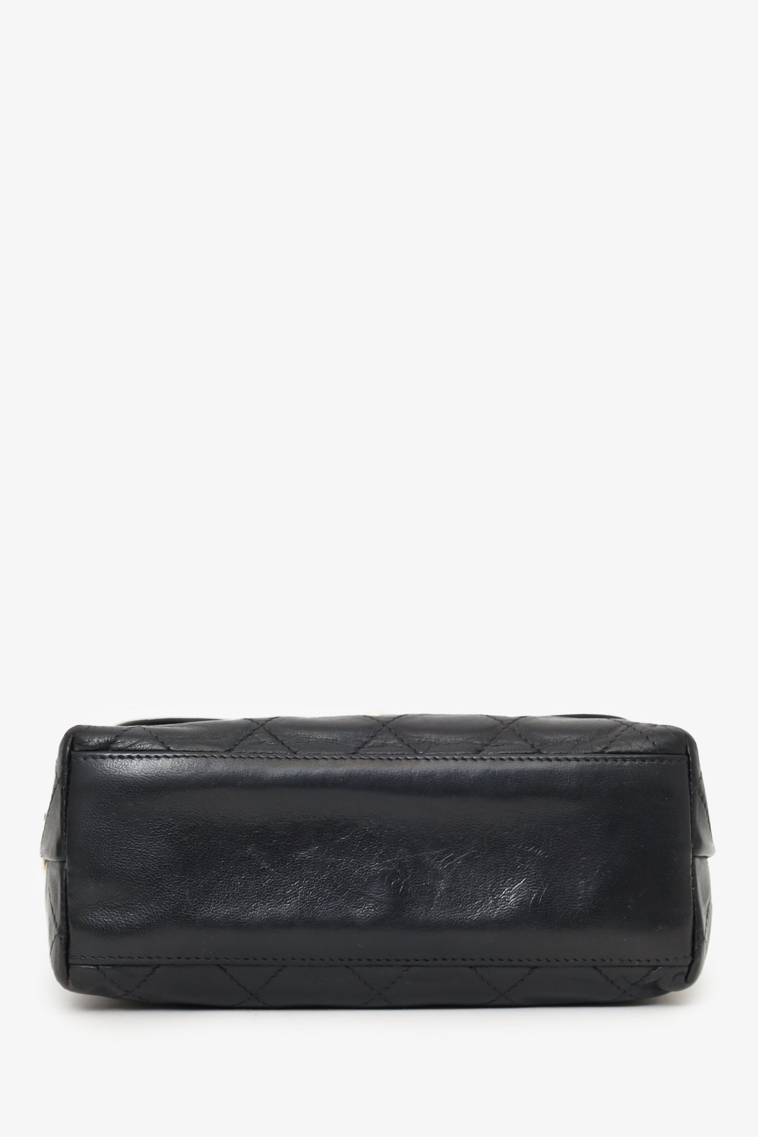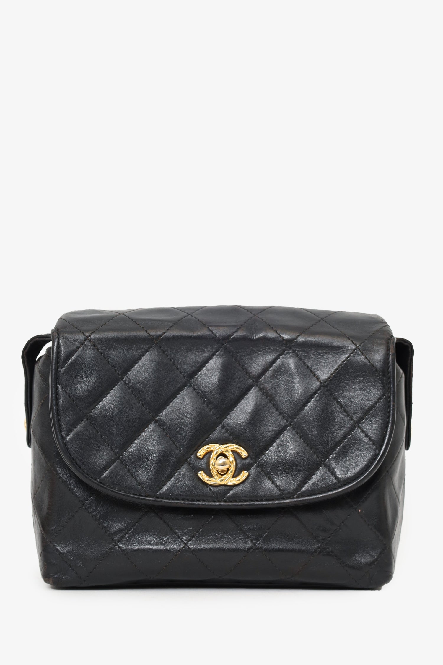Pre-Loved Chanel™ 1991-94 Black Lambskin Round Flap Shoulder Bag. Front fold-over flap with turnlock closure. Attached leather crossbody/shoulder strap. Quilted exterior. Leather-lined interior. Rear exterior slip pocket. 2 interior pockets; 1 wall slip and 1 zip. Gold-tone hardware. Tonal stitching.