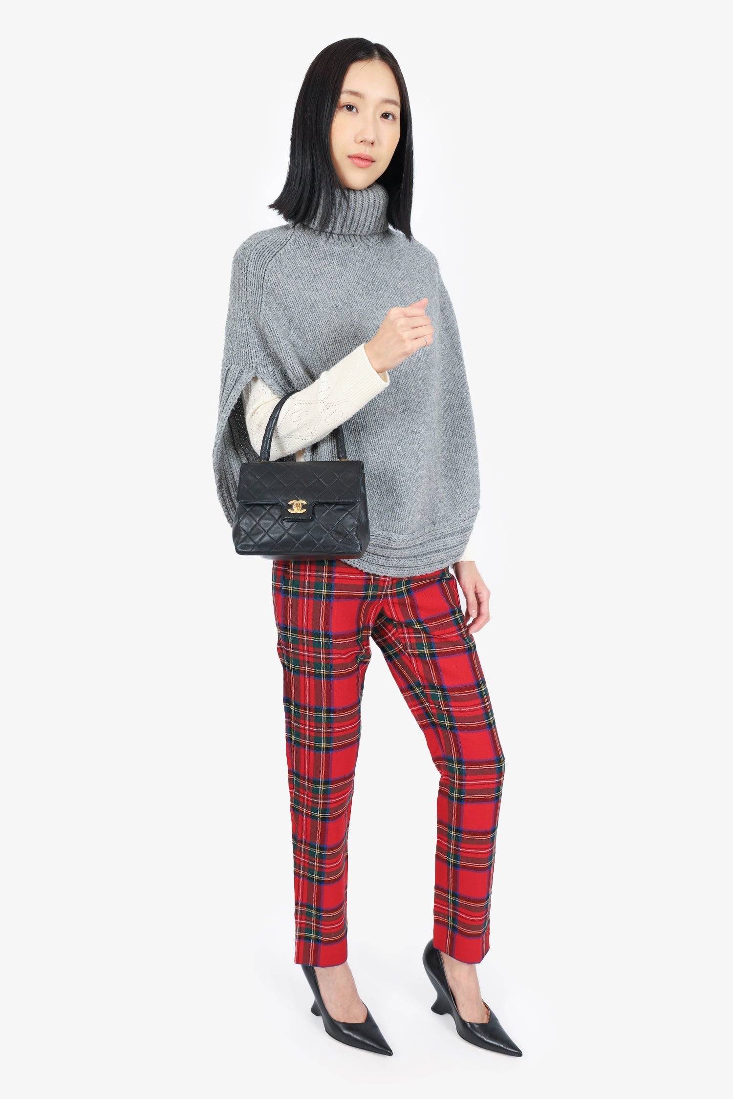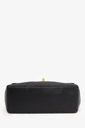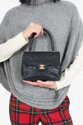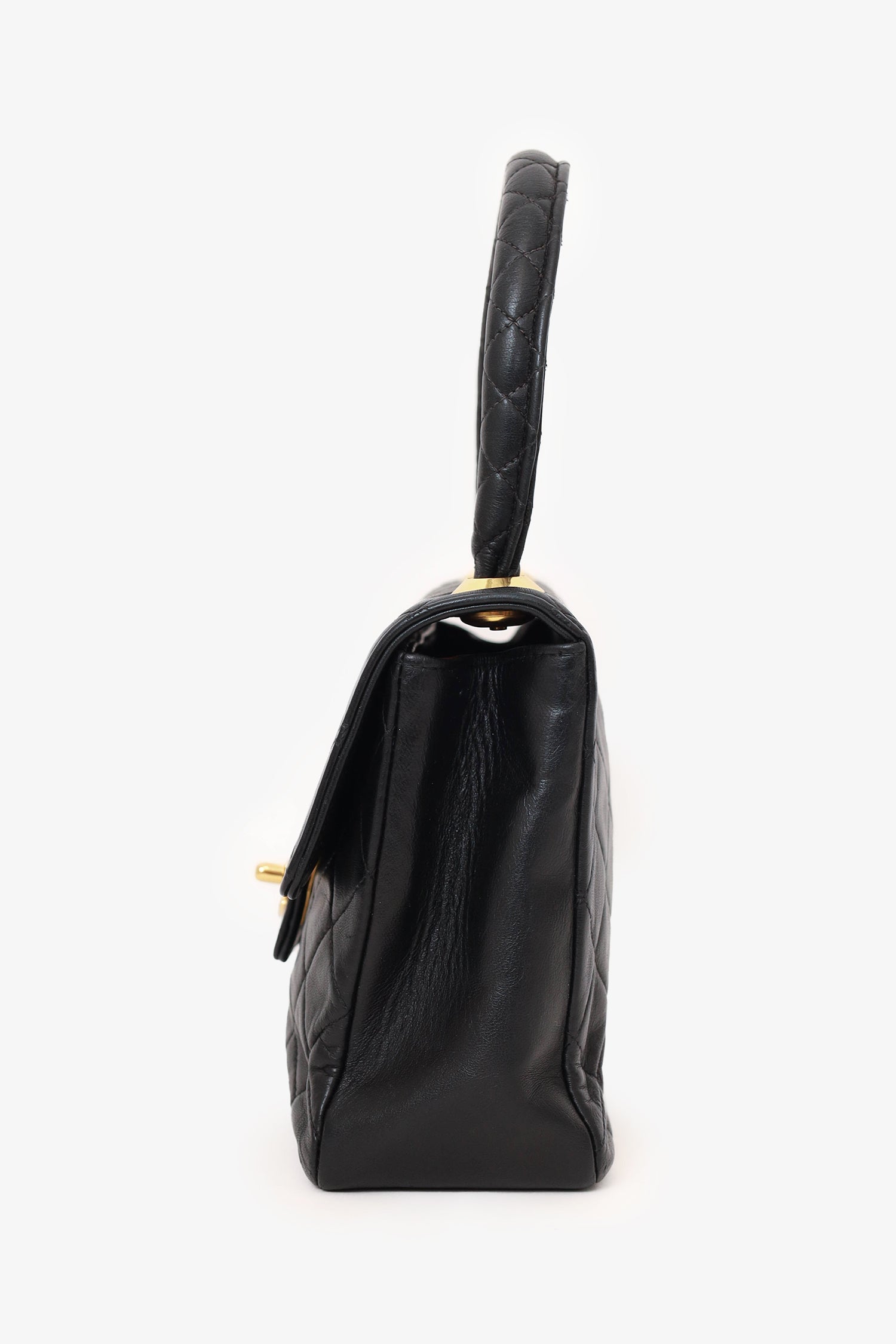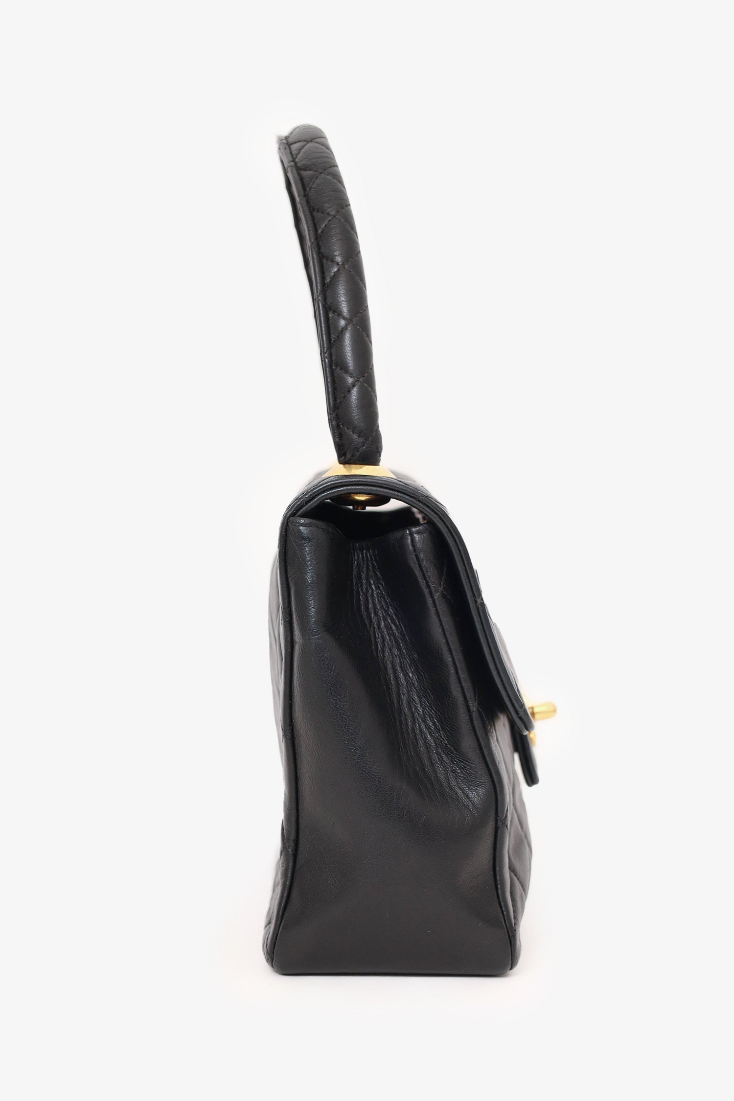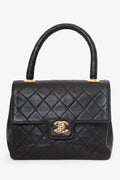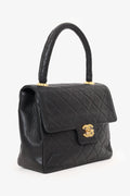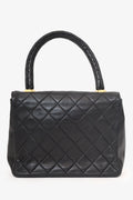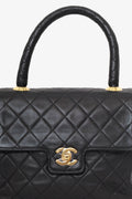 Pre-Loved Chanel™ 1991-94 Black Quilted Lambskin Kelly Top Handle Bag. Front fold-over flap with turn-lock closure. Top handle. Open interior with single wall zip closure and single wall slip pocket. Gold-tone hardware. Tonal stitching,