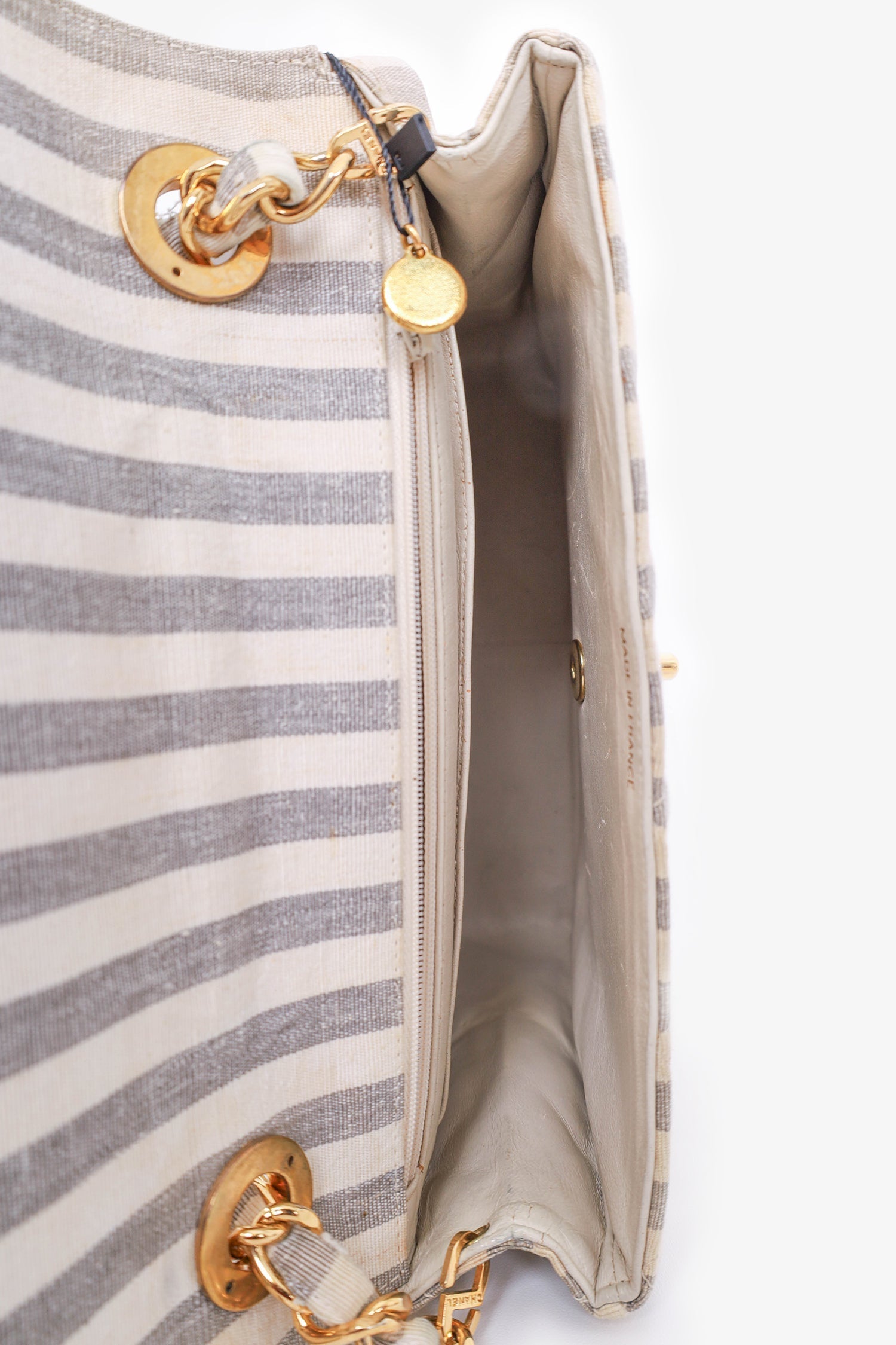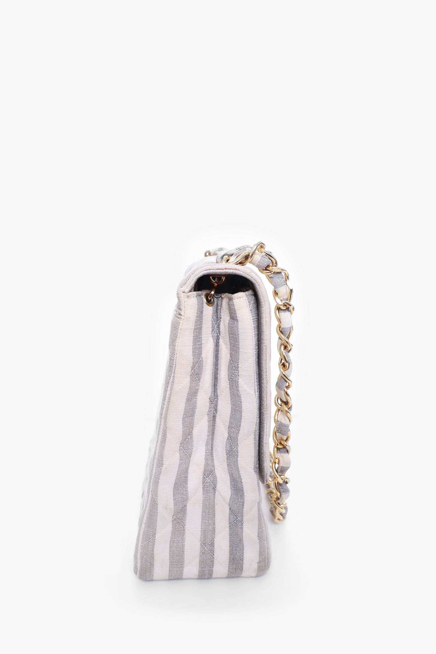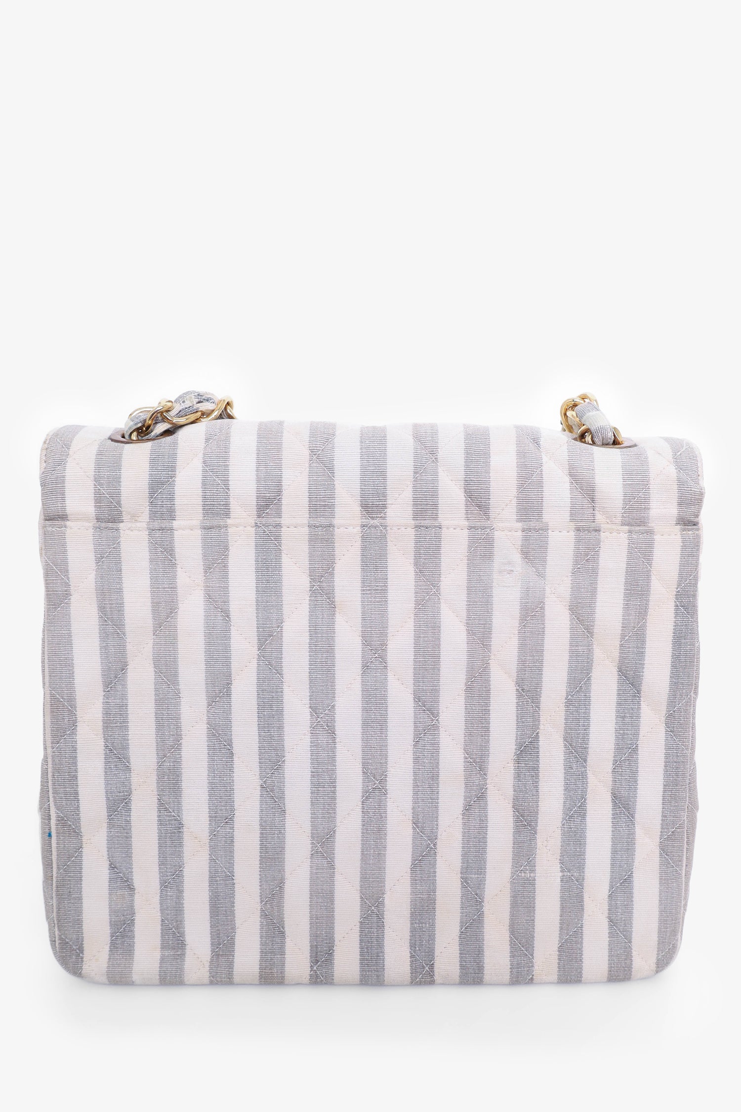 Pre-Loved Chanel™ 1994-96 Grey/White Striped Chain Shoulder Bag. Gold-tone hardware. One internal zip pocket and one slip pocket. Tonal stitching.