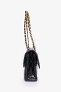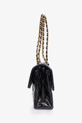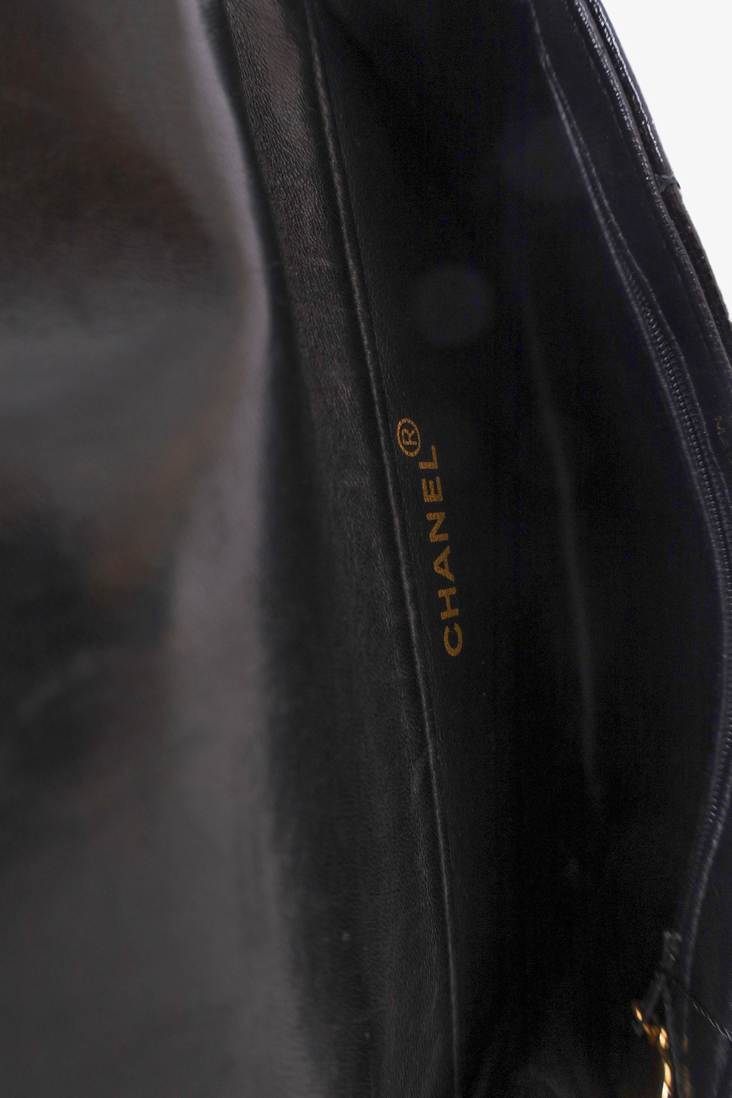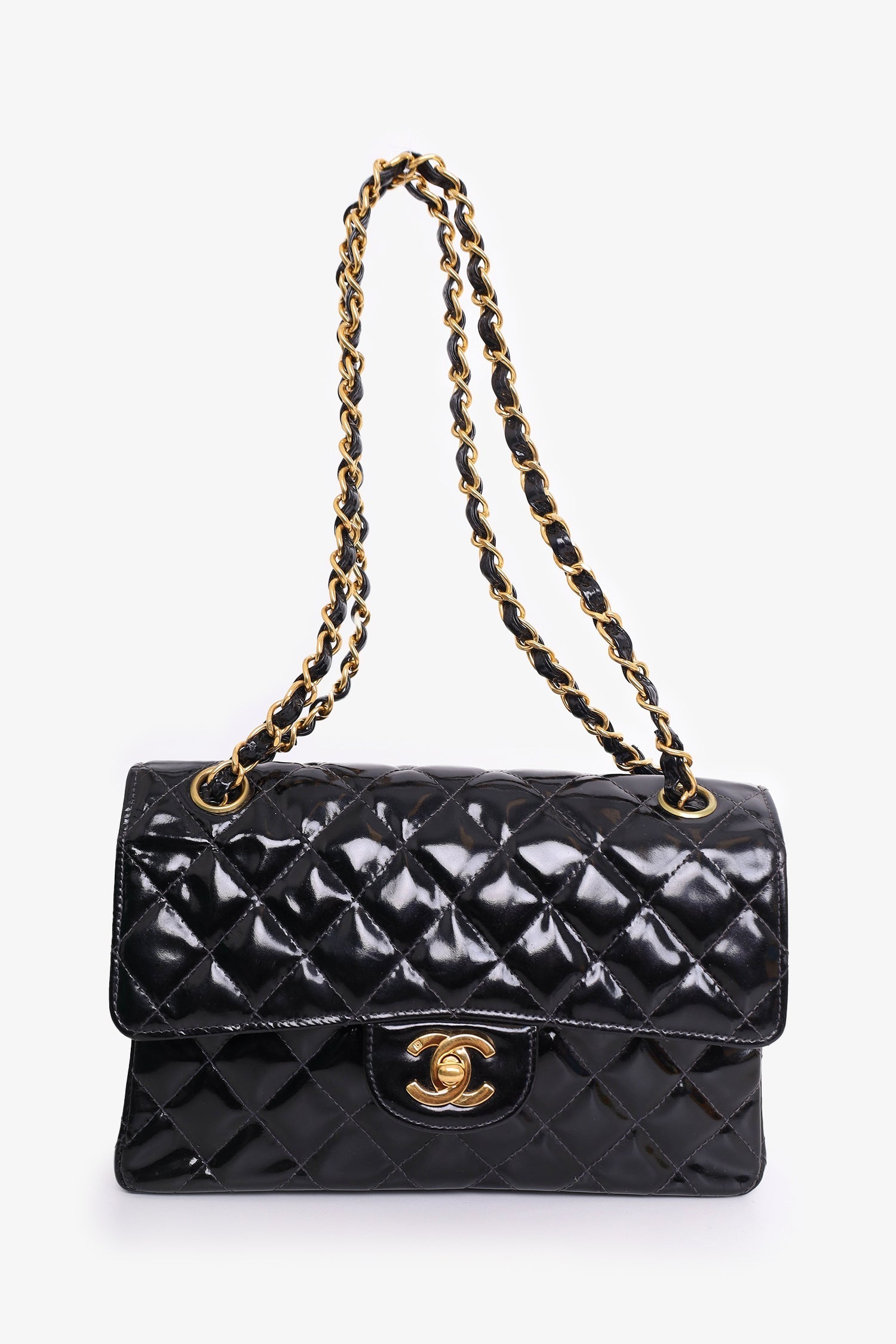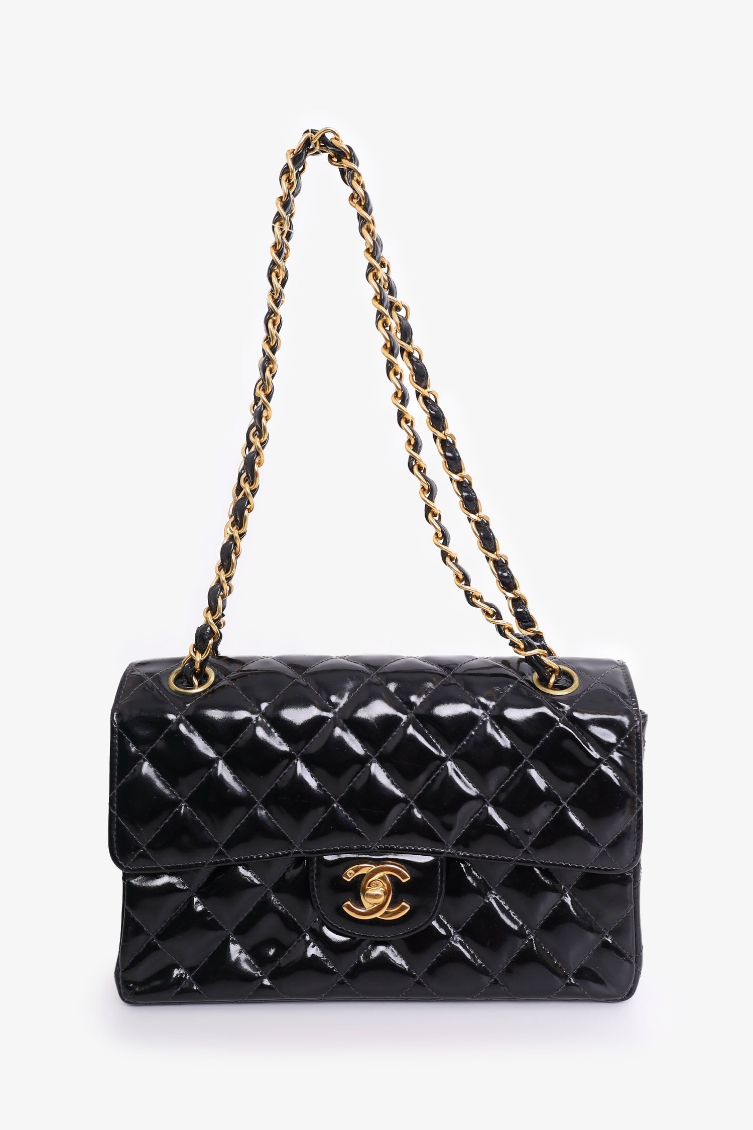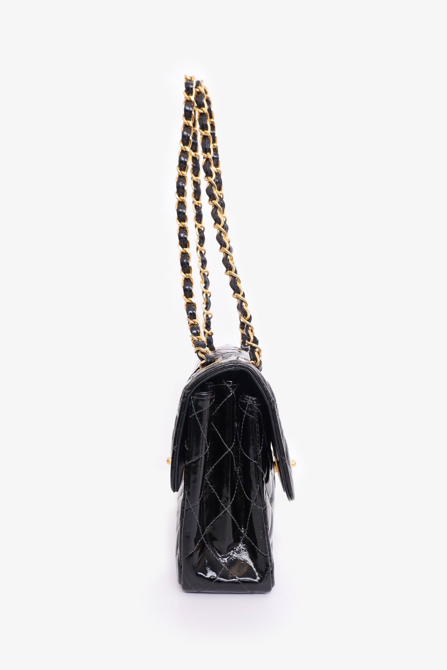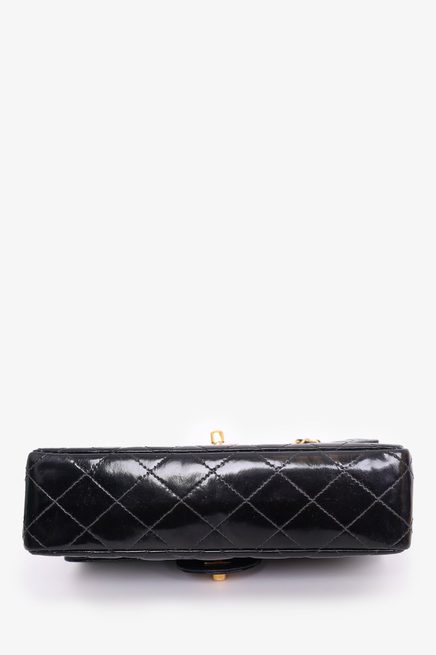 Pre-Loved Chanel™ 1996-97 Black Quilted Patent Double Sided Flap Bag. Twist lock closure. Two internal compartments. Single internal zip closure pocket on one side; single internal slip pocket on the other. Gold-tone hardware. Tonal stitching.