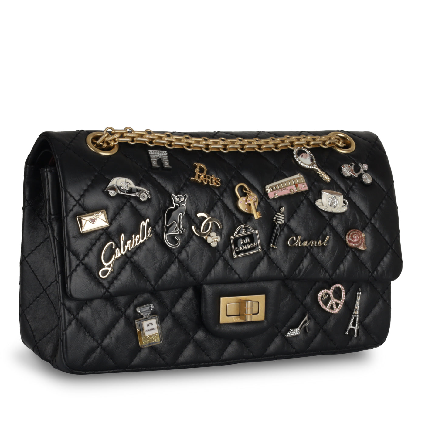 Carry a little bit of Paris with you wherever we go with the 2.55 Lucky Charms Reissue handbag. Carefully crafted from smooth calfskin leather and antique gold tone hardware, this unique and rare bag is an absolute showstopper. Embellished with fun, youthful charms nodding to Coco Chanel herself, this stunning Reissue is a true ode to Paris.