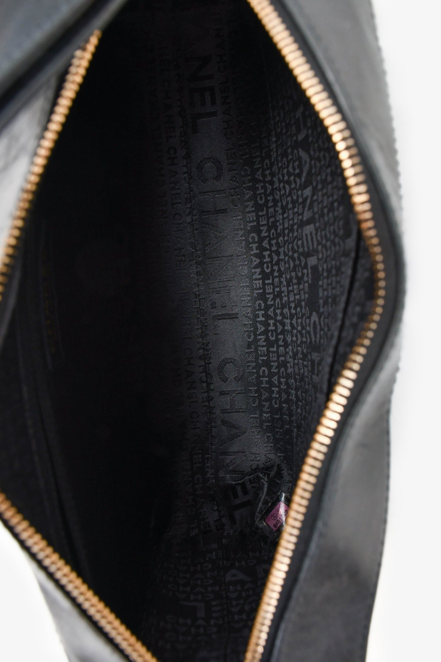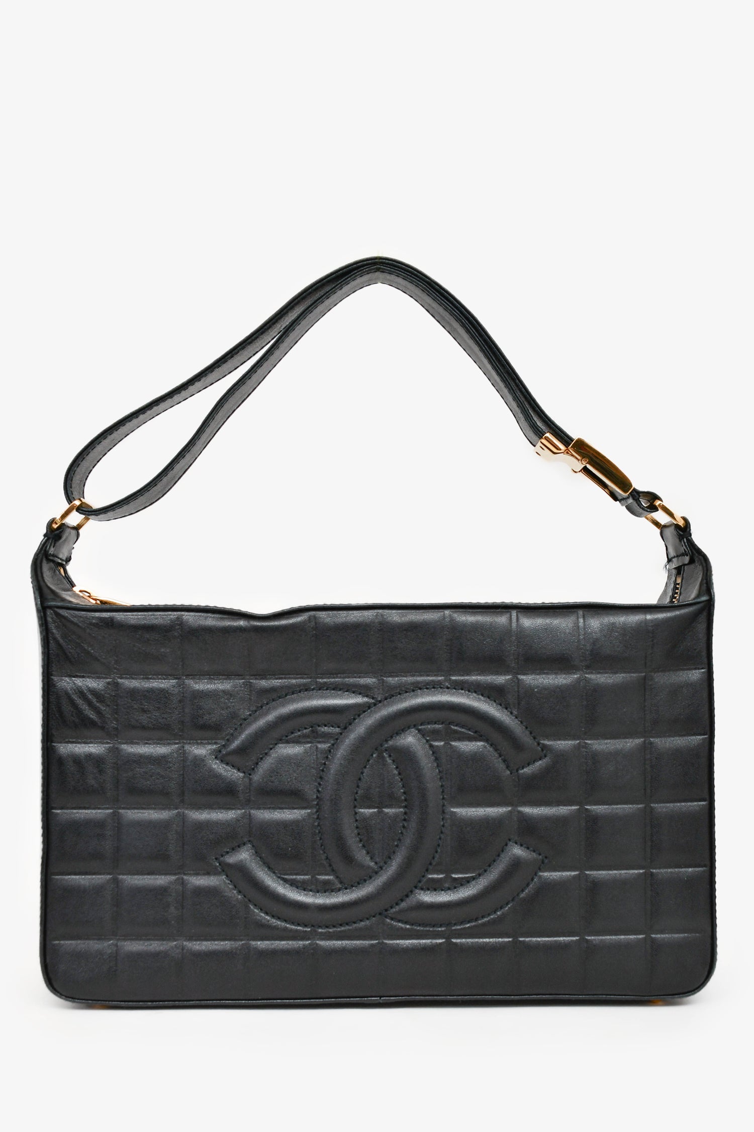 Pre-Loved Chanel™ 2003/2004 Black Leather Choco Bar CC Shoulder Bag. Top zip closure. One wall slip pocket. One wall zippered pocket. Lined interior. Tonal stitching.