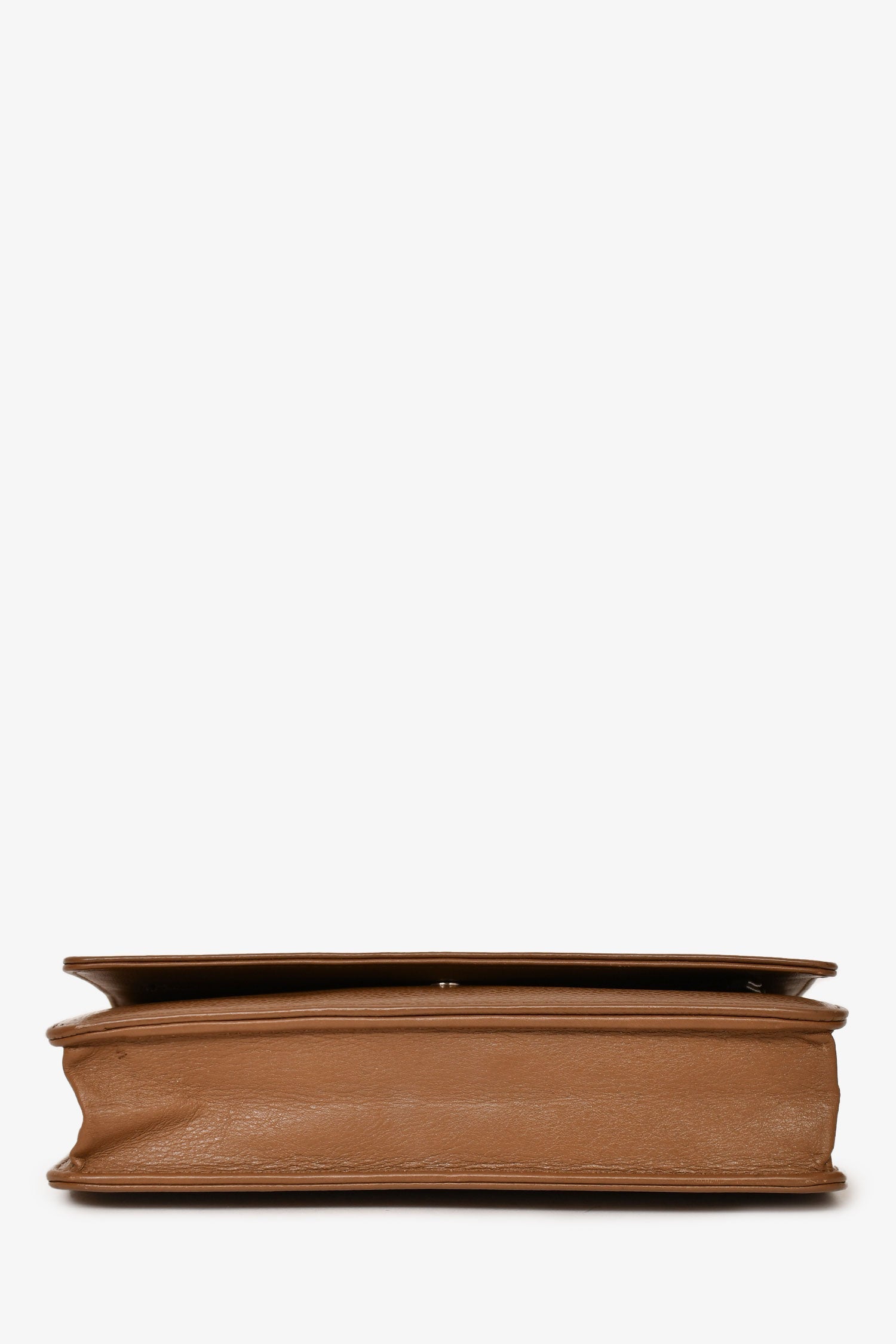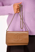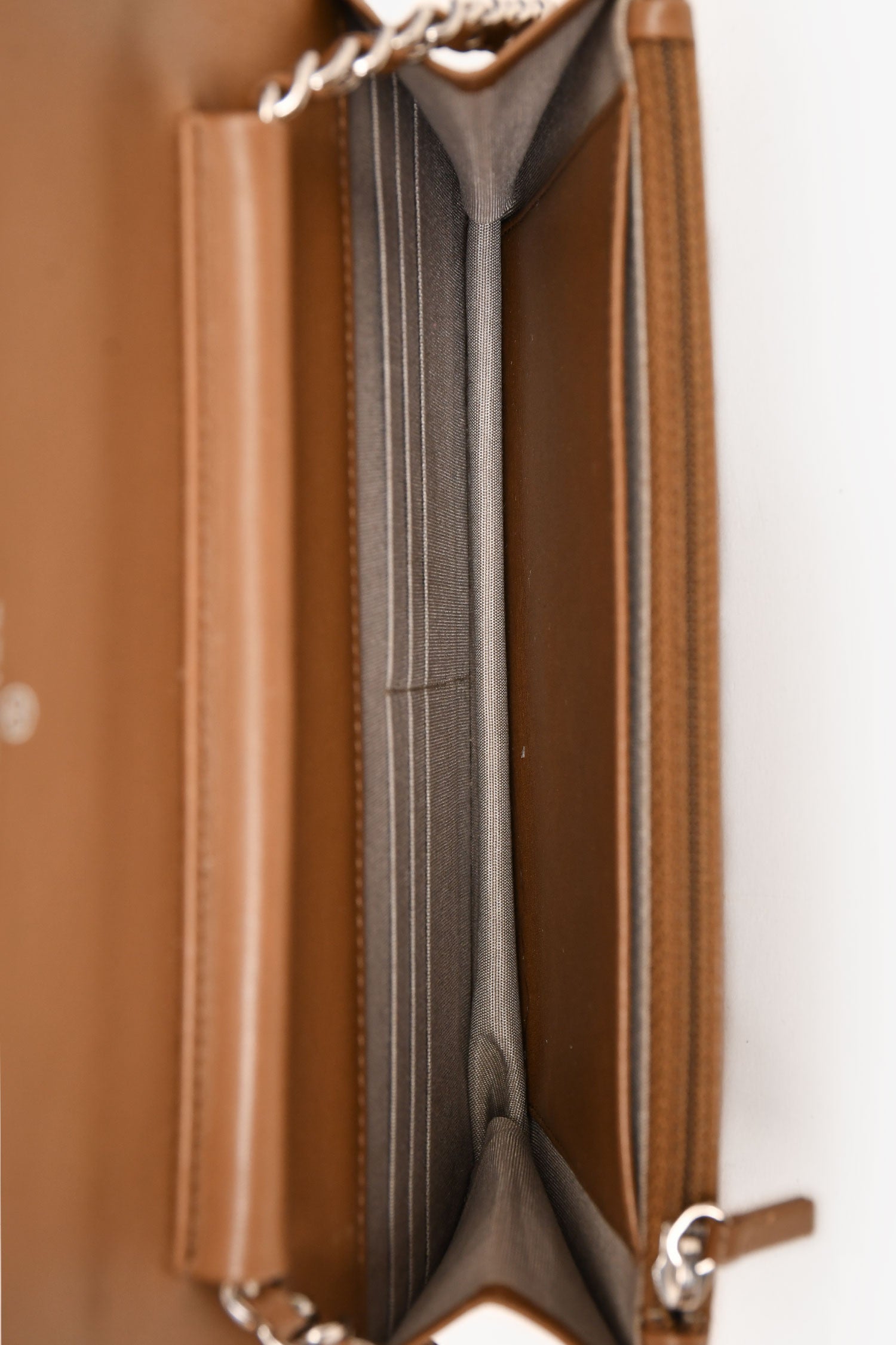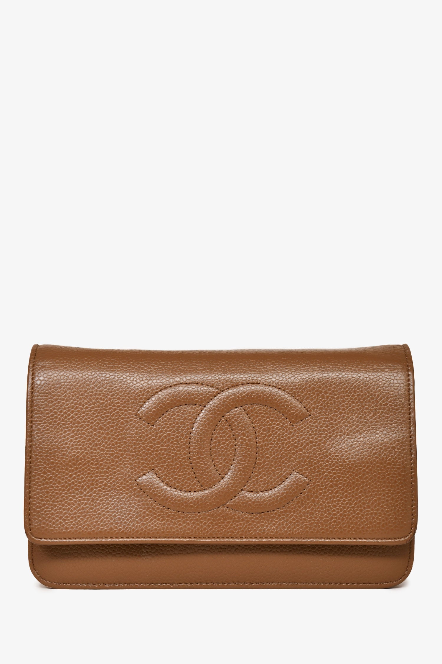 Pre-Loved Chanel™ 2012-13 Brown Caviar Leather CC Logo Wallet On Chain. Single chain linked strap. Fold over flap with snap button closure. Lampo zipper pocket on the interior of the flap. One exterior slip pocket under flap. One zip closure pocket. Main compartment with one wall slip pocket and six card slots. Tonal stitching.
