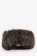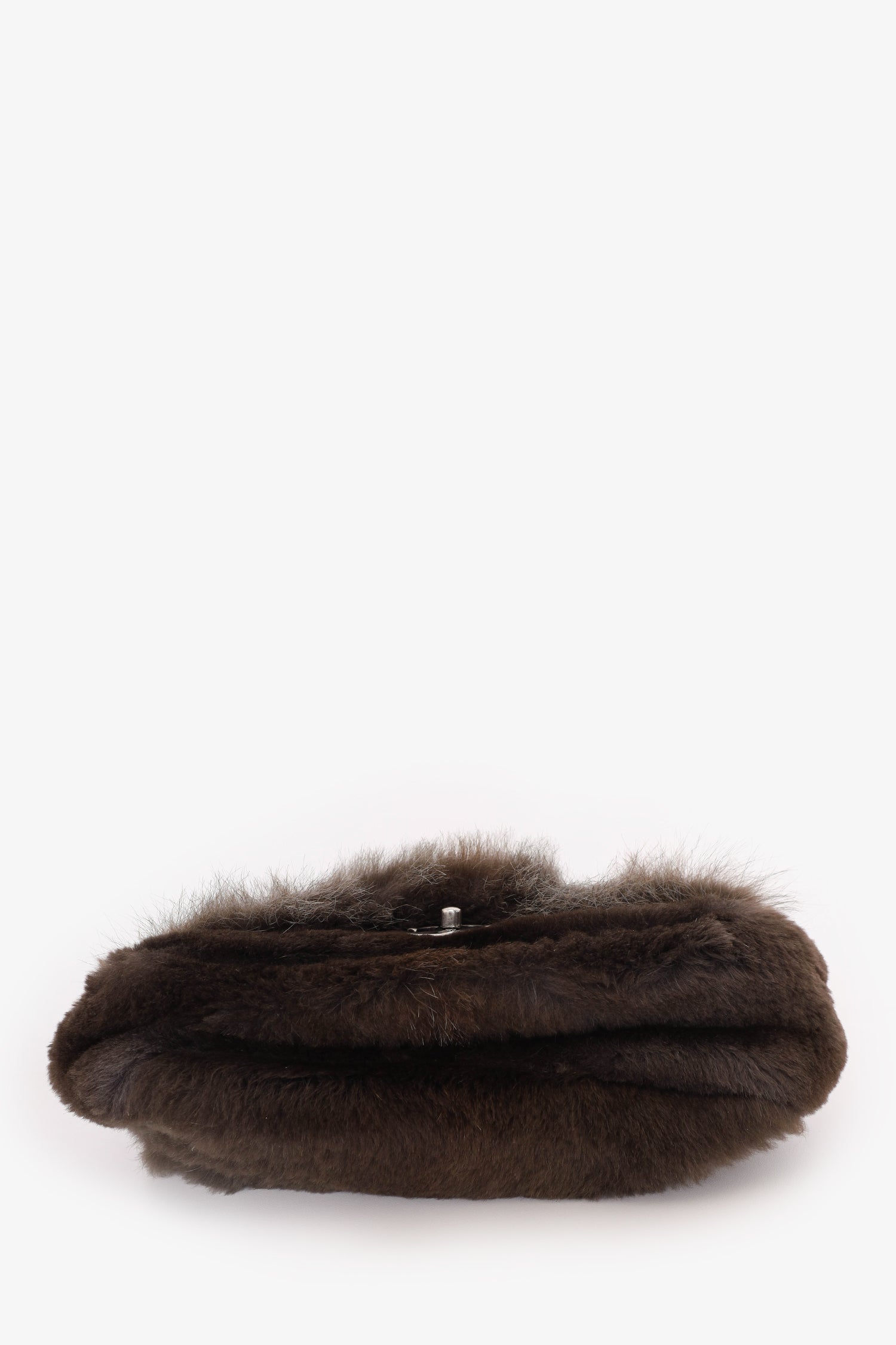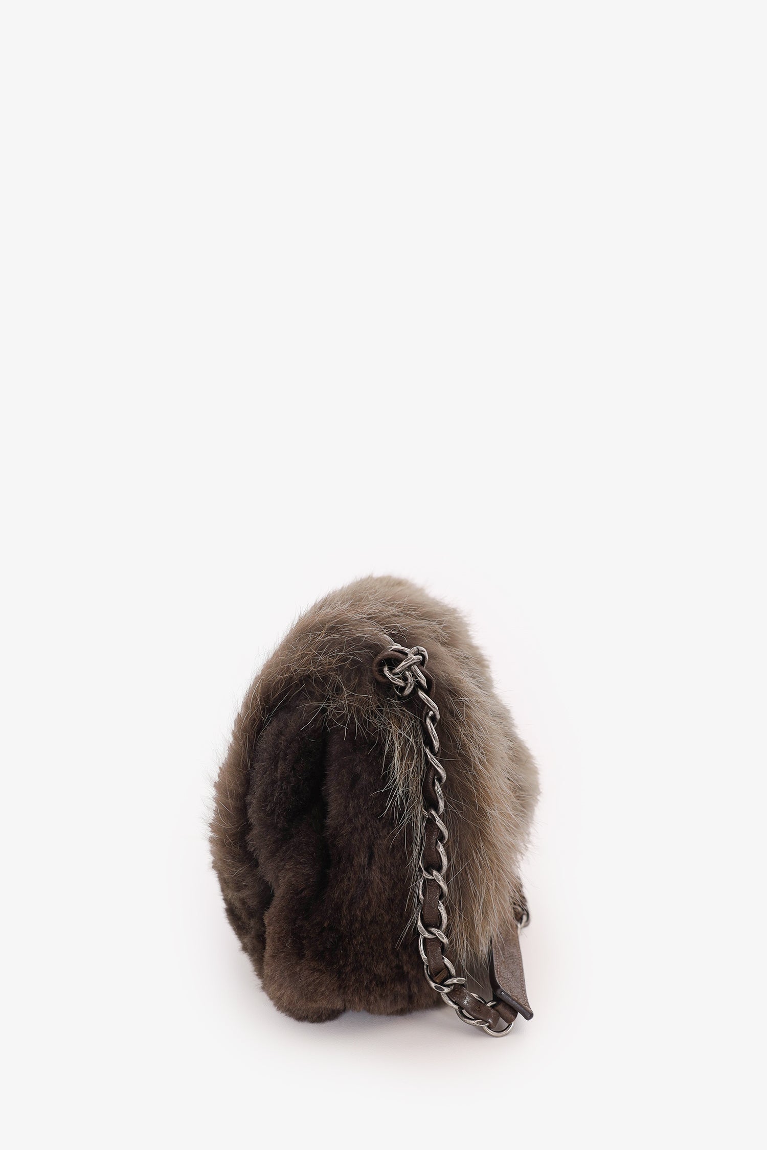 Pre-Loved Chanel™ 2013-14 Brown Fur CC Flap Bag. Front fold-over flap with turn lock closure. Open satin interior with 3 wall pockets; 2 slip and 1 with zip closure. Chain/leather shoulder strap. Silver-tone hardware. Tonal stitching.