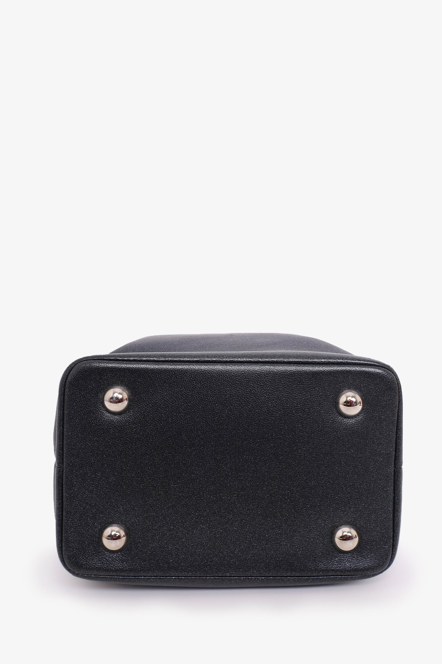Pre-Loved Chanel™ 2016-17 Black Lambskin Quilted CC Vanity With Strap. Top hinged lid with clasp closure. Mirror on inside of top. Open interior with 2 pockets; 1 slip and 1 with zip closure. Protective bottom studs. Tonal stitching. Silver-tone hardware.