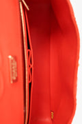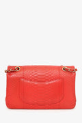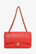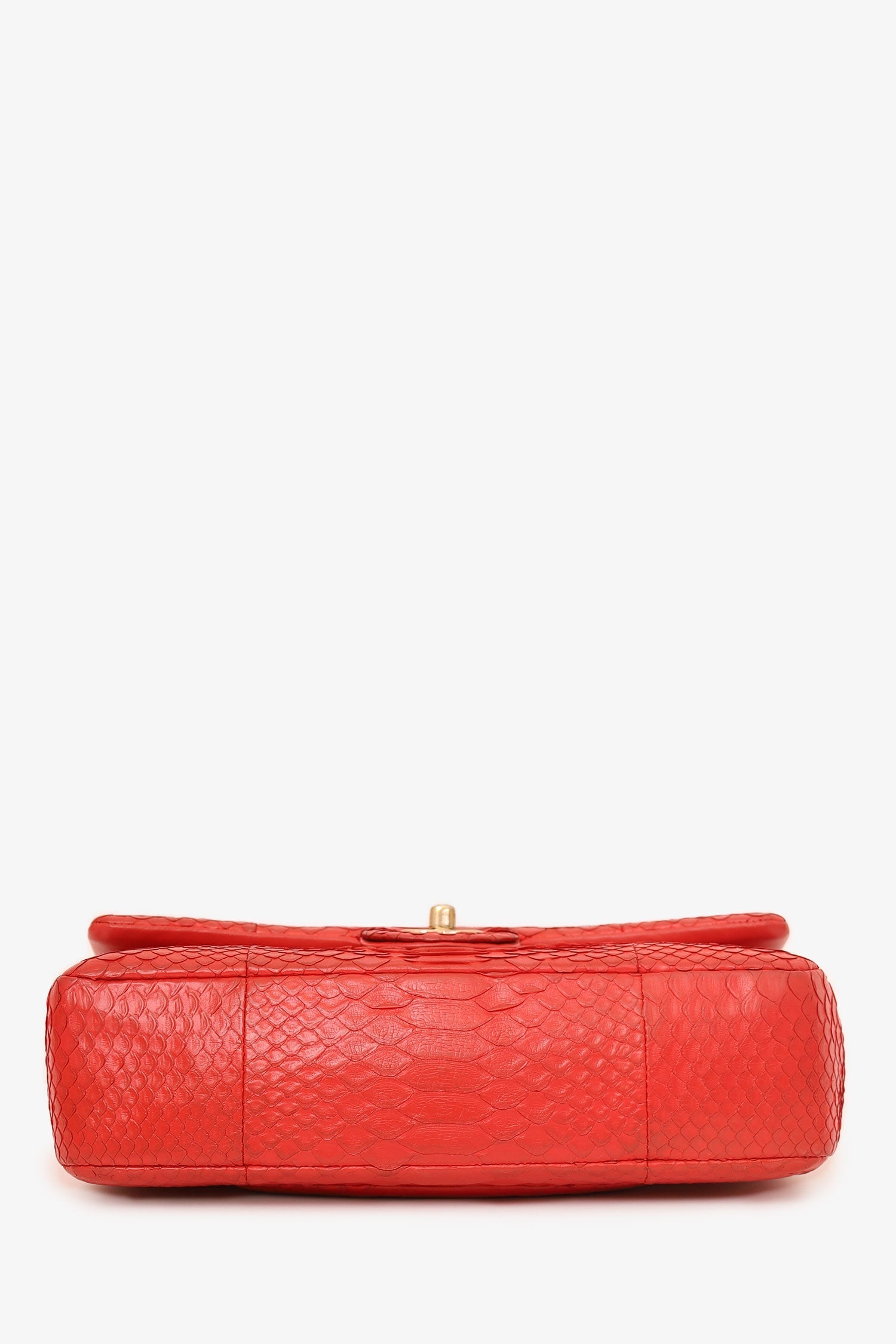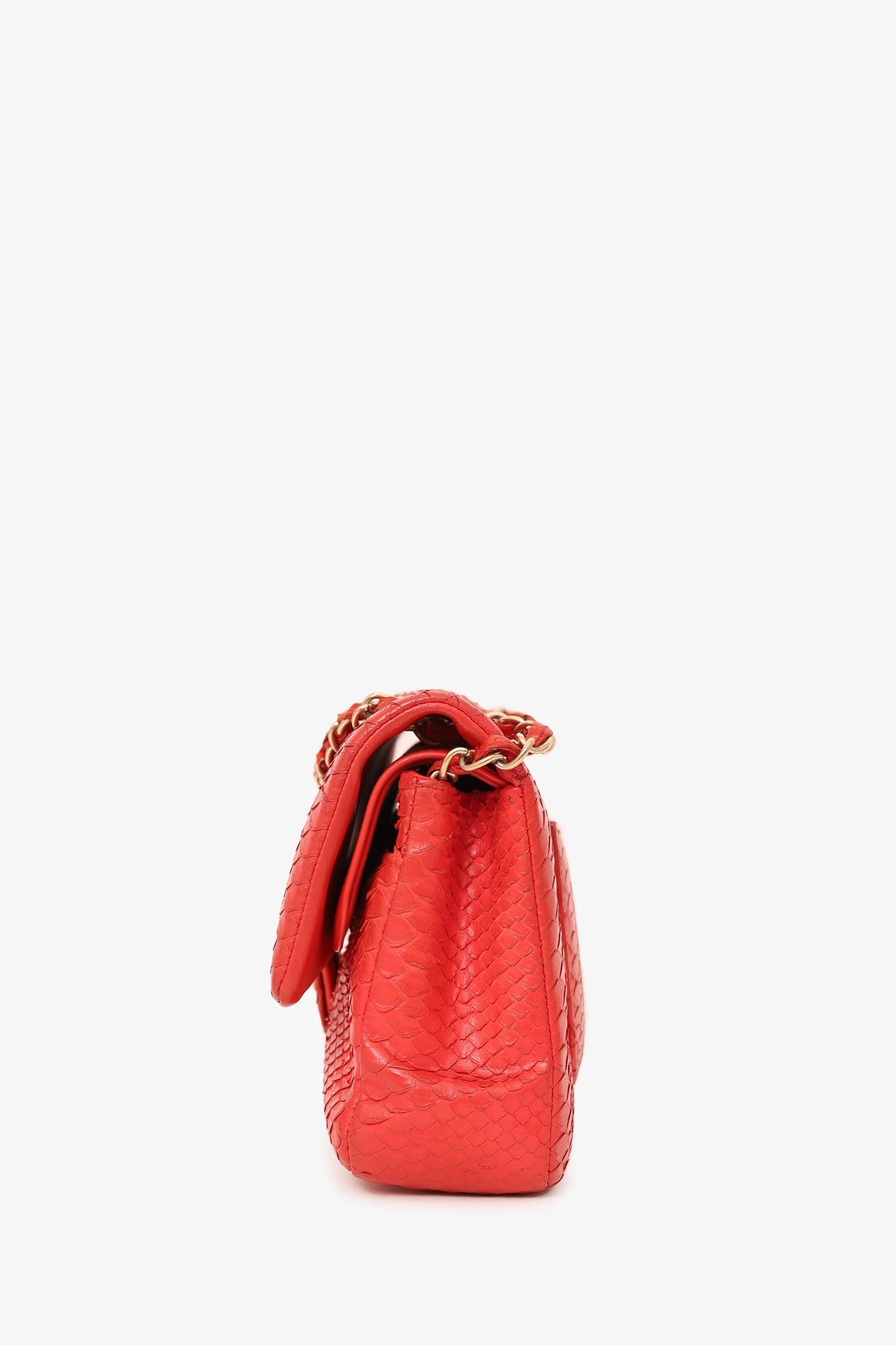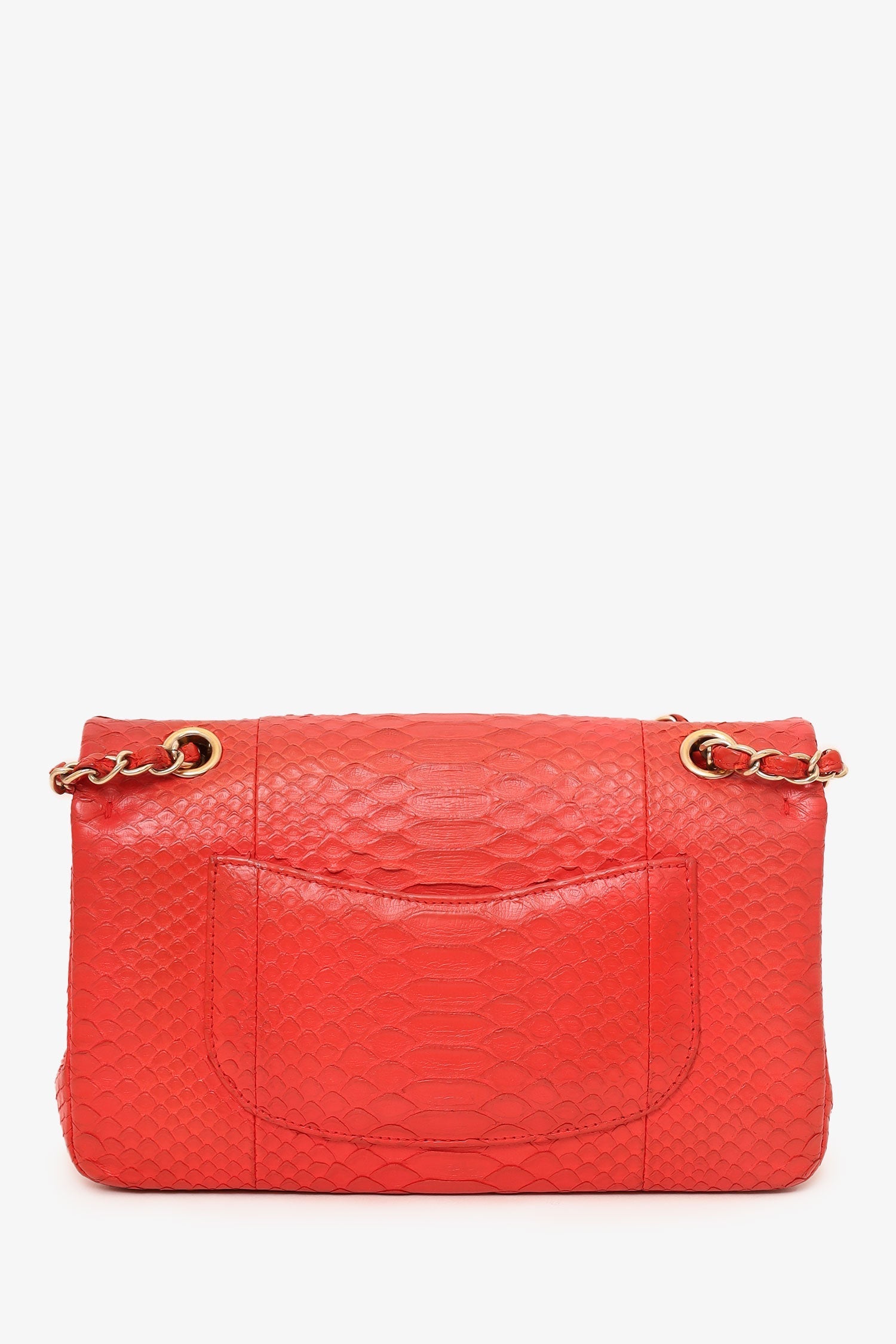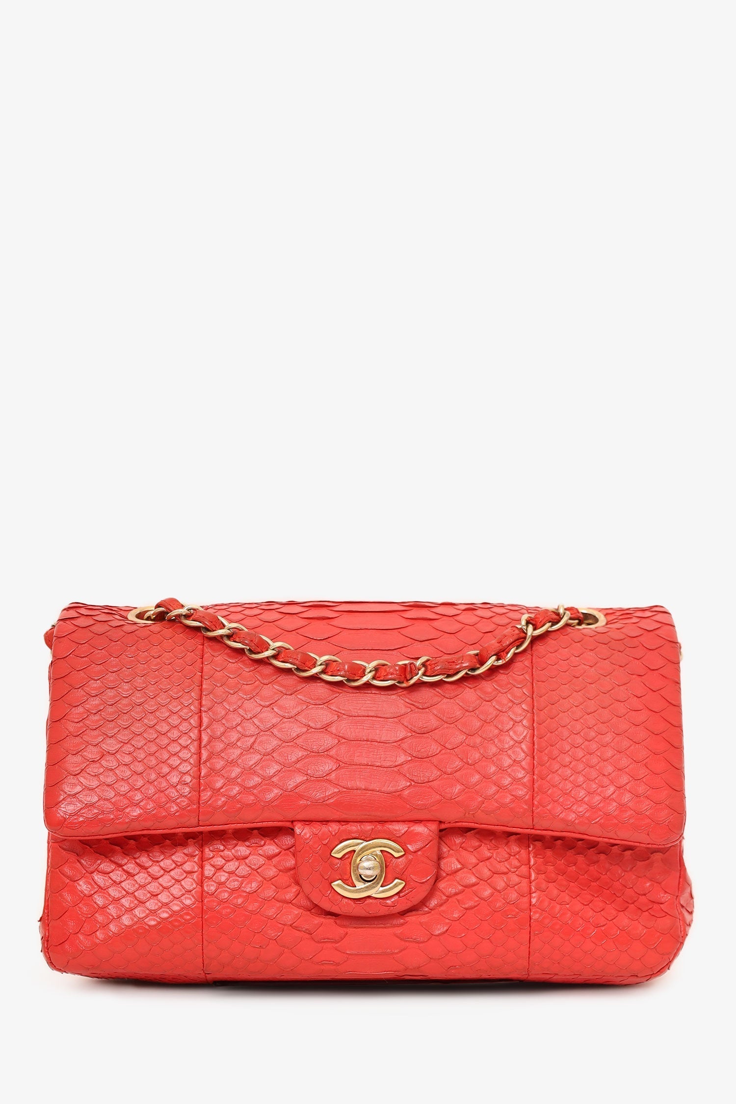 Pre-Loved Chanel™ 2016-17 Red Python Leather Medium Double Flap Bag. Front fold-over flap with turn-lock closure. Double chain shoulder strap. Single rear slip pocket. Zip closure pocket on outer flap. Single front interior slip pocket. Interior main compartment with 2 slip pockets, 1 zip closure pocket, and 1 pen compartment. Rear interior slip compartment. Gold-tone hardware. Tonal stitching.