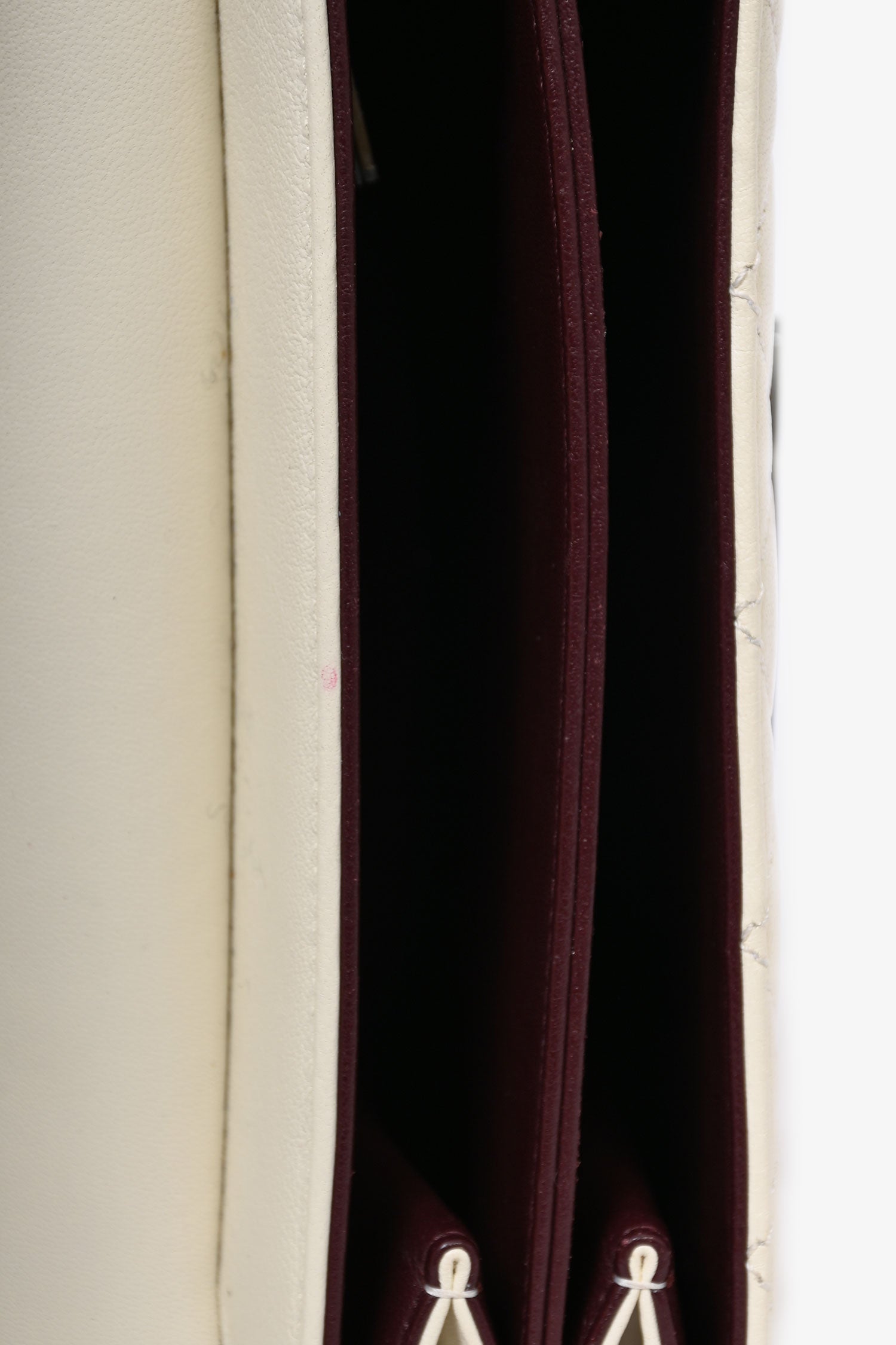 Pre-Loved Chanel™ 2016 Cream Leather Beauty Lock Flap Shoulder Bag. Fold-over flap with push-lock closure. Black plaque with CC detailing. Gold-tone hardware. Slip chain. 2 interior compartments separated by divider. Single interior pocket with zip closure. Burgundy leather interior lining. Tonal stitching.