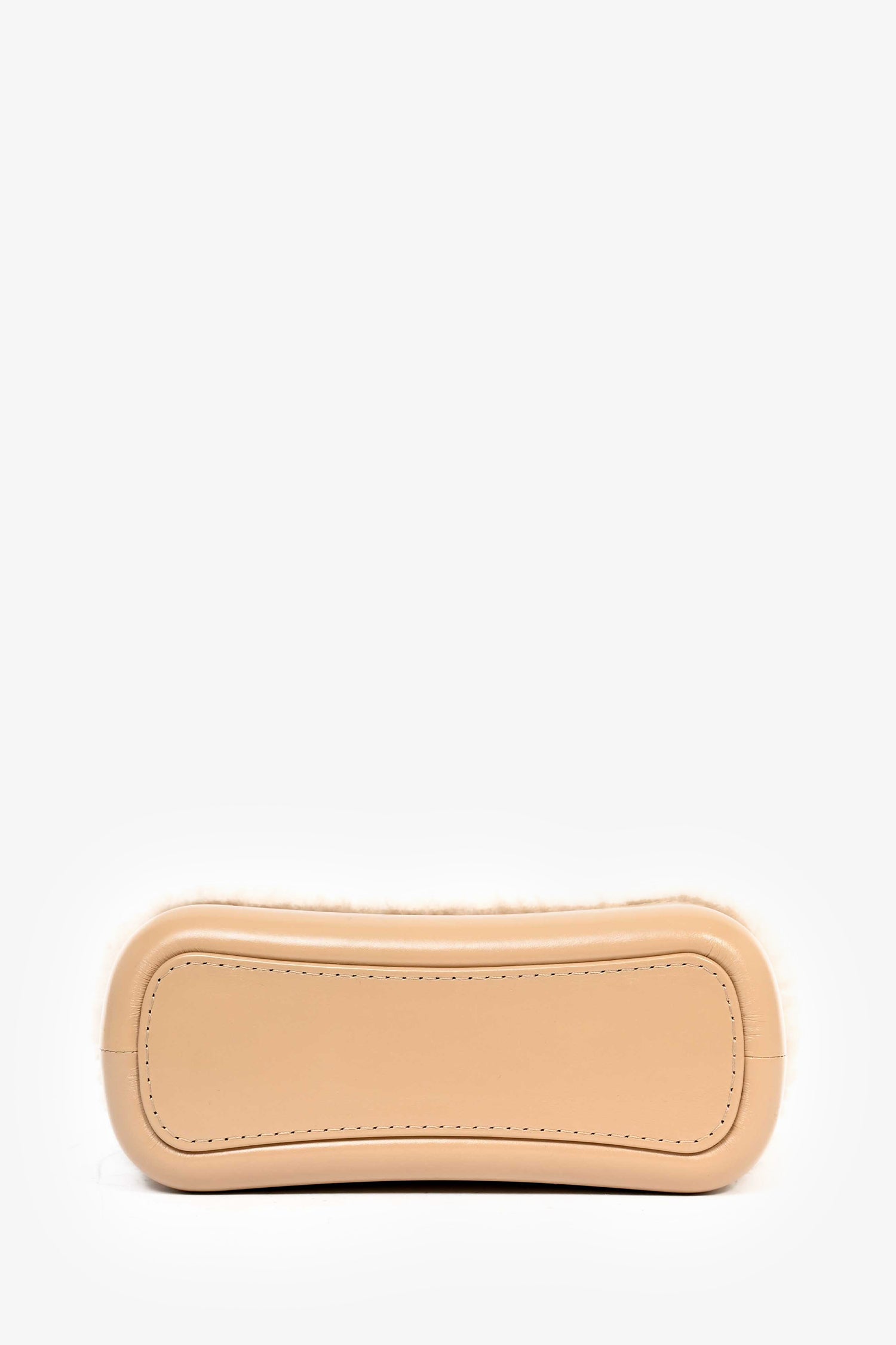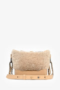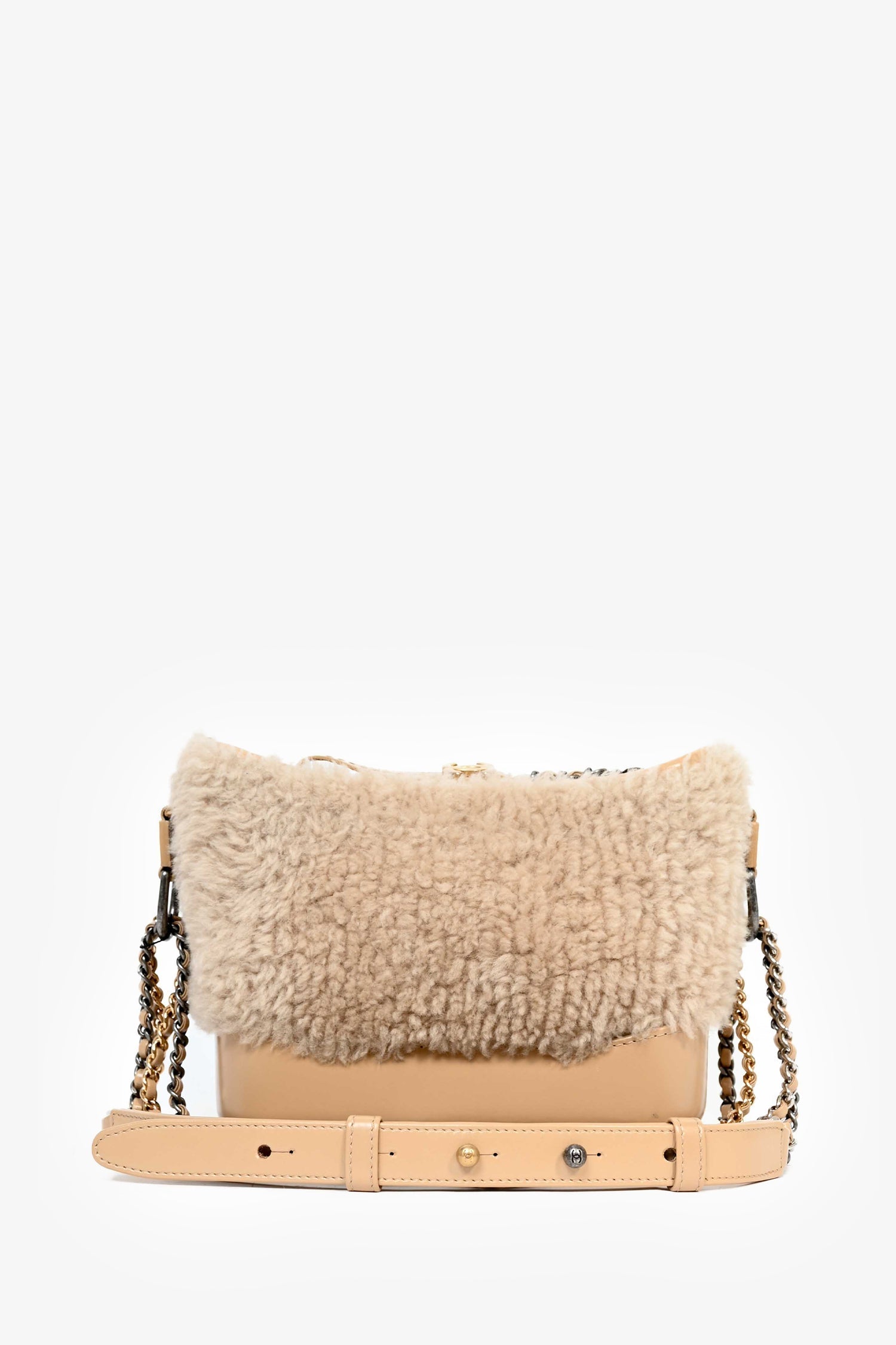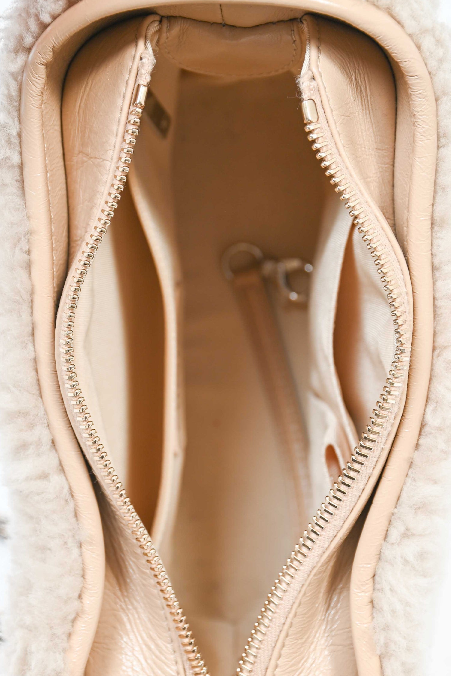 Pre-Loved Chanel™ 2017-18 Beige Shearling/Leather Small Gabrielle Crossbody. Shearling throughout with a structured base. Antiqued silver and gold-tone hardware. Zipped top. Lined interior with a zipped compartment and slip pocket. Double chain-link crossbody straps with a leather shoulder pad.