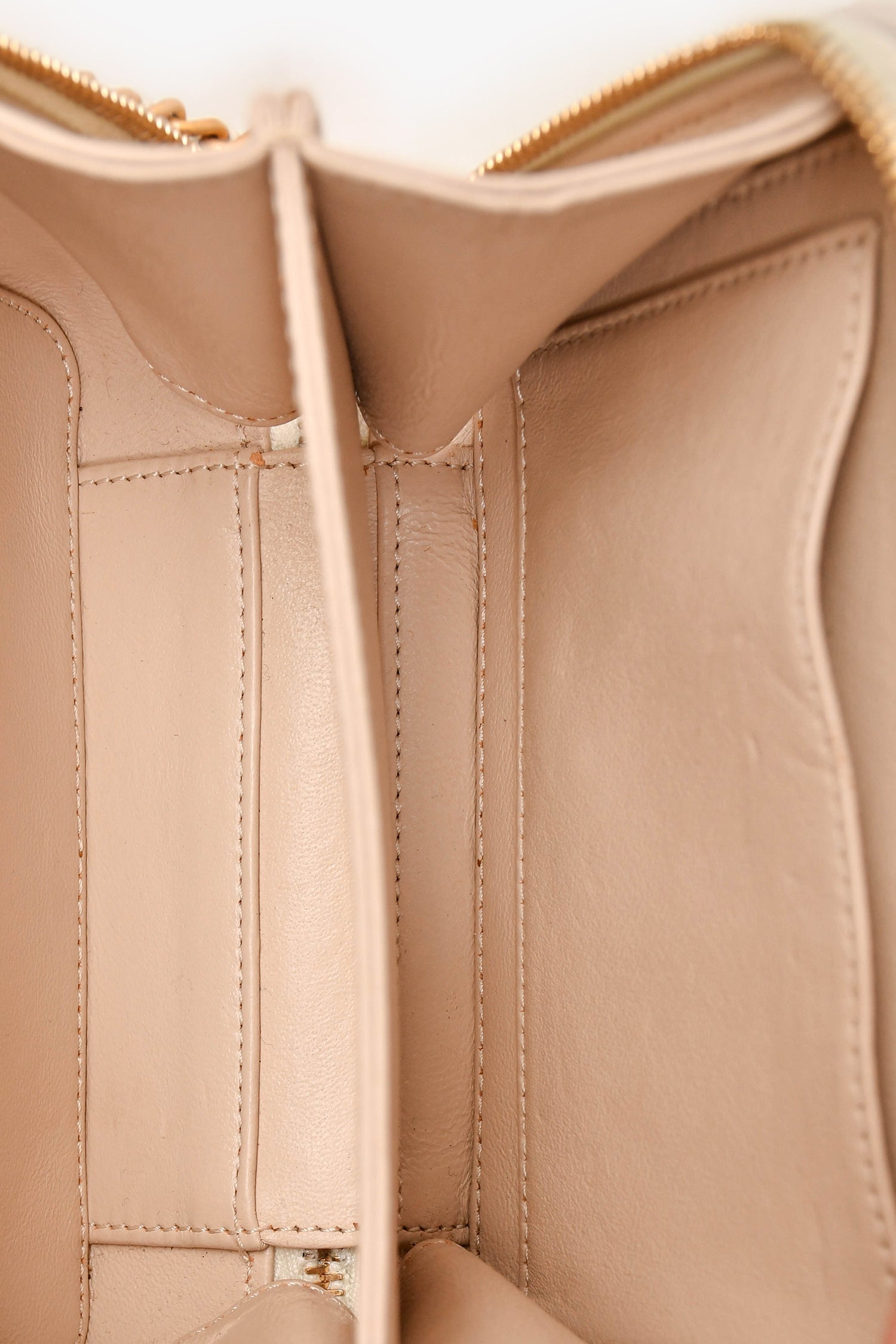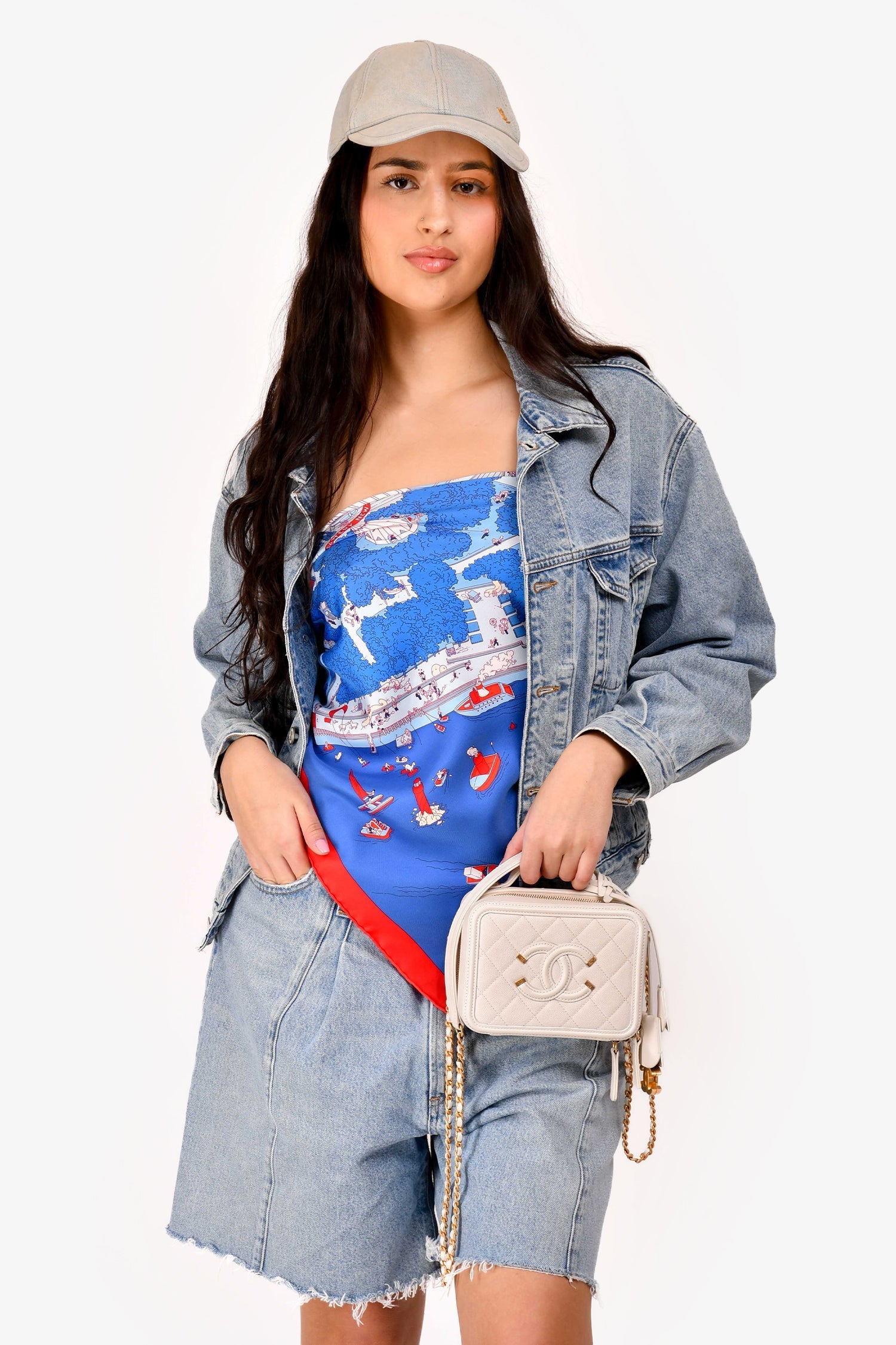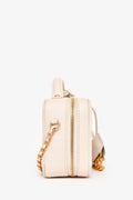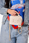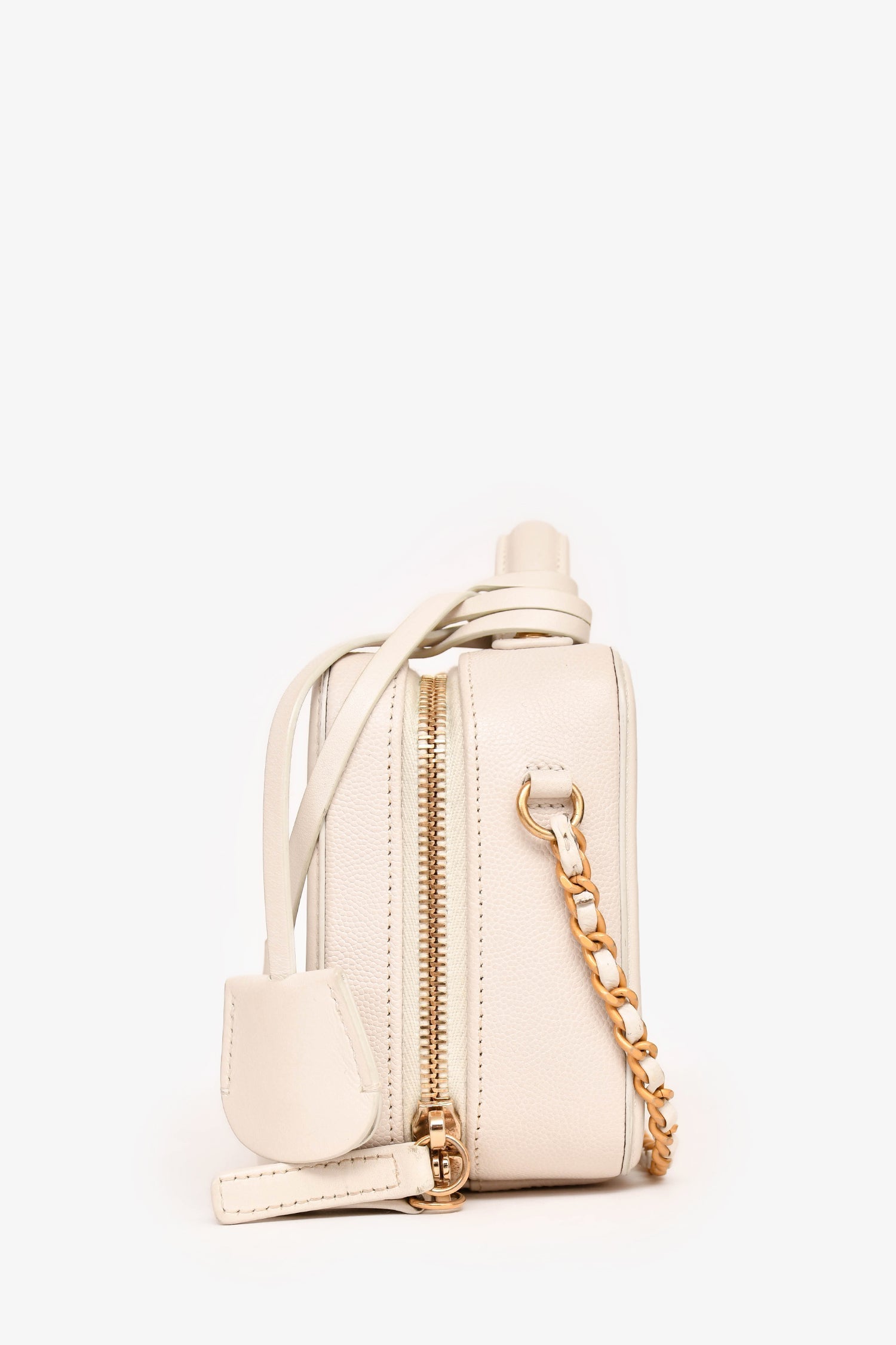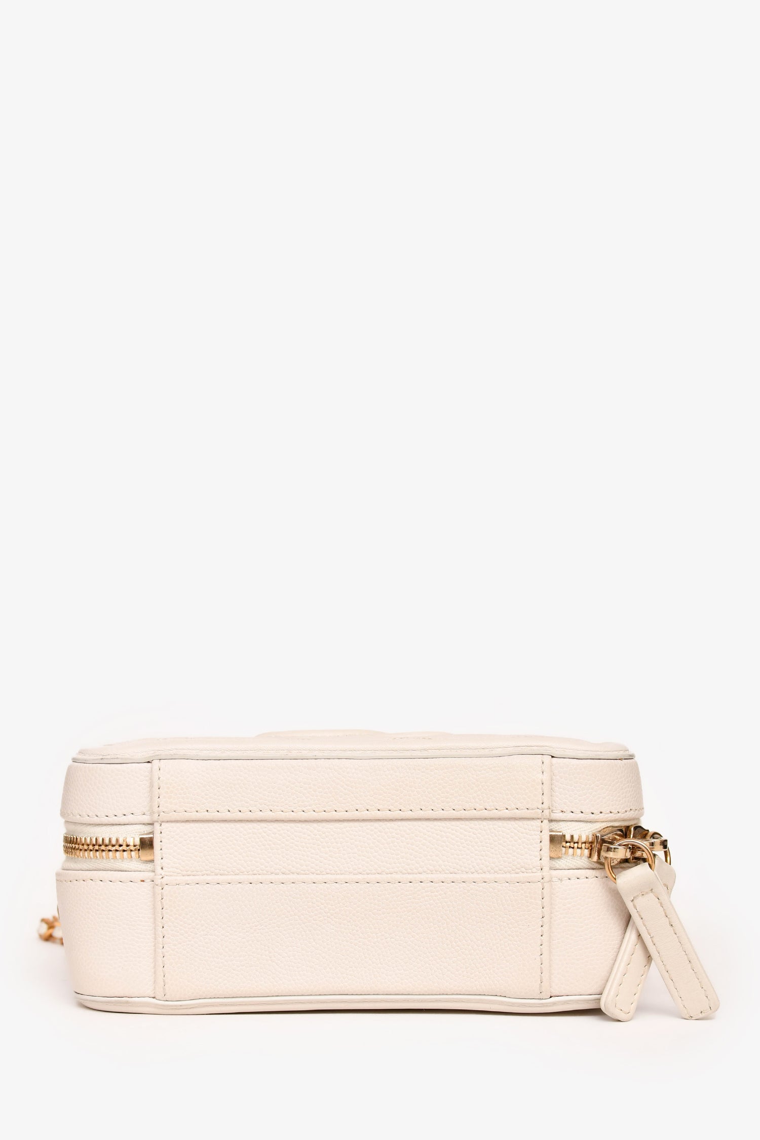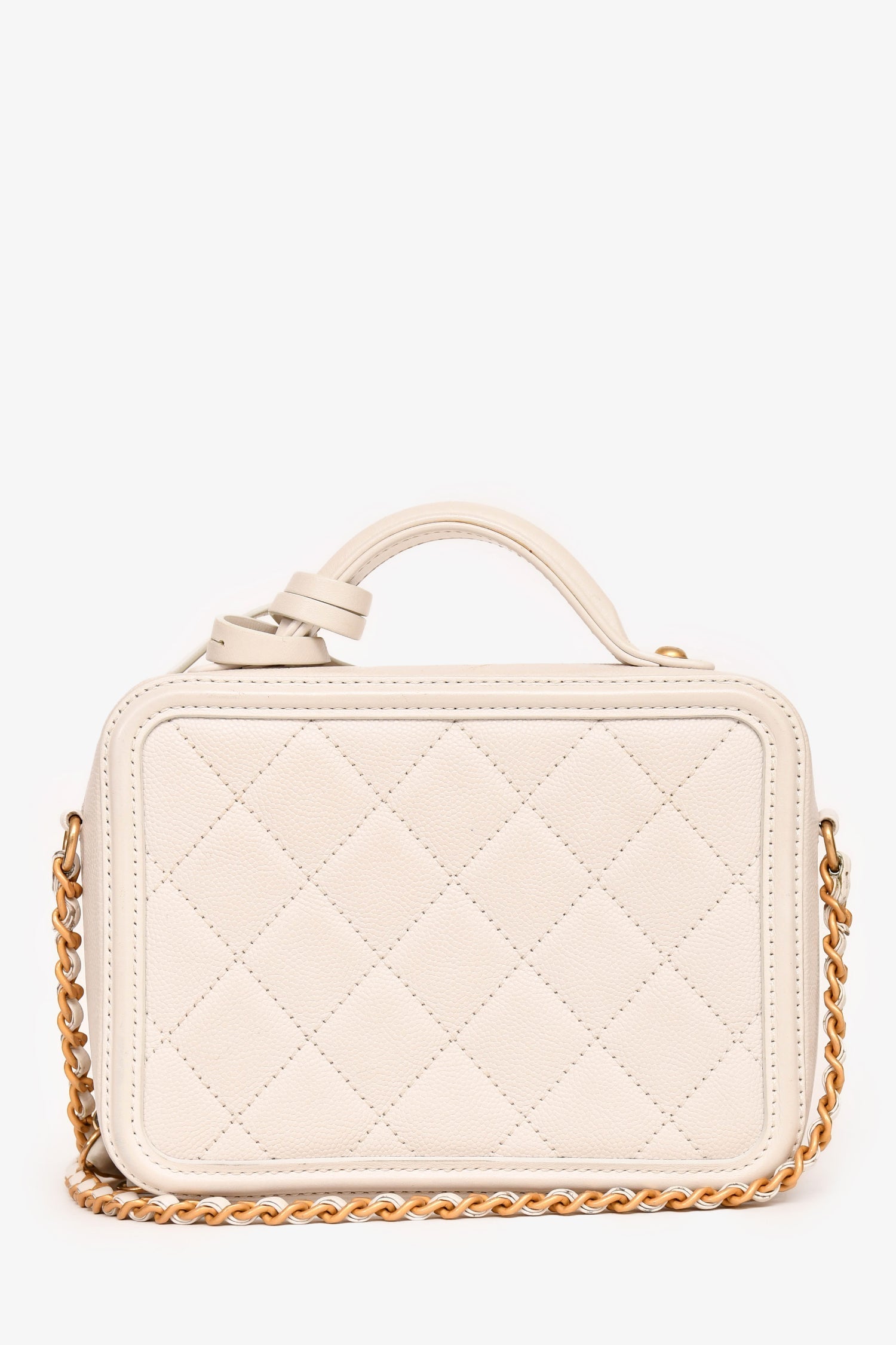 Pre-Loved Chanel™ 2017/18 Cream Caviar Leather Small Filigree Vanity Case. Gold-tone hardware. Chain-link and leather crossbody strap. Single top handle. 2 interior compartments. 1 wall pocket. 2 attached clochettes. Tonal stitching.