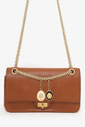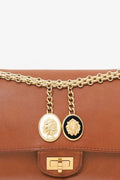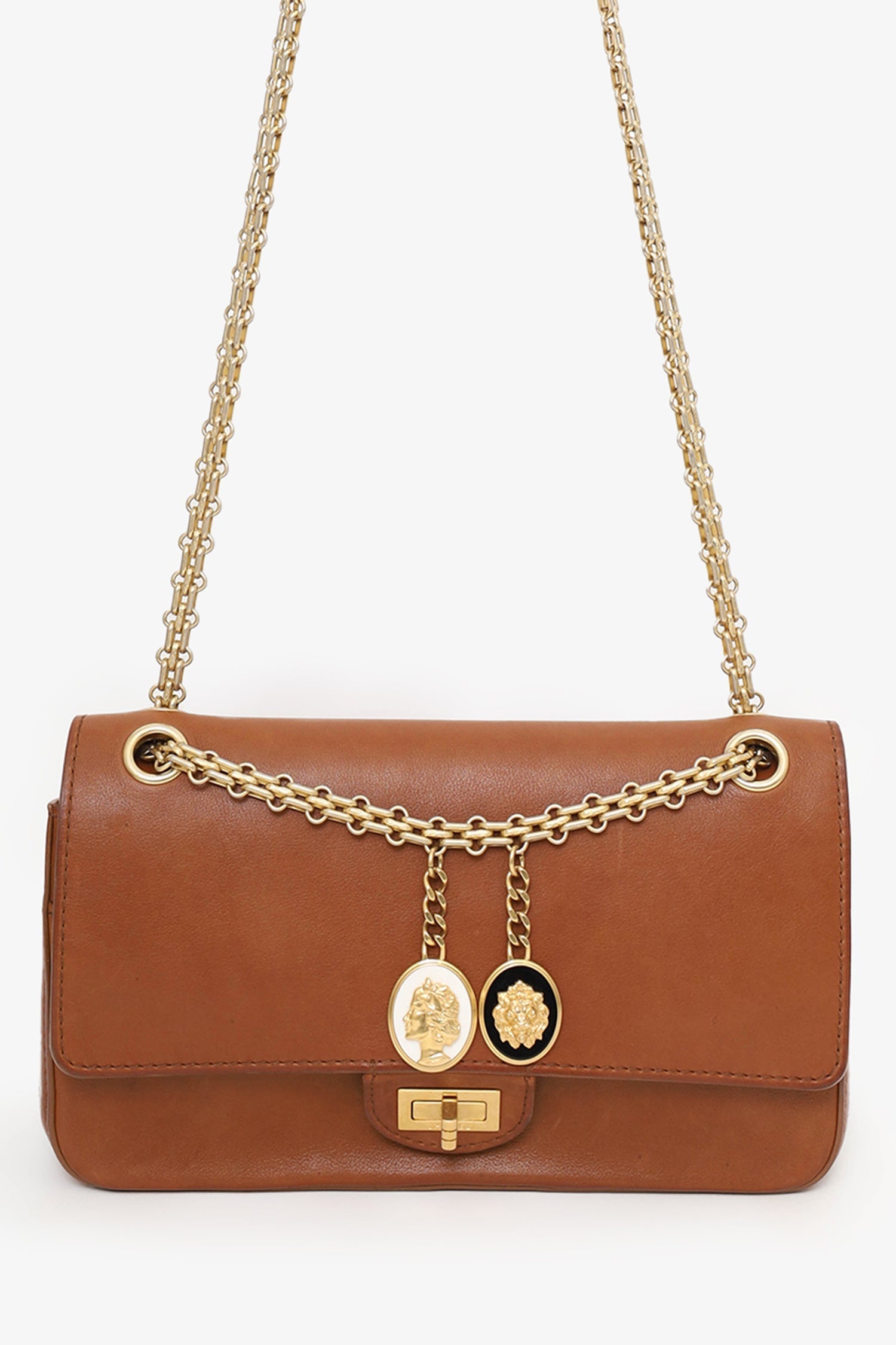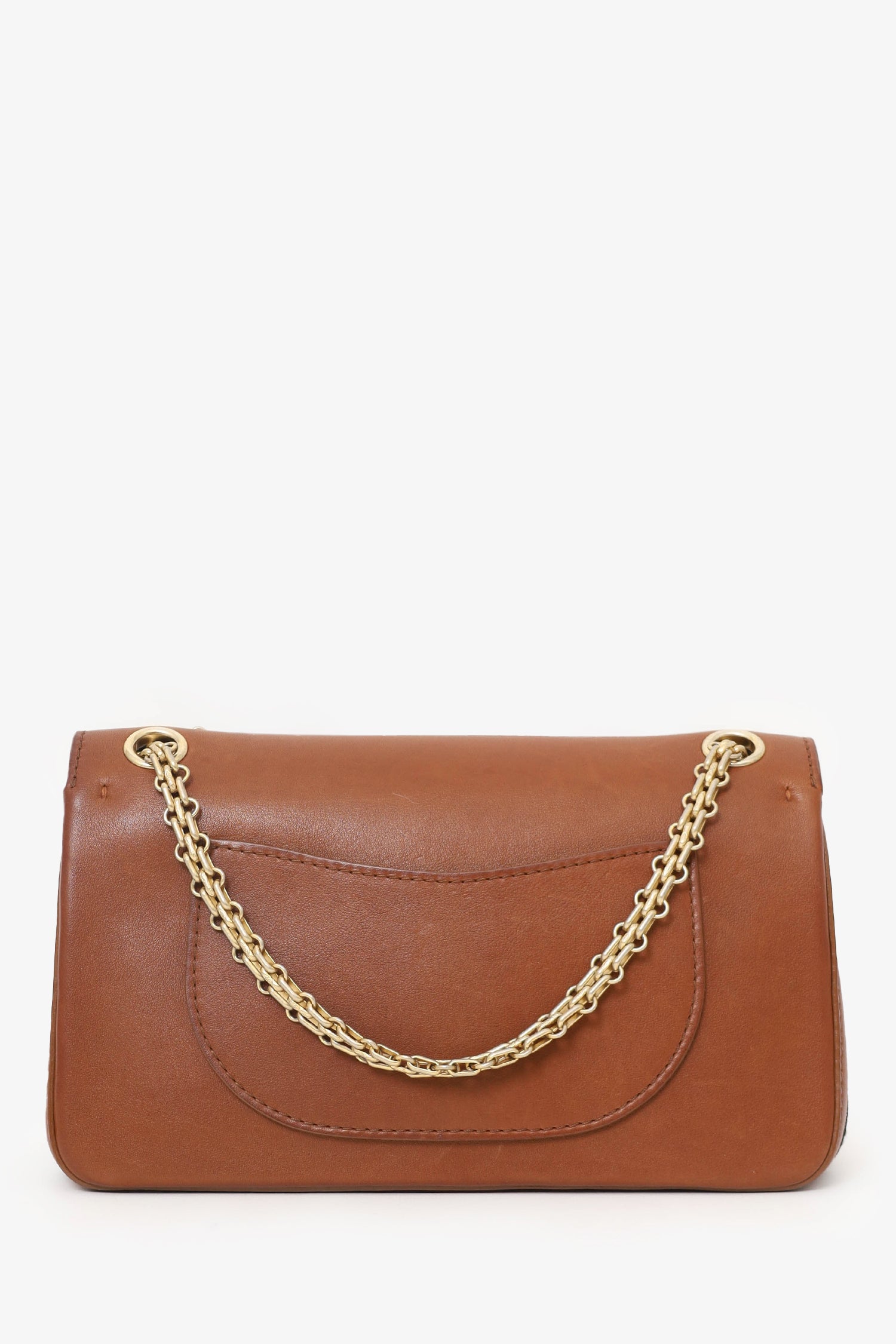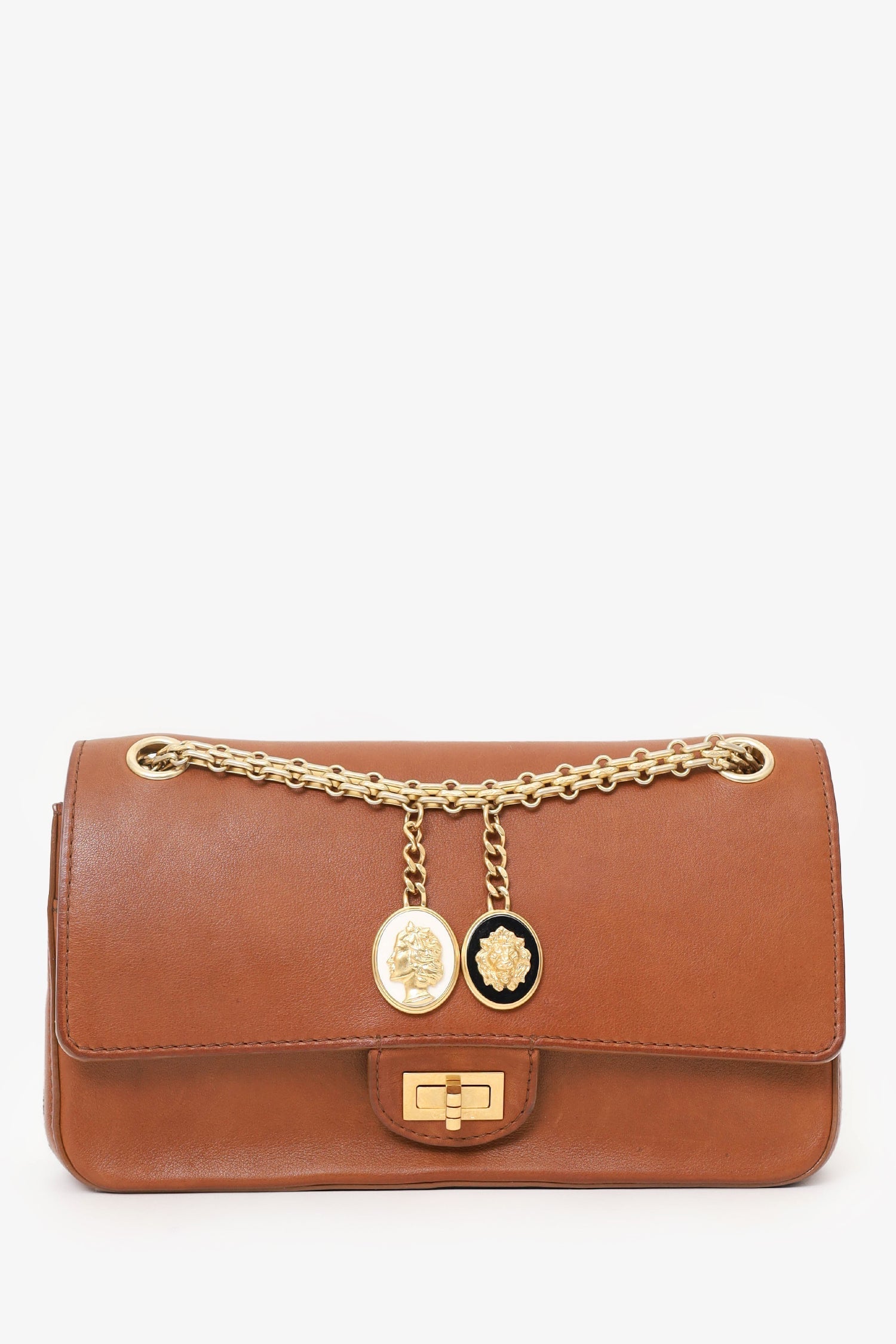 Pre-Loved Chanel™ 2017 Brown Leather Medallion Charm Reissue 2.55 Shoulder Bag. Top double fold-over flap with turn-lock and snap button closure. Double chain shoulder strap. Single rear slip pocket. Single front interior slip pocket. Interior main compartment with 2 slip pockets and 1 pen compartment. Gold-tone hardware. Tonal stitching.
