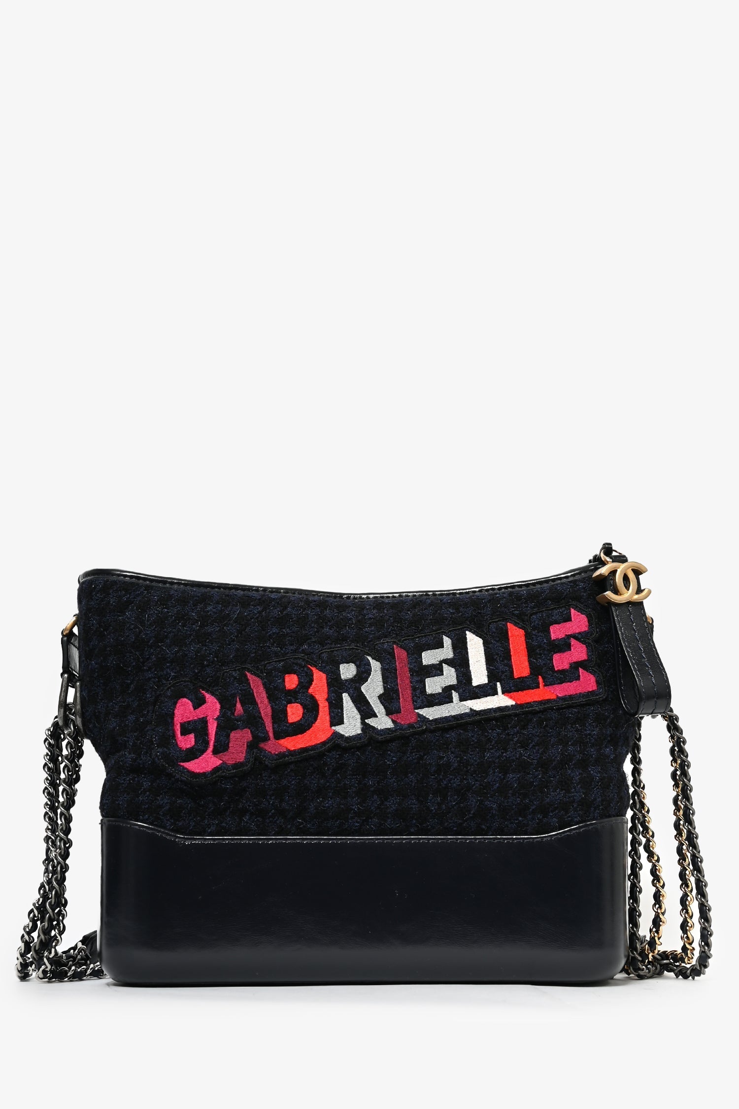 Pre-loved Chanel™ 2017 Navy/Black Tweed Hobo Large Gabrielle Crossbody Bag. Single gold/silver-tone and antiqued silver-tone crossbody straps. Leather trimming. Tweed outer. Upper zipped top. Lined interior with a zipped compartment and 2 pockets. Tonal stitching.