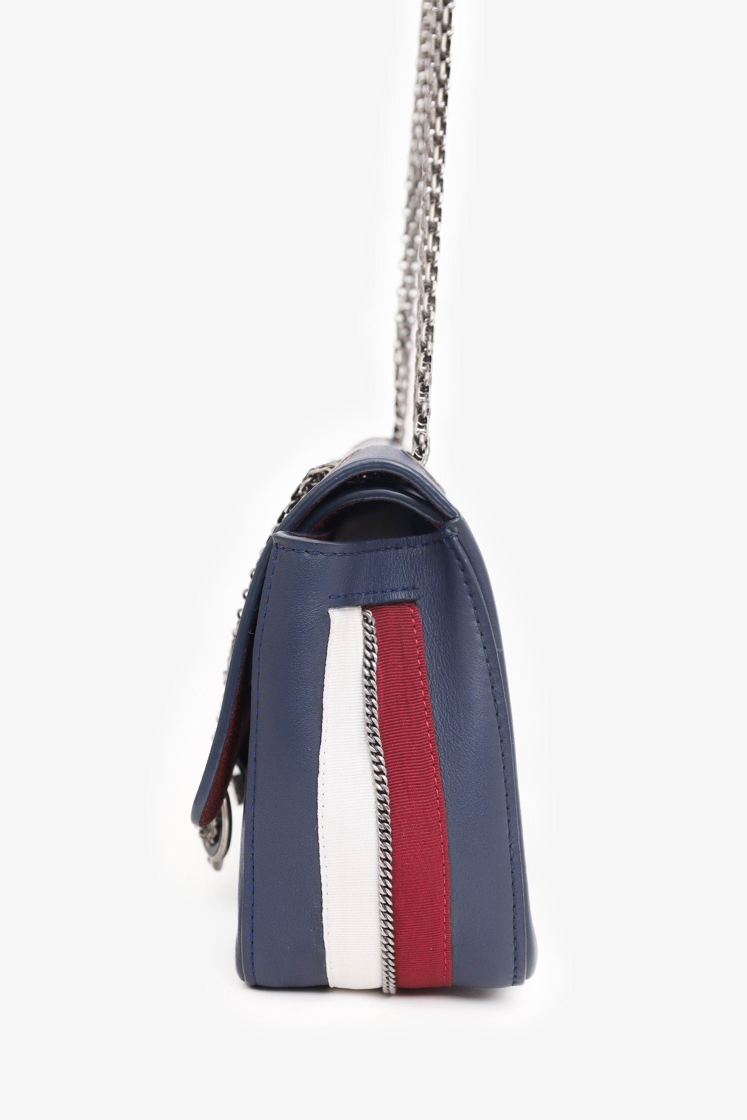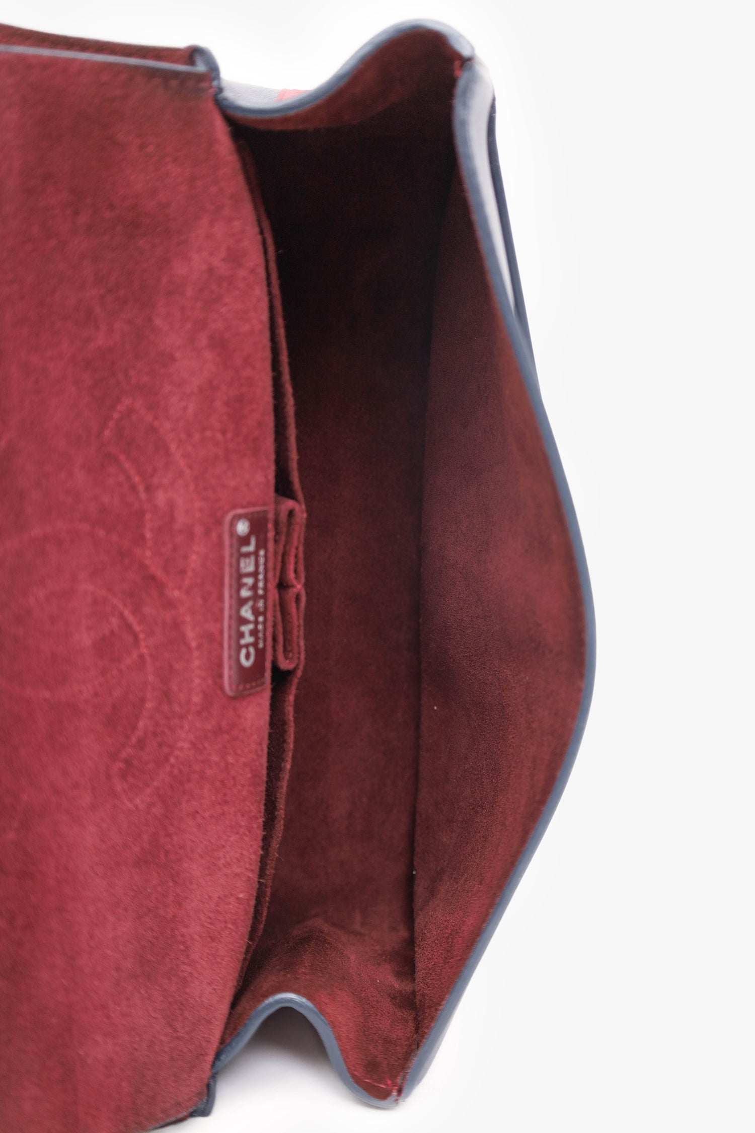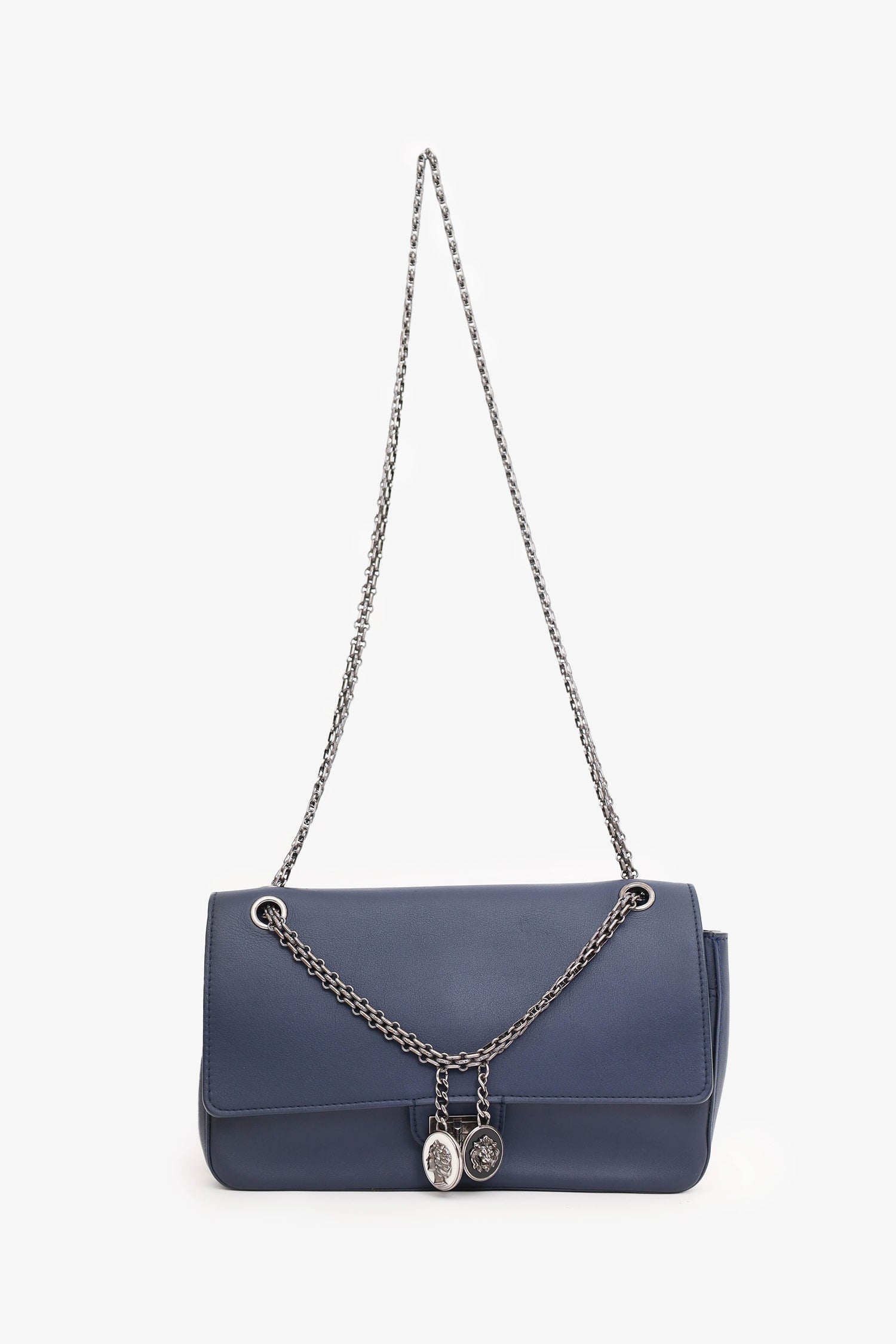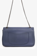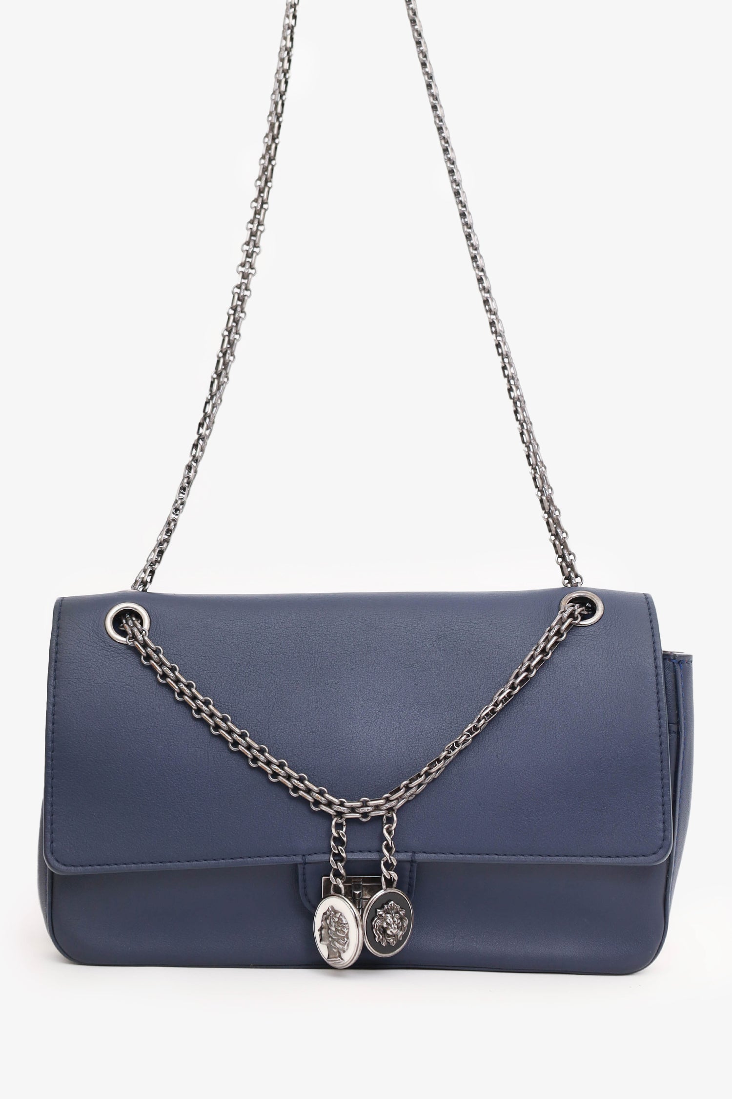 Pre-Loved Chanel™ 2017 Navy Leather Medallion Charm Reissue 2.55 Shoulder Bag. Top double fold-over flap with turn-lock and snap button closure. Double chain shoulder strap. Chain detail across bottom and sides. Single rear slip pocket. Single front interior slip pocket. Interior main compartment with 2 slip pockets and 1 pen compartment. Rear interior slip compartment. Silver-tone hardware. Tonal stitching.