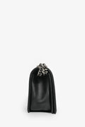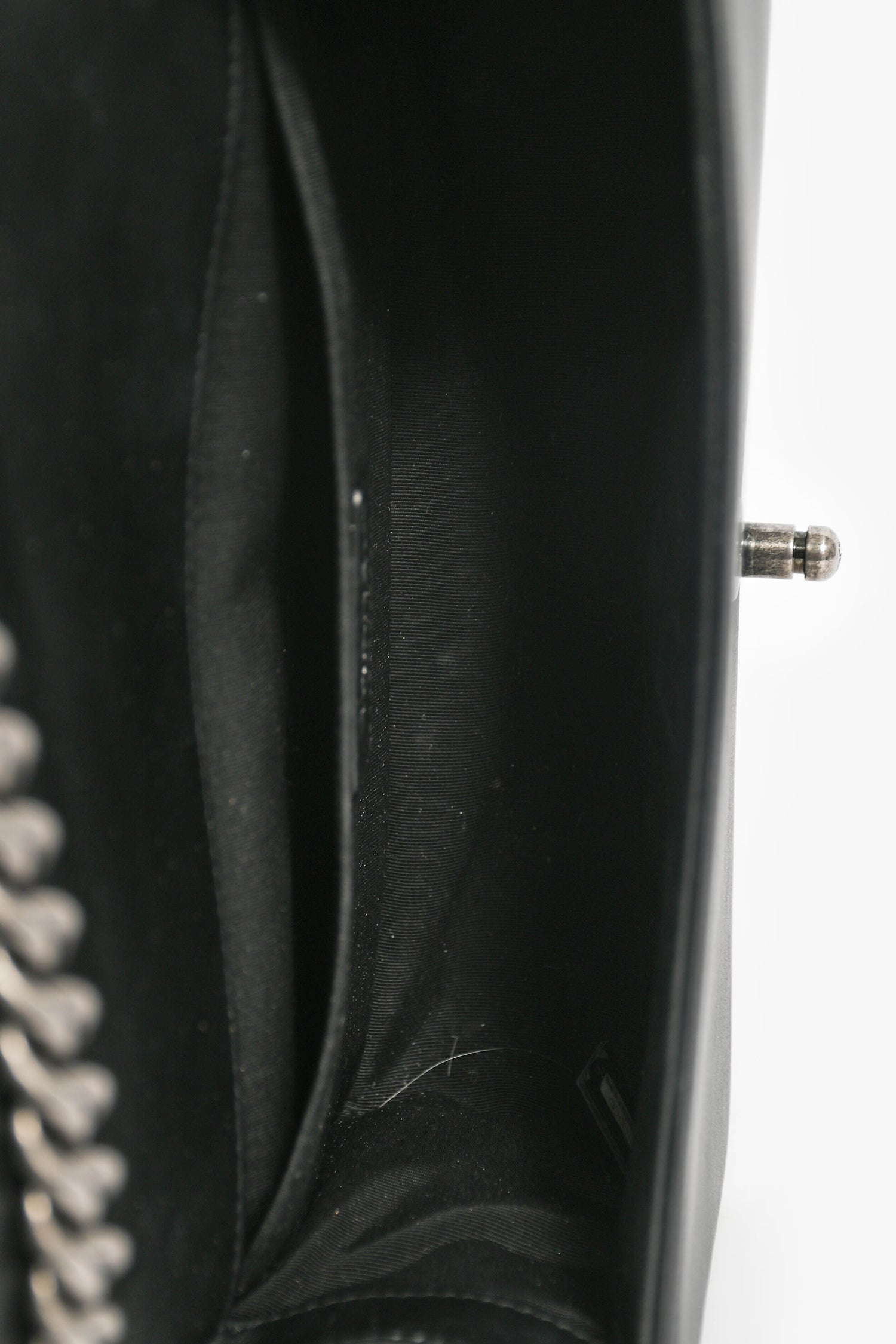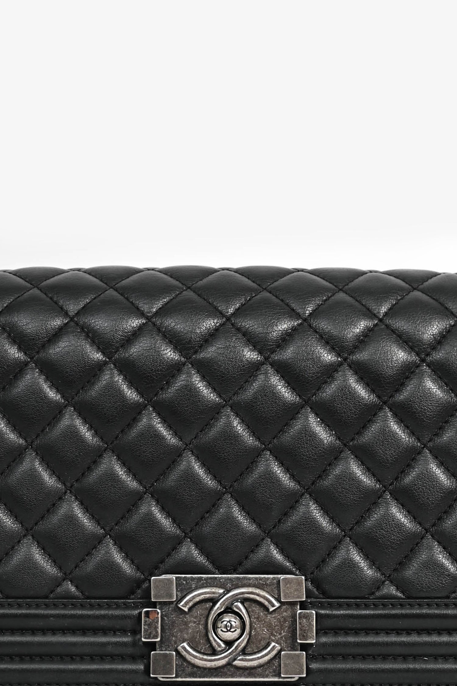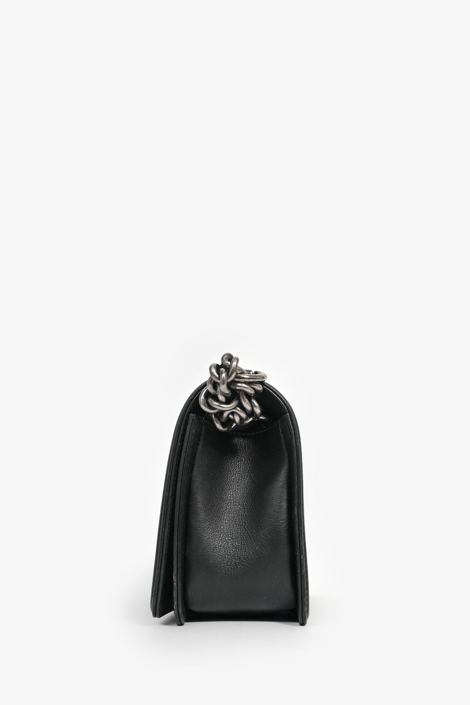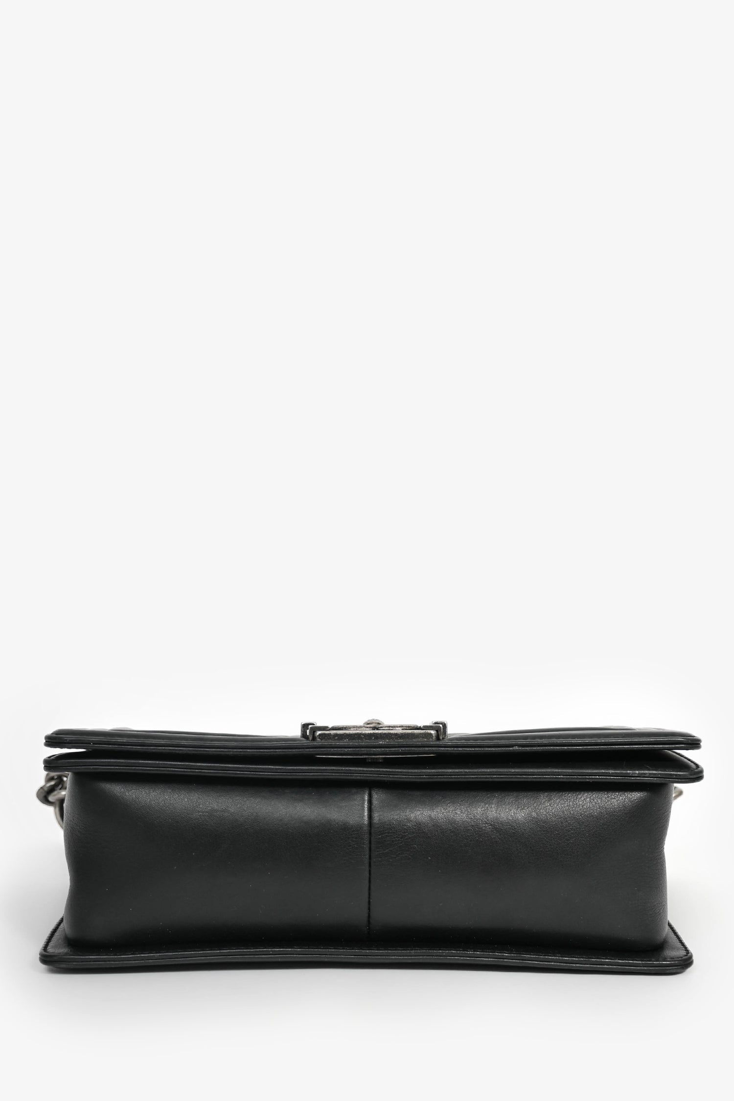 Pre-Loved Chanel 2019 Black Leather Medium Boy Bag. Fold-over flap with a push-lock closure. Antiqued silver-tone hardware. Chain-link crossbody strap. Lined interior with a slip compartment. Tonal stitching.