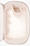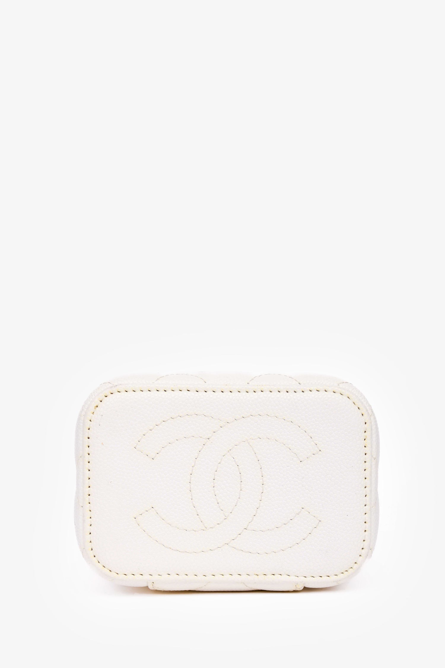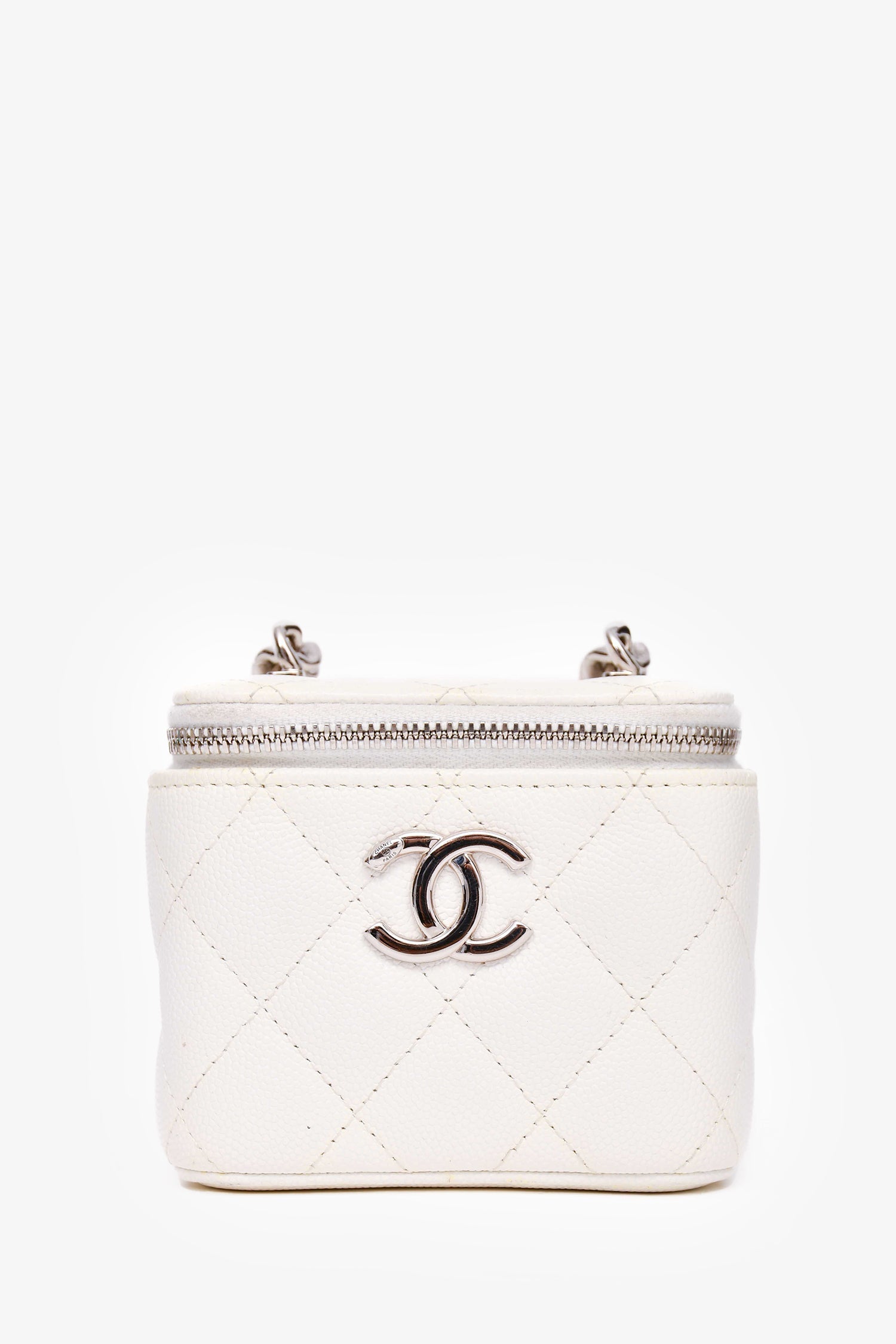 Pre-Loved Chanel™ 2022 White Caviar Leather Mini Vanity Case. Top zip closure. Interior mirror. Single interior lipstick slip compartment. Tonal textile interior lining. Silver-toned hardware. Tonal stitching.