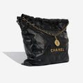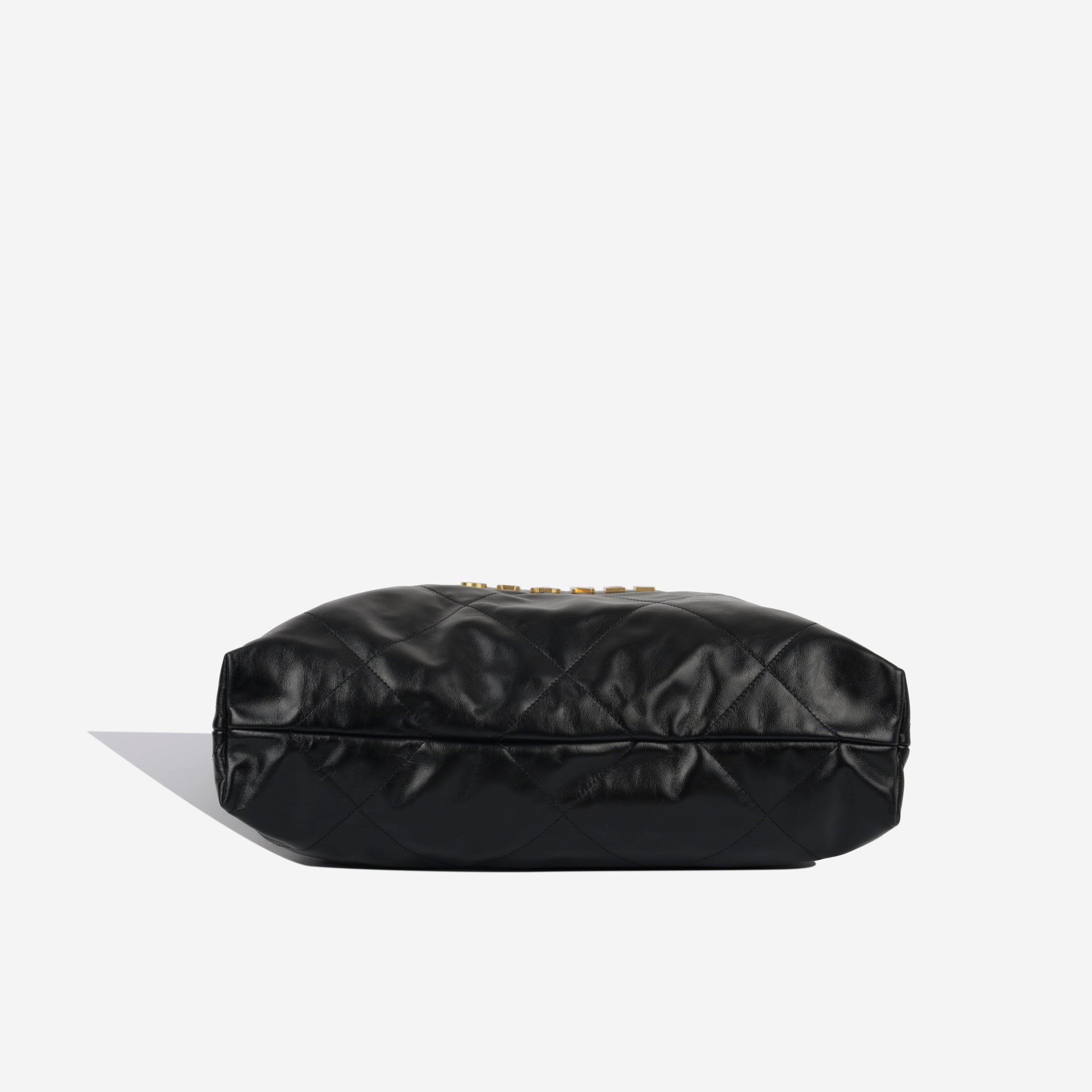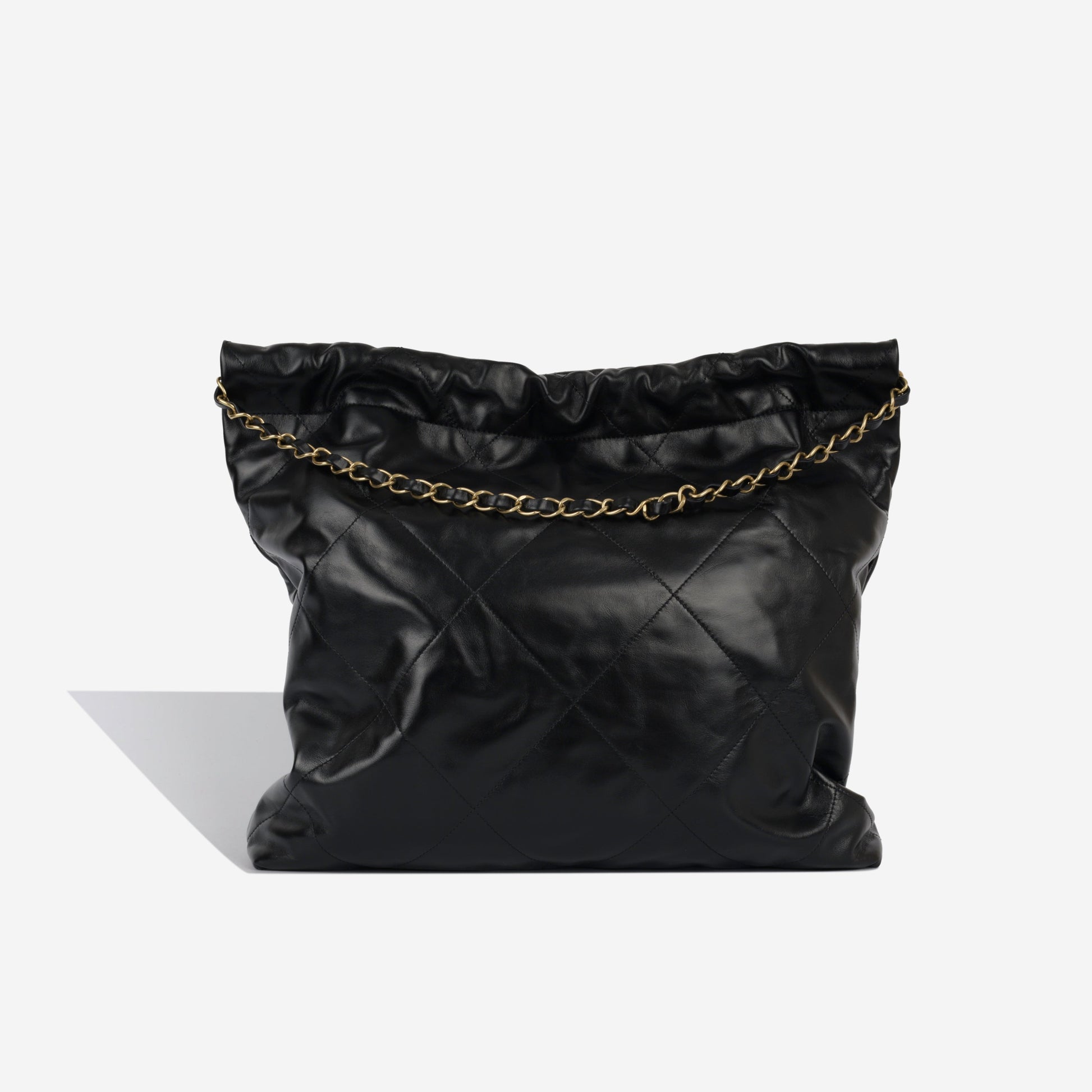 Carefully crafted from shiny calfskin leather, Chanel presents their 22 Tote bag. The chicest item for the lady that wants to carry everything around with them, this bag features Chanels classic interwoven back straps along with top handles to carry it handheld. This piece from 2022 is a well worthy addition to any luxury handbag collection.