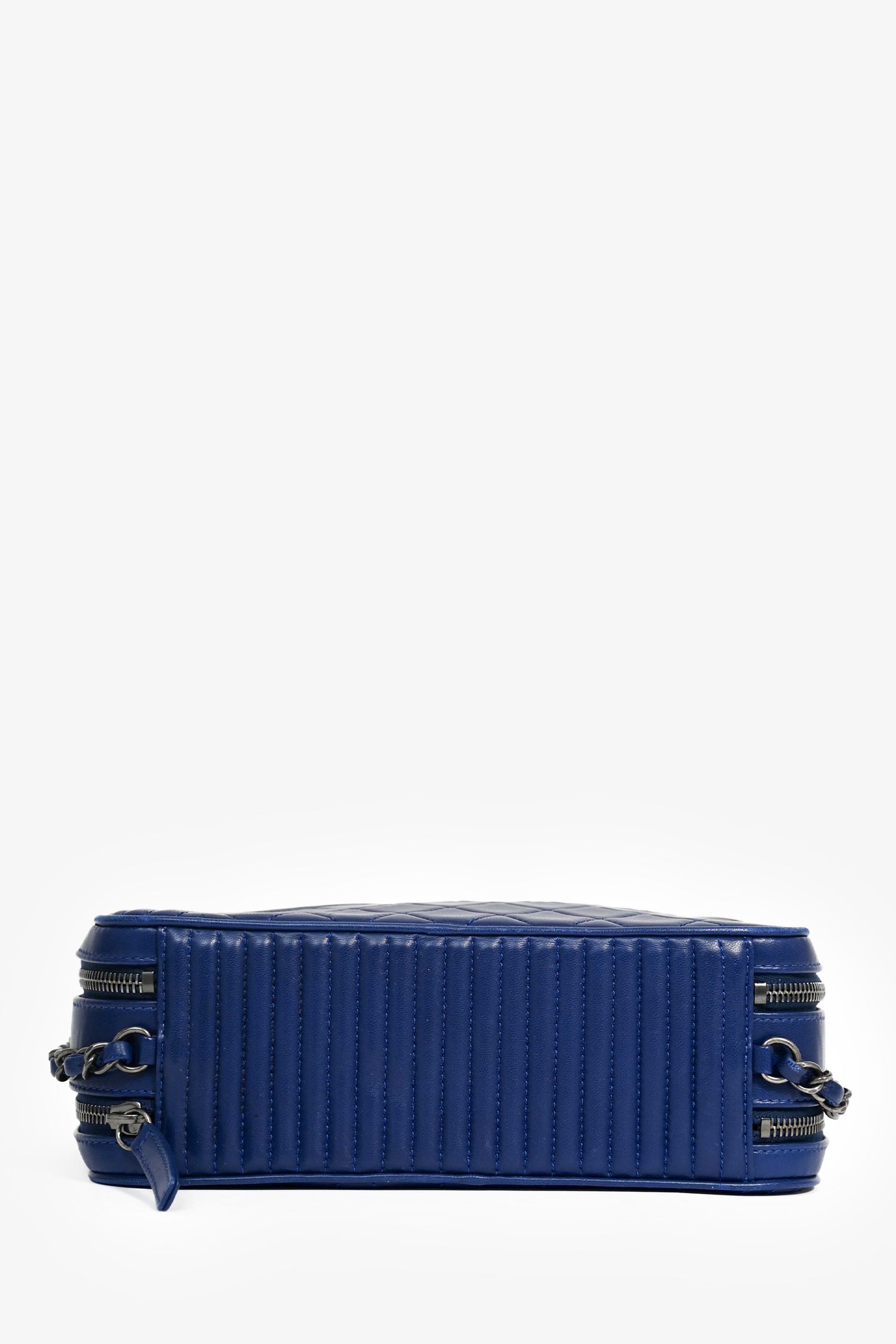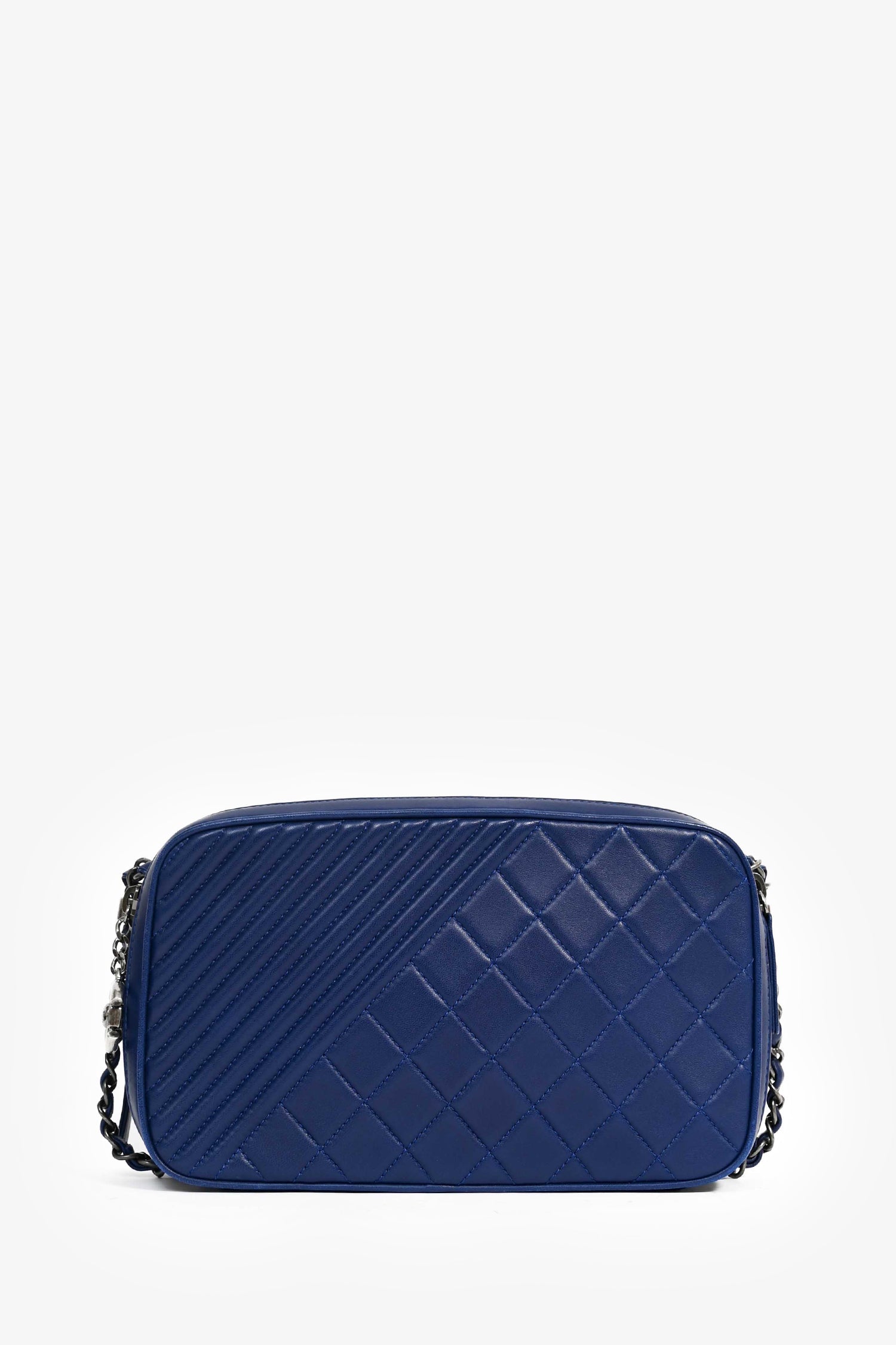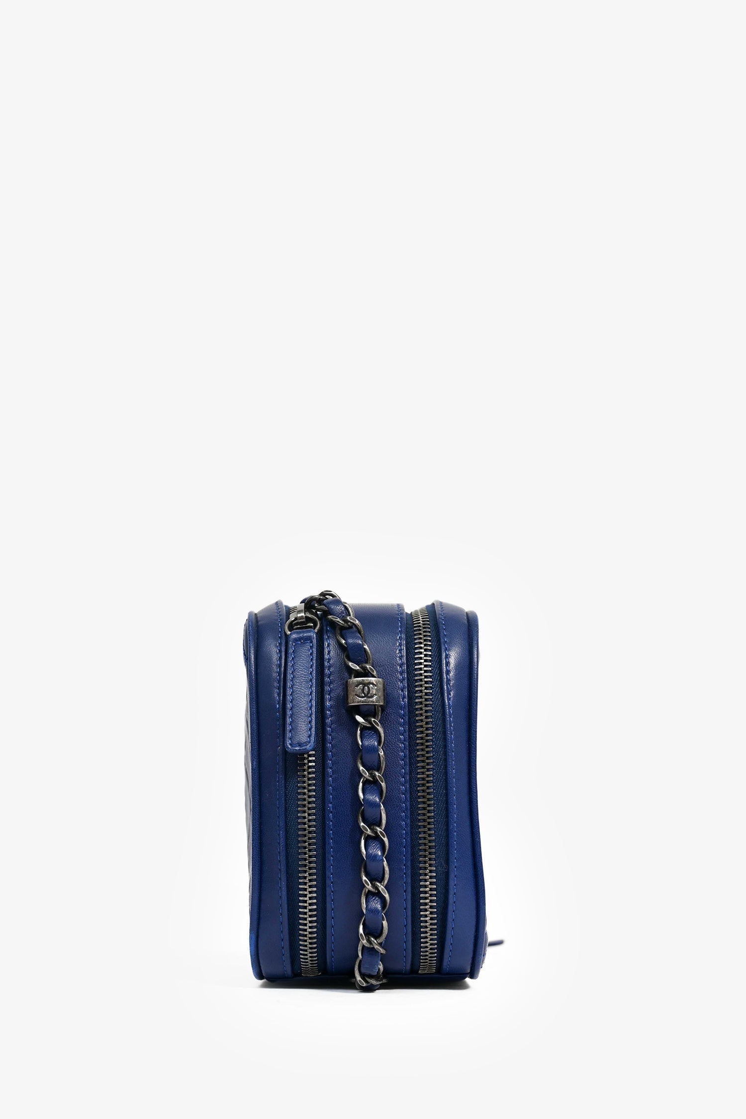 Pre-Loved Chanel™ Blue Leather Pewter Large CC Coco Camera Boy Bag. Top zipper closure. 2 compartments: one with a wall slip pocket, one with a wall zip pocket. Textile lining. Silver-tone hardware. Tonal stitching.