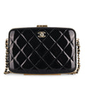 Crafted from black patent leather and accentuated with gold hardware, this box clutch on chain is fresh from 2021. This bag has a vintage feel and eludes a classy and elegant aesthetic. Small enough to fit in your bare essentials, this is the perfect bag for the evening.