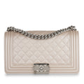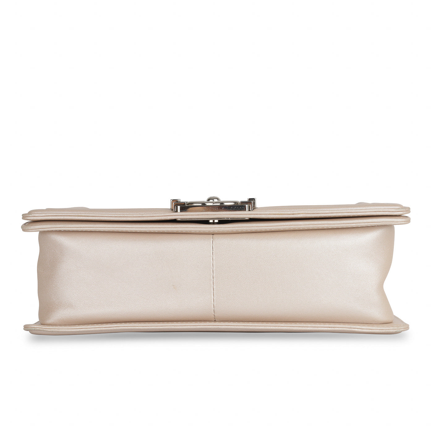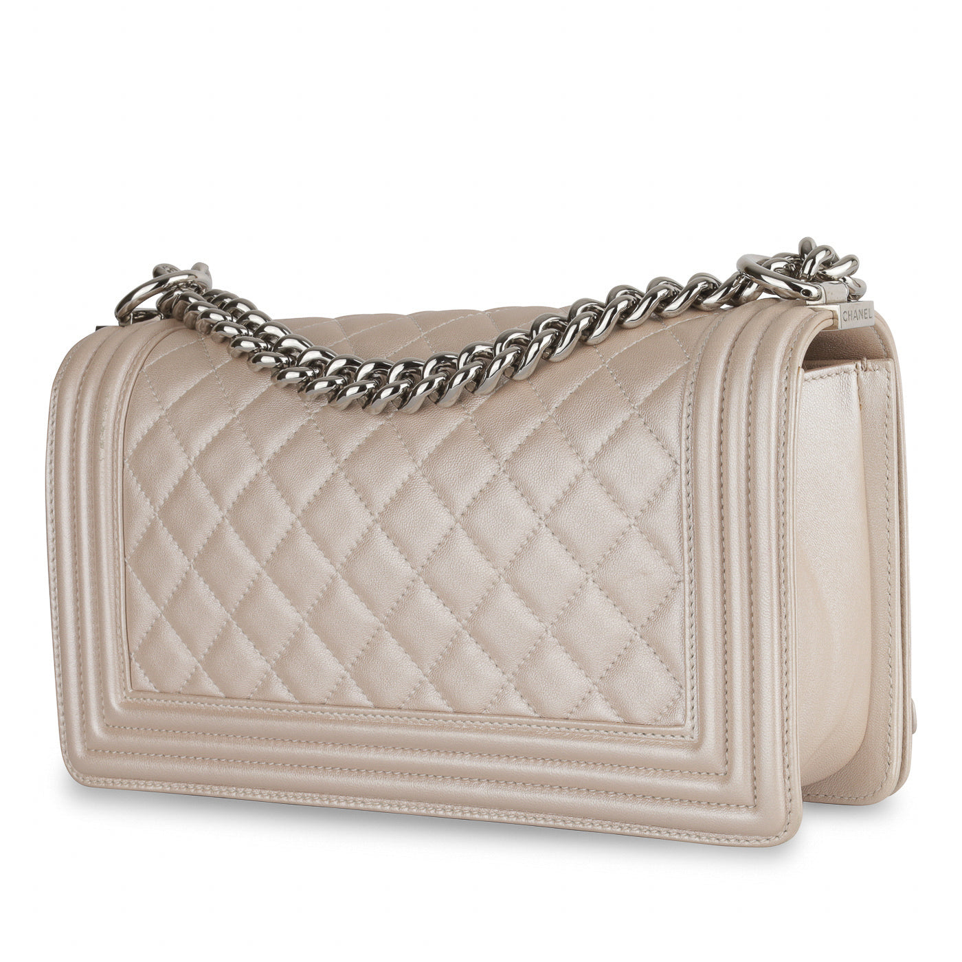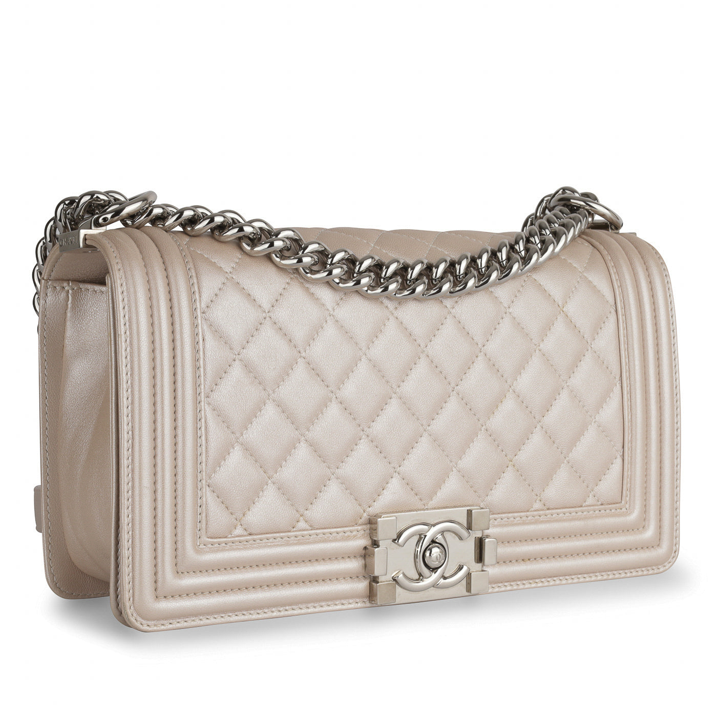 As designed by Karl Lagerfeld, the Boy Bag collection was established to embody boyish charm and femininity. This beautiful handbag is crafted from pearlescent pink calfskin leather. Its charm is accented through silver hardware from the chain-link strap and the signature CC push lock.