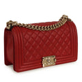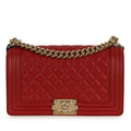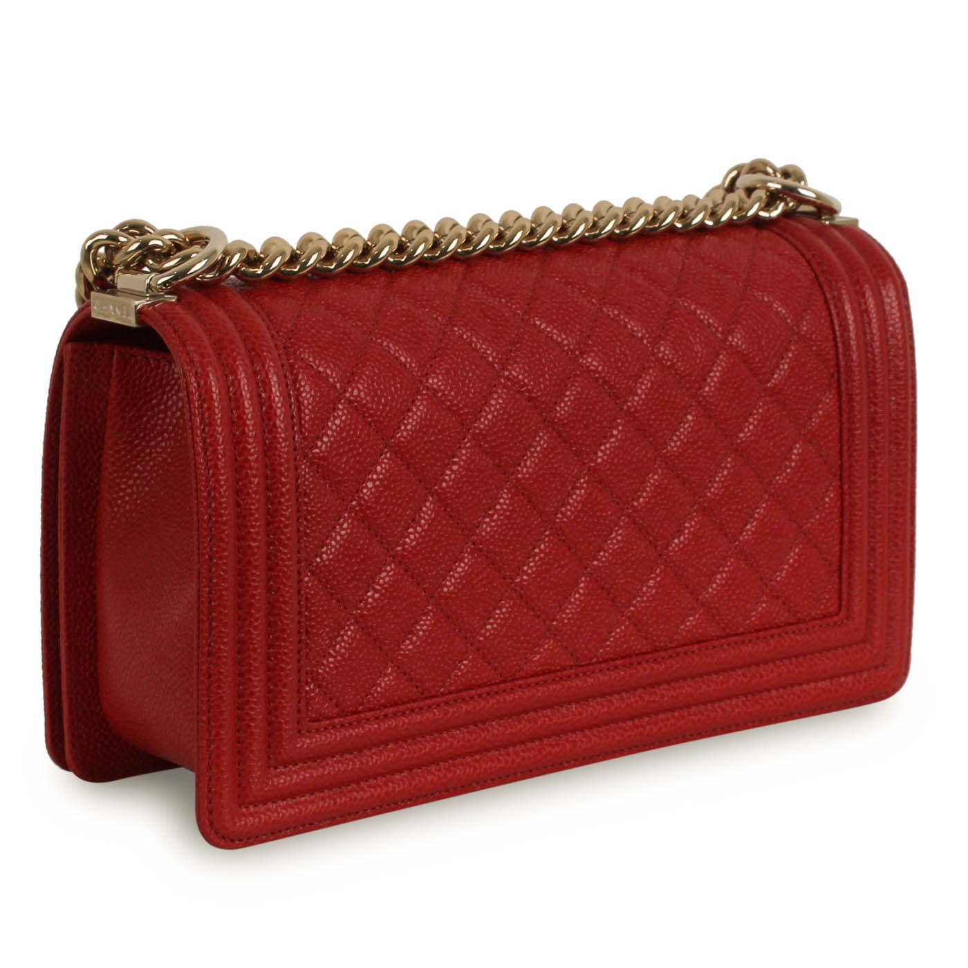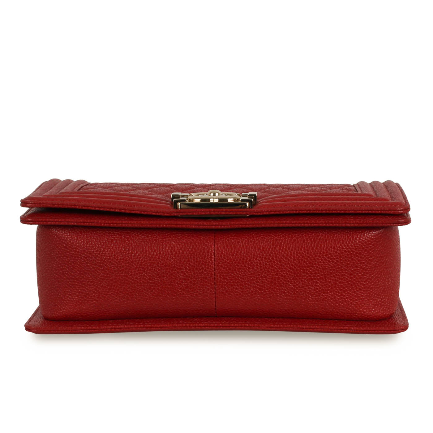 Chanel presents one of its highly-acclaimed and most sought after bags, the Chanel Boy Bag in size Old Medium in the wonderful and limited combination of bright red caviar leather and champagne gold hardware. As designed by Karl Lagerfeld, the Boy Bag collection was established to embody boyish charm and femininity. This magnificent handbag is crafted from quilted caviar leather.
