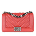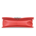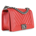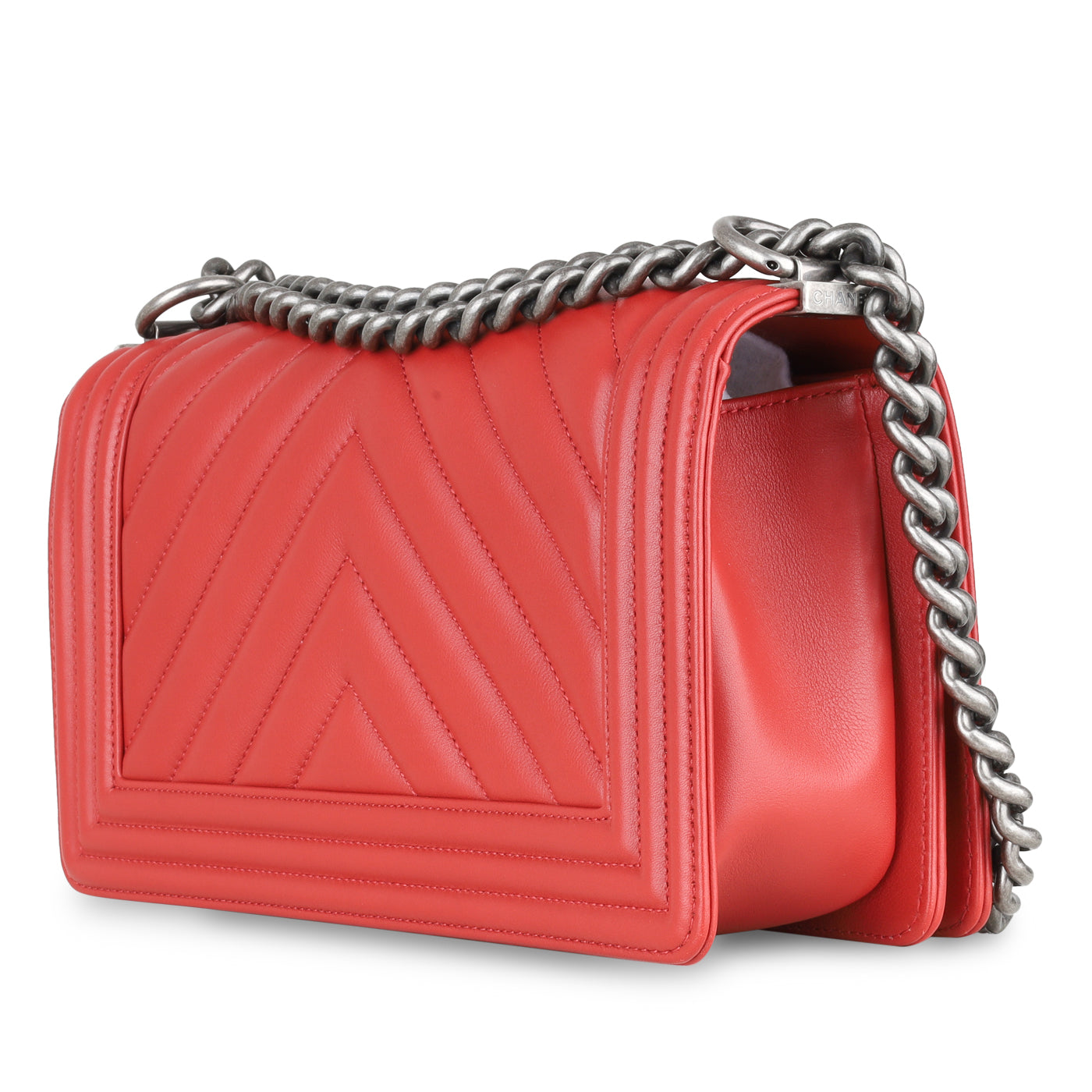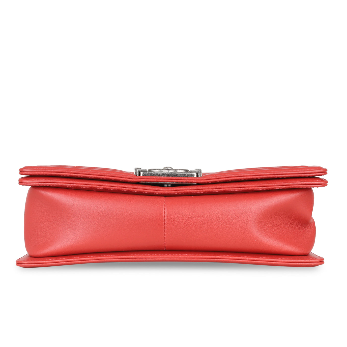 Chanel presents one of its highly-acclaimed and most sought after bags, the Chanel Boy Bag in size Old Medium in the wonderful and limited combination of bright red lambskin leather and ruthenium hardware. As designed by Karl Lagerfeld, the Boy Bag collection was established to embody boyish charm and femininity.
