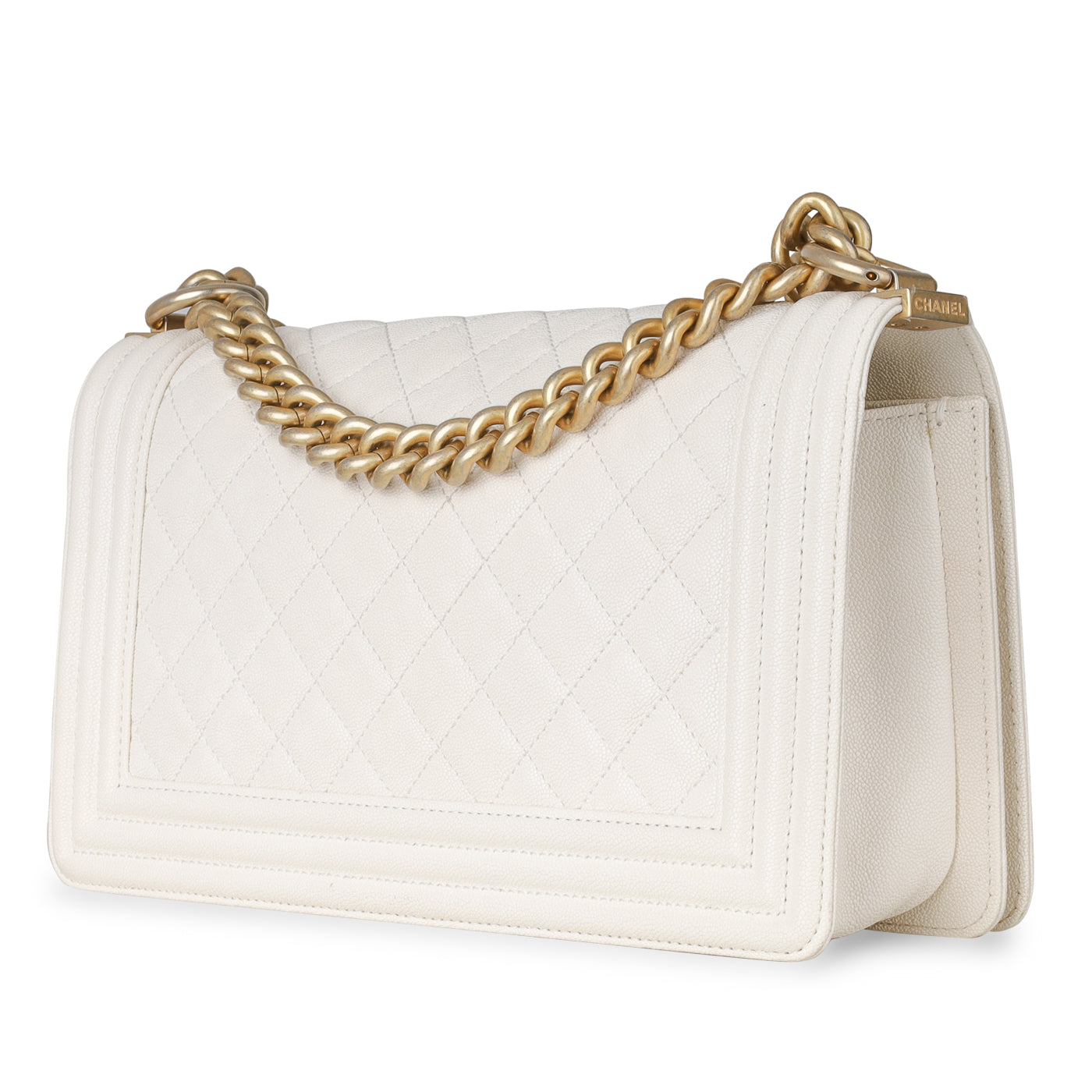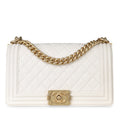 Chanel presents one of its highly-acclaimed and most sought after bags, the Chanel Boy Bag in size Old Medium in the wonderful and limited combination of White Caviar Leather and Champagne Gold Hardware. As designed by Karl Lagerfeld, the Boy Bag collection was established to embody boyish charm and femininity.