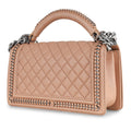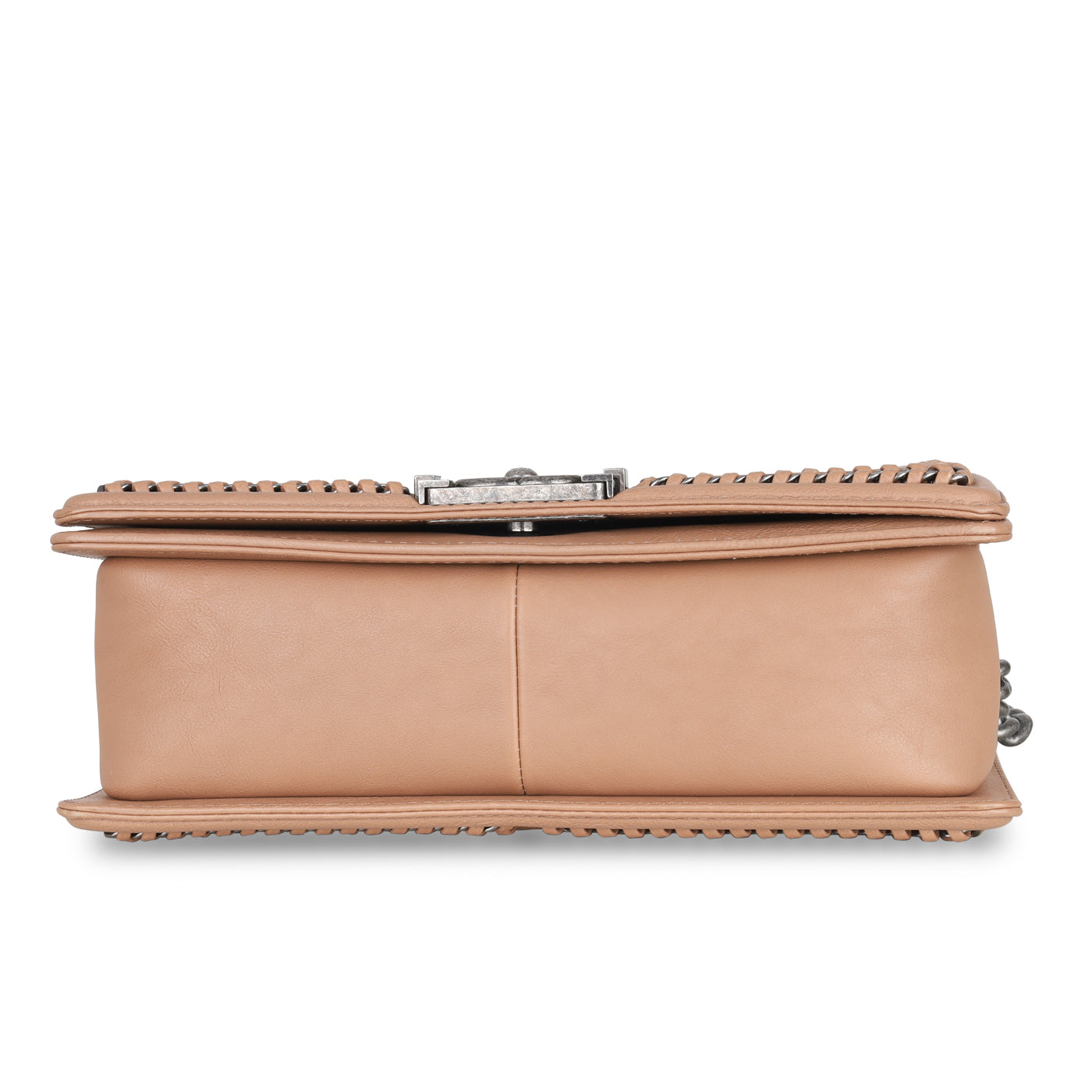 As designed by Karl Lagerfeld, the Boy Bag collection was established to embody boyish charm and femininity. This beautiful handbag is crafted from dark nude calfskin leather. Its charm is accented through ruthenium hardware from the chain-link strap and the signature CC push lock.