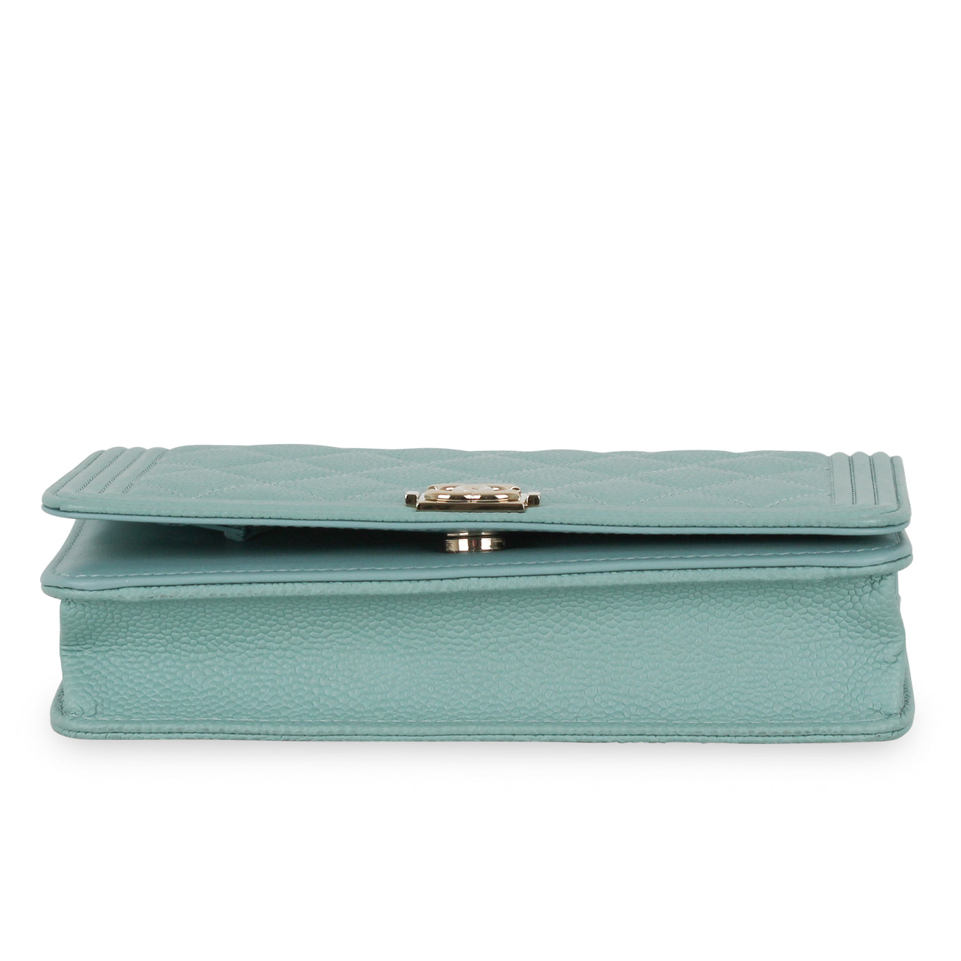 The Chanel Boy Wallet On Chain is one of the most highly acclaimed accessories from the brand. This particular piece is more or less the smaller version of the Boy bag. Sleek, stylish and sophisticated the WOC is a timeless accessory that you will have forever. Perfect for day-to-night usage, the Chanel WOC is for perfect accessory to hold all your small essentials. An easy, efficient bag you don't have to think about, this uber luxurious piece crafted from Tiffany Blue caviar leather, it is the ideal compliment to anything in your wardrobe. A true must-have for any woman with a love for luxury, this stunning little gem is a well-worthy addition to any handbag collection.