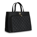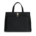 Crafted from durable caviar leather and depicted in classic black, the Chanel Business Affinity Tote is the perfect every-day bag for the busy, city-living woman with a lot to carry. Luxurious, practical and effortlessly chic, this Chanel shopper features an interwoven chain / leather shoulder strap, two top handles, a large front pocket (perfect for an iPad) and a spacious interior compartment that can easily hold books, a laptop, binders, papers and everything else you may need.